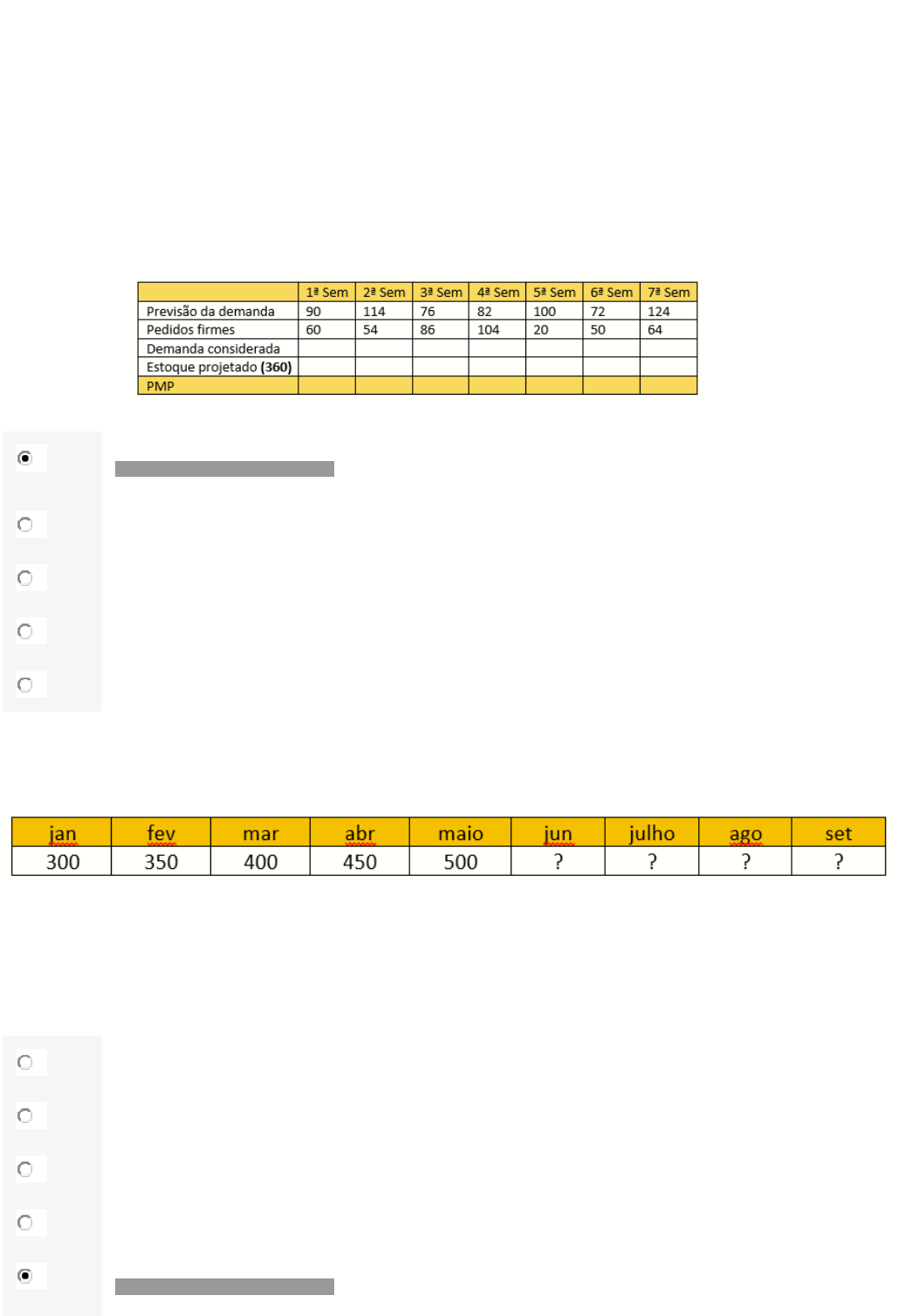 Disciplina(s): APOL OBJETIVA 1 (REGULAR) NOTA : 90 Planejamento, Programação e Controle da Produção Questão 1/10 - Planejamento, Programação e Controle da Produção O PMP se diferencia do Plano de produção pelo nível e agregação dos produtos e pelo período de validade do planejamento. Enquanto o Plano de Produção trabalha com meses até semestres, o PMP é mais imediato quanto ao tempo, trabalhando com semanas, normalmente. Assim num caso qual se tem as informações para se construir um Plano Mestre de Produção, obedecendo as políticas de produção imposta que se segue: 1. Tem- se a demanda prevista para sete semanas; 2. Pedidos firmes; 3. Estoque projetado (estoque inicial) 4. O tempo de fabricação do produto que é de uma semana e 5. Política de produção para esse cenário: fazer uma produção que acompanhe a demanda; não ter lote mínimo de produção, o estoque de segurança pode ser zero. Para a política de produção citada no item 5, qual deve ser o resultado do Plano mestre de Produção para cada uma das sete semanas, com os dados disponíveis na tabela a seguir Após elaborar o PMP com os dados da tabela é correto o que se afirma em A PMP para sem 1 = 0; sem 2 = 0; sem 3 = 0; sem 4 =34; sem 5 = 100; sem 6 =72 e sem 7 = 124 Você assinalou essa alternativa (A) B PMP para sem 1 = 0; sem 2 = 0; sem 3 = 0; sem 4 =17; sem 5 = 50; sem 6 =72 e sem 7 = 124 C PMP para sem 1 = 0; sem 2 = 0; sem 3 = 0; sem 4 =17; sem 5 = 50; sem 6 =36 e sem 7 = 124 D PMP para sem 1 = 270; sem 2 = 156; sem 3 = 70; sem 4 =34; sem 5 = 100; sem 6 =72 e sem 7 = 124 E PMP para sem 1 = 270; sem 2 = 256; sem 3 = 70; sem 4 =17; sem 5 = 50; sem 6 = 36 e sem 7 = 62 Questão 2/10 - Planejamento, Programação e Controle da Produção Uma indústria de cimento levantou seu histórico de produção dos últimos 5 meses em toneladas/dia e pretende fazer a previsão das vendas para os três meses seguintes, junho, julho, agosto e setembro para poder ajustara sua programação de produção para esse período. Com os dados da tabela a seguir utilizando o método da regressão linear, determine as previsões para os meses de junho, julho, agosto e setembro. Com os cálculos realizados é possível afirmar que os valores corretos para os meses citados são I. Mês de junho a previsão será de = 550t/dia II. Mês de julho a previsão será de = 600t/dia III. Mês de setembro a previsão será de = 700t/dia IV. Mês de agosto a previsão será de = 650t/dia V. Mês de junho a previsão será de = 650t/dia É correto o que se afirma A I e II, apenas. B IV e V, apenas. C I, III e V, apenas D II, III, IV e V apenas. E I, II, III e IV, apenas. Você assinalou essa alternativa (E) Questão 3/10 - Planejamento, Programação e Controle da Produção O gerenciamento da produção é caracterizado como o esforço realizado dentro do sistema produtivo para alcançar as metas da organização por meio de planejamento, organização, execução e controle, sempre contando com a liderança eficaz dos envolvidos. (SANTOS, 2015) Fonte: SANTOS, Adriana de Paula Lacerda. Planejamento, Programação e Controle da Produção. p.14. InterSaberes: Curitiba, 2015. (Modificado) Fonte: Estrutura da figura (modificado) - https://slidesgo.com/faqs Em relação a cada uma das Funções da Gestão da Produção 1. Planejamento, 2. Organização, 3. Execução e 4. Controle que estão descritas a seguir I. Planejamento – nessa fase o gerente estabelece as metas do sistema produtivo e define o que os funcionários devem realizar para que elas sejam atingidas. II. Organizar – envolve designar pessoal e recursos para atingir metas. III. Executar – é a condução dos colaboradores pelo gerente a desempenhar seus trabalhos de forma eficiente. IV. Controle – possibilita, além de eventuais correções nas operações, identificar se o sistema produtivo está atingindo a meta previamente estabelecida na fase do planejamento. É correto o que se afirma em A I, II e III, apenas. B IV e V, apenas. C III e V, apenas. D I e II, apenas. E I, II, III, e IV. Você assinalou essa alternativa (E) Questão 4/10 - Planejamento, Programação e Controle da Produção Em relação ao sistema produtivo, as decisões gerenciais de planejamento, expostas na figura a seguir, são descritas como Planejamento Estratégico, Planejamento Tático e Planejamento Operacional, para que se alcance o que é desejado pela organização. Fonte: Estrutura da figura (modificado) - https://slidesgo.com/faqs Em relação a essas funções gerenciais, essas estão ligadas diretamente a um horizonte de tempo para cada planejamento, Estratégico, tático e Operacional, neste contexto analise as afirmativas a seguir: I. Planejamento Estratégico – as decisões tomadas são de longo prazo, quando são definidos o escopo e as metas a serem alcançadas pela organização; II. Planejamento Tático – neste nível, são selecionados e definidos quais e quantos recursos devem ser usados para alcançar as metas definidas pela organização, assim como a sua forma de aquisição e a organização adequada para a estruturação do trabalho; III. Planejamento Operacional – seleciona, em curto prazo, o curso das operações de produção necessárias para o alcance das metas; IV. Planejamento Tático – as decisões tomadas são em curto prazo, relaciona-se ao fazer imediato, onde são definidas pela organização o que e a hora de fazer para alcançar as metas de produção diárias. V. Planejamento Estratégico e Planejamento Tático – andam juntos no planejamento organizacional, pois o tático executa imediatamente o que foi proposto no planejamento estratégico. No que tange a essas afirmativas é correto o que se afirma em A I e II, apenas. B I, II e III, apenas. C II, III e IV, apenas. D III, IV e V, apenas. E I, II, III, IV e V. Você assinalou essa alternativa (E) Questão 5/10 - Planejamento, Programação e Controle da Produção O PMP se diferencia d