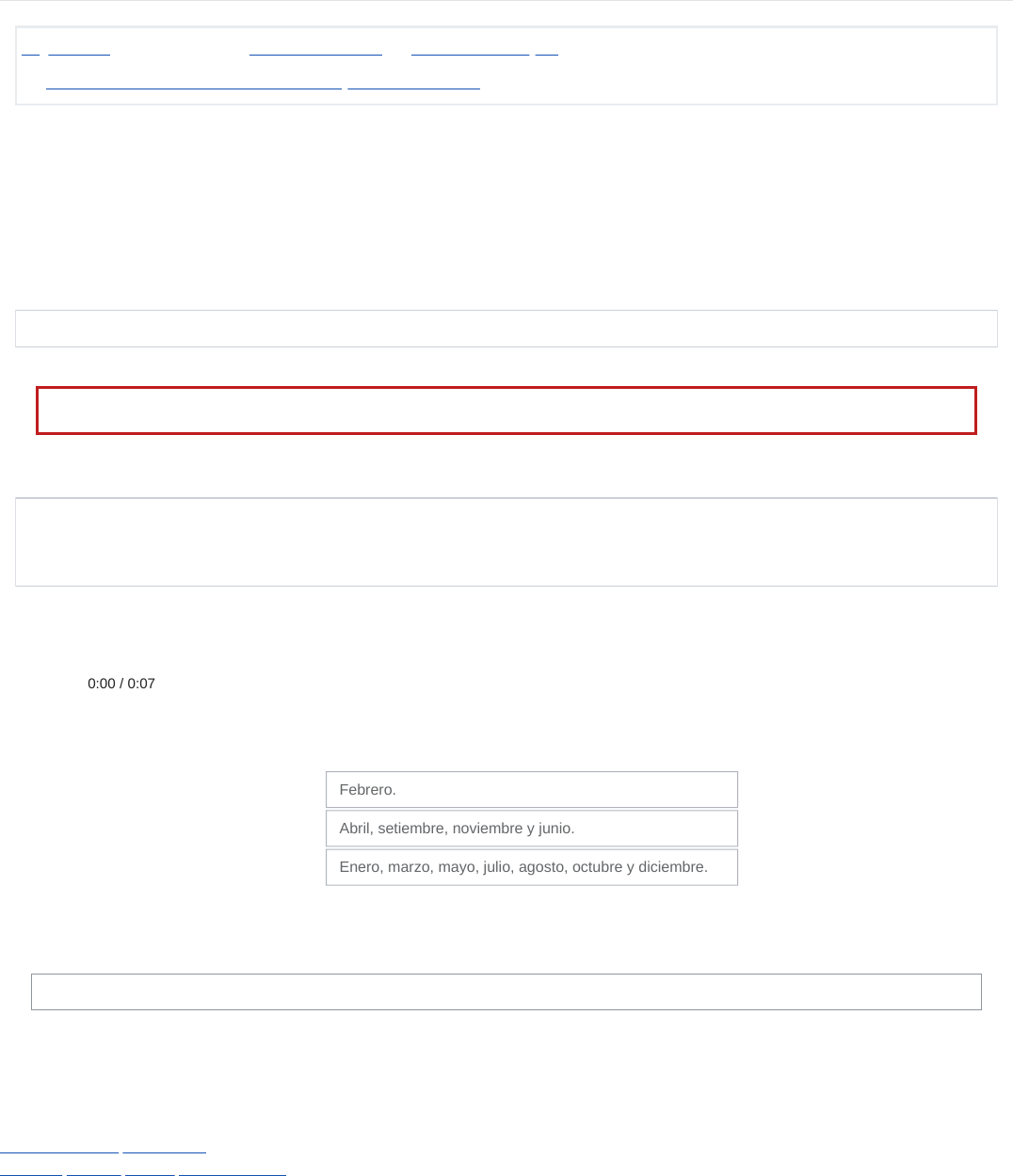 20/08/2023, 12:04 1.13 Teste seus conhecimentos: Los meses y estaciones del año: Revisão da tentativa https://aprendamais.mec.gov.br/mod/quiz/review.php?attempt=2429282&cmid=34587 1/1 Resumo de retenção de dados Obter o aplicativo para dispositivos móveis Página inicial / Meus cursos / ESPANHOL52023B / 1 Iré al salar de Uyuni / 1.13 Teste seus conhecimentos: Los meses y estaciones del año Iniciado em domingo, 20 ago 2023, 12:03 Estado Finalizada Concluída em domingo, 20 ago 2023, 12:04 Tempo empregado 51 segundos Notas 1,00/1,00 Avaliar 10,00 de um máximo de 10,00(100%) Informação Questão 1 Correto Atingiu 1,00 de 1,00 Escucha el audio y completa la información. Cuál es el mes que tiene 28 días? Cuáles son los meses que tienen 30 dias? Cuáles son los meses de 31 días? 0:000:00 / 0:07/ 0:07 Febrero. Abril, setiembre, noviembre y junio. Enero, marzo, mayo, julio, agosto, octubre y diciembre. ◄ 1.12 Las estaciones del año Seguir para... 1.14 Ubicándose: El Salar de Uyuni ► https://aprendamais.mec.gov.br/admin/tool/dataprivacy/summary.php https://download.moodle.org/mobile?version=2020110904&lang=pt_br&iosappid=633359593&androidappid=com.moodle.moodlemobile https://aprendamais.mec.gov.br/ https://aprendamais.mec.gov.br/course/view.php?id=800 https://aprendamais.mec.gov.br/course/view.php?id=800#section-1 https://aprendamais.mec.gov.br/mod/quiz/view.php?id=34587 https://aprendamais.mec.gov.br/mod/page/view.php?id=34586&forceview=1 https://aprendamais.mec.gov.br/mod/page/view.php?id=34588&forceview=1