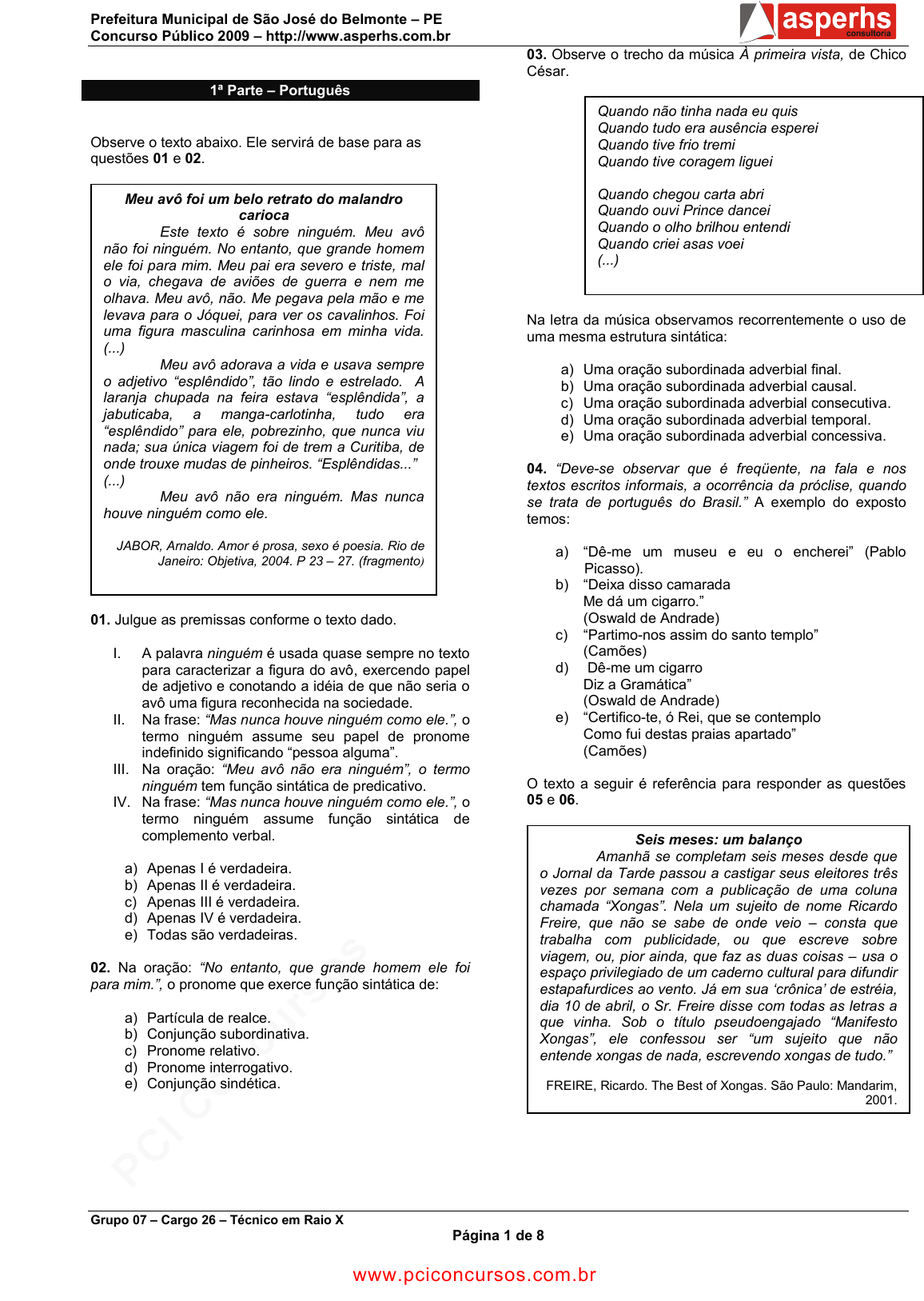 pcimarkpci MjgwNDowN2YyOjA4OTQ6ZTQxYjpkYzk3OmRmMDI6NGU1ZDo5ZWI2:U3VuLCAyMCBBdWcgMjAyMyAxMjoxNjo1OCAtMDMwMA== www.pciconcursos.com.br Prefeitura Municipal de São José do Belmonte – PE Concurso Público 2009 – http://www.asperhs.com.br Grupo 07 – Cargo 26 – Técnico em Raio X Página 1 de 8 1ª Parte – Português Observe o texto abaixo. Ele servirá de base para as questões 01 e 02. 01. Julgue as premissas conforme o texto dado. I. A palavra ninguém é usada quase sempre no texto para caracterizar a figura do avô, exercendo papel de adjetivo e conotando a idéia de que não seria o avô uma figura reconhecida na sociedade. II. Na frase: “Mas nunca houve ninguém como ele.”, o termo ninguém assume seu papel de pronome indefinido significando “pessoa alguma”. III. Na oração: “Meu avô não era ninguém”, o termo ninguém tem função sintática de predicativo. IV. Na frase: “Mas nunca houve ninguém como ele.”, o termo ninguém assume função sintática de complemento verbal. a) Apenas I é verdadeira. b) Apenas II é verdadeira. c) Apenas III é verdadeira. d) Apenas IV é verdadeira. e) Todas são verdadeiras. 02. Na oração: “No entanto, que grande homem ele foi para mim.”, o pronome que exerce função sintática de: a) Partícula de realce. b) Conjunção subordinativa. c) Pronome relativo. d) Pronome interrogativo. e) Conjunção sindética. 03. Observe o trecho da música À primeira vista, de Chico César. Na letra da música observamos recorrentemente o uso de uma mesma estrutura sintática: a) Uma oração subordinada adverbial final. b) Uma oração subordinada adverbial causal. c) Uma oração subordinada adverbial consecutiva. d) Uma oração subordinada adverbial temporal. e) Uma oração subordinada adverbial concessiva. 04. “Deve-se observar que é freqüente, na fala e nos textos escritos informais, a ocorrência da próclise, quando se trata de português do Brasil.” A exemplo do exposto temos: a) “Dê-me um museu e eu o encherei” (Pablo Picasso). b) “Deixa disso camarada Me dá um cigarro.” (Oswald de Andrade) c) “Partimo-nos assim do santo templo” (Camões) d) Dê-me um cigarro Diz a Gramática” (Oswald de Andrade) e) “Certifico-te, ó Rei, que se contemplo Como fui destas praias apartado” (Camões) O texto a seguir é referência para responder as questões 05 e 06. Meu avô foi um belo retrato do malandro carioca Este texto é sobre ninguém. Meu avô não foi ninguém. No entanto, que grande homem ele foi para mim. Meu pai era severo e triste, mal o via, chegava de aviões de guerra e nem me olhava. Meu avô, não. Me pegava pela mão e me levava para o Jóquei, para ver os cavalinhos. Foi uma figura masculina carinhosa em minha vida. (...) Meu avô adorava a vida e usava sempre o adjetivo “esplêndido”, tão lindo e estrelado. A laranja chupada na feira estava “esplêndida”, a jabuticaba, a manga-carlotinha, tudo era “esplêndido” para ele, pobrezinho, que nunca viu nada; sua única viagem foi de trem a Curitiba, de onde trouxe mudas de pinheiros. “Esplêndidas...” (...) Meu avô não era ninguém. Mas nunca houve ninguém como ele. JABOR, Arnaldo. Amor é prosa, sexo é poesia. Rio de Janeiro: Objetiva, 2004. P 23 – 27. (fragmento) Quando não tinha nada eu quis Quando tudo era ausência esperei Quando tive frio tremi Quando tive coragem liguei Quando chegou carta abri Quando ouvi Prince dancei Quando o olho brilhou entendi Quando criei asas voei (...) Seis meses: um balanço Amanhã se completam seis meses desde que o Jornal da Tarde passou a castigar seus eleitores três vezes por semana com a publicação de uma coluna chamada “Xongas”. Nela um sujeito de nome Ricardo Freire, que não se sabe de onde veio – consta que trabalha com publicidade, ou que escreve sobre viagem, ou, pior ainda, que faz as duas coisas – usa o espaço privilegiado de um caderno cultural para difundir estapafurdices ao vento. Já em sua „crônica‟ de estréia, dia 10 de abril, o Sr. Freire disse com todas as letras a que vinha. Sob o título pseudoengajado “Manifesto Xongas”, ele confessou ser “um sujeito que não entende xongas de nada, escrevendo xongas de tudo.” FREIRE, Ricardo. The Best of Xongas. São Paulo: Mandarim, 2001. www.pciconcursos.com.br pcimarkpci MjgwNDowN2YyOjA4OTQ6ZTQxYjpkYzk3OmRmMDI6NGU1ZDo5ZWI2:U3VuLCAyMCBBdWcgMjAyMyAxMjoxNjo1OCAtMDMwMA== www.pciconcursos.com.br Prefeitura Municipal de São José do Belmonte – PE Concurso Público 2009 – http://www.asperhs.com.br Grupo 07 – Cargo 26 – Técnico em Raio X Página 2 de 8 05. Sobre o texto julgue as premissas: I. O texto foi escrito por Ricardo Freire na coluna Xongas. II. Considerando o título e a autoria, causa estranhamento o conteúdo do texto. III. Em diversos momentos se usa aspas ao longo do texto, mas em todos com a intenção de destacar nomes próprios. IV. As aspas usadas no termo crônica, em “Já em sua „crônica‟ de estréia”, têm um tom pejorativo, como que questionasse a qualidade do texto. a) Apenas I é falsa. b) Apenas II é falsa. c) Apenas III é falsa. d) Apenas IV é falsa. e) Todas são falsas. 06. O texto é construído de modo que “aquilo que se diz” e “aquilo que fica subtendido” constituem uma relação de: a) Concessão b) Conseqüência c) Causa d) Soma e) Tempo 07. Observe o texto abaixo: Na tentativa de tentar se definir, o eu lírico, faz uso de: a) Metonímias b) Antíteses c) Personificação d) Metáfora e) Pleonasmo 08. Leia o texto: Qual das orações abaixo teria seu sentido comprometido ou alterado em função do uso da vírgula? I. A irmã de Janete que é professora chega de viagem esta tarde. II. Estamos todos prontos conforme o combinado. III. As frutas que estavam maduras caíram no chão. IV. Cheguei peguei o livro e saí correndo. a) I e II. b) I e III. c) II e III. d) III e IV. e) I e IV. Tome o texto seguinte como base para as questões 09 e 10. Ponto 