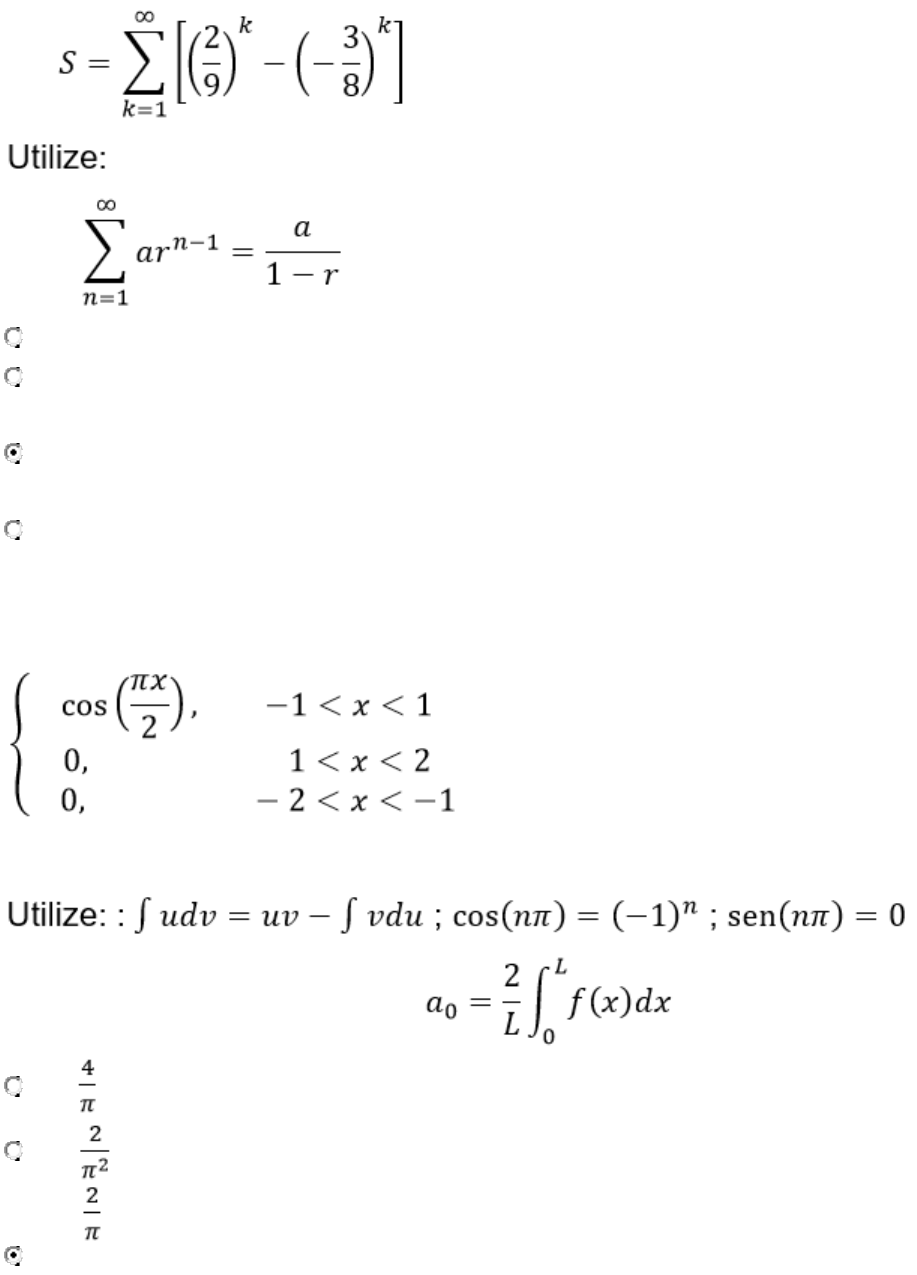 Questão 1/10 - Transformadas: Tempo Contínuo e Discreto Para qual valor converge a série A 2/9 B 3/8 C 43/77 Você assinalou essa alternativa (C) D 43/72 Questão 2/10 - Transformadas: Tempo Contínuo e Discreto Encontre o coeficiente a0 da Série de Fourier da função retificada de meia onda, dada por Observe que seu período fundamental é P=4 e que a função é par. A B C Você assinalou essa alternativa (C) D Questão 3/10 - Transformadas: Tempo Contínuo e Discreto Com respeito às Séries de Fourier, analise as seguintes afirmações: I. As Séries de Fourier representam um sinal periódico em uma soma infinita de componentes senoidais; II. Para indicarmos que uma função é periódica e se repete em um período fundamental P escrevemos ; III. Além do período, temos a frequência fundamental que pode ser obtida por Quais afirmativas são verdadeiras? A I e II B I e III C II e III D Todas as alternativas Você assinalou essa alternativa (D) Questão 4/10 - Transformadas: Tempo Contínuo e Discreto Obtenha a Série de Fourier da função A B Você assinalou essa alternativa (B) C D Questão 5/10 - Transformadas: Tempo Contínuo e Discreto Encontre a Série de Maclaurin que representa a função Você não pontuou essa questão A B C D Você assinalou essa alternativa (D) Questão 6/10 - Transformadas: Tempo Contínuo e Discreto Qual o raio de convergência da série A 3 B 1/3 Você assinalou essa alternativa (B) C 3/2 D 1/2 Questão 7/10 - Transformadas: Tempo Contínuo e Discreto Calcule a integral por partes da integral dada por Utilize: A B Você assinalou essa alternativa (B) C D Questão 8/10 - Transformadas: Tempo Contínuo e Discreto Com respeito à paridade das funções, analise as afirmações abaixo: A I e II B I e III C II e III D Todas as alternativas Você assinalou essa alternativa (D) Questão 9/10 - Transformadas: Tempo Contínuo e Discreto Sobre a forma tabular da integral por partes, analise as afirmações abaixo: I. O acróstico LIATE pode ser utilizado. II. A coluna de u deve ser derivada até obtermos um valor nulo. III. A coluna de dv deve ser integrada até obtermos um valor nulo. Quais afirmativas são verdadeiras? A I e II Você assinalou essa alternativa (A) B I e III C II e III D Todas as alternativas Questão 10/10 - Transformadas: Tempo Contínuo e Discreto Obtenha o coeficiente bn da Série de Fourier da função Onda Quadrada descrita abaixo: A Você assinalou essa alternativa (A) B C D