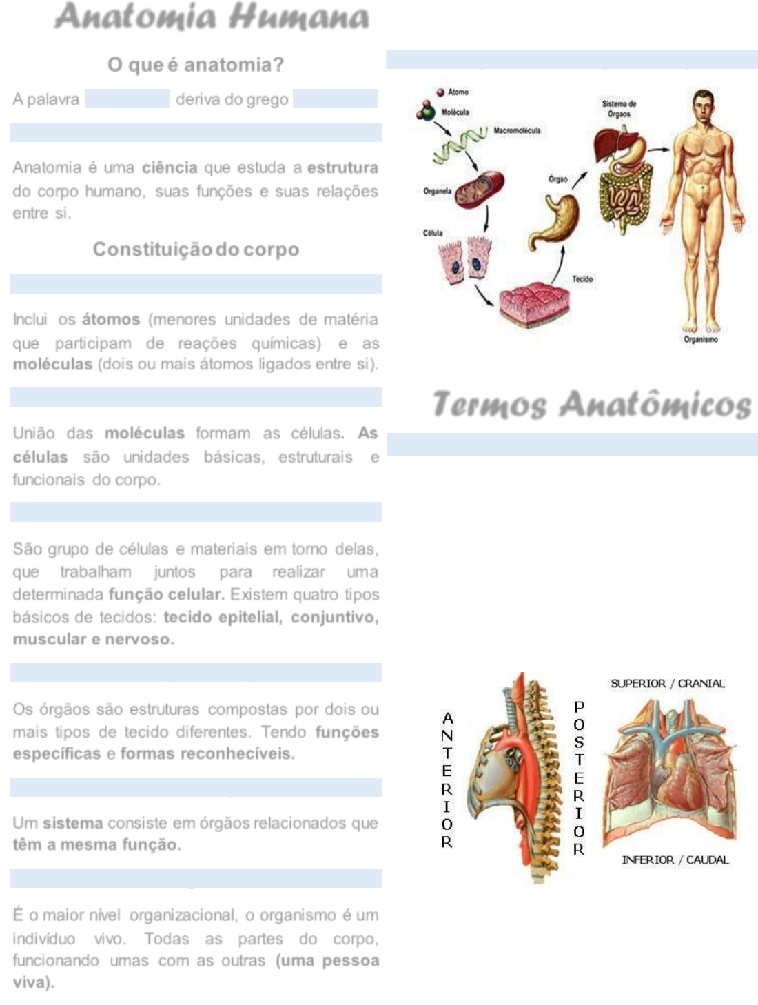 O que é anatomia? A palavra ANATOMIA deriva do grego ANATOME. ANA= através de e TOME=corte Anatomia é uma ciência que estuda a estrutura do corpo humano, suas funções e suas relações entre si. Constituição do corpo Nível Químico- átomos e as moléculas Inclui os átomos (menores unidades de matéria que participam de reações químicas) e as moléculas (dois ou mais átomos ligados entre si). Nível Celular (substâncias químicas) União das moléculas formam as células. As células são unidades básicas, estruturais e funcionais do corpo. Nível Tecidual (tecidos) São grupo de células e materiais em torno delas, que trabalham juntos para realizar uma determinada função celular. Existem quatro tipos básicos de tecidos: tecido epitelial, conjuntivo, muscular e nervoso. Nível Orgânico (órgãos) Os órgãos são estruturas compostas por dois ou mais tipos de tecido diferentes. Tendo funções específicas e formas reconhecíveis. Nível Sistemático (sistemas) Um sistema consiste em órgãos relacionados que têm a mesma função. Nível Organísmico É o maior nível organizacional, o organismo é um indivíduo vivo. Todas as partes do corpo, funcionando umas com as outras (uma pessoa viva). Termos Anatômicos Termos de relação • Anterior / Ventral / Frontal: na região anterior do corpo; • Posterior / Dorsal: na região posterior do corpo; • Superior / Cranial: na direção da região superior do corpo; • Inferior / Caudal: na direção da região inferior do corpo; Anatomia Humana Exemplo da constituição do corpo Termos de Movimentação • Superficial: mais perto da superfície do corpo; • Profundo: mais afastado da superfíci e do corpo; • Homolateral / Ipsilateral: do mesmo lado do corpo ou de outra estrutura; • Mediano, Intermédio e Médio; • Proximal (P): próximo a raíz do membro, da linha média do corpo. Na direção do tronco; • Distal (D): afastado da raíz do membro. Longe do tronco; • Contralateral: do lado contrário do corpo ou de outra estrutura; • Flexão / Extensão Flexão=dobrar / Extensão=esticar • Abdução / Adução abrir /fechar • Rotação medial / Rotação lateral Rodar para dentro/ Rodar para Fora • Medial: mais próximo da linha mediana do corpo; • Lateral: mais distante da linha mediana do corpo; Termos de Comparação • Pronação / Supinação • Retrusão / Protusão Para dentro / Para Fora • Iversão / Eversão Dentro / Externo • Plantiflexão ou flexão plantar do pé • Dorsiflexão ou flexão dorsal do pé • Anteroversão pélvica / Retroversão pélvica Posição Anatômica É uma posição de referência, que dá significado aos termos direcionais utilizados na descrição nas partes e regiões do corpo. Os anatomistas escrevem seus textos, referem-se ao objeto de descrição considerando o indivíduo como se sempre estivesse na posição padronizada; • O corpo está numa postura ereta (em pé, posição ortostática ou bípede) com os membros superiores estendidos ao lado do tronco e as palmas das mãos voltadas para a frente. A cabeça e pés também estão apontados para frente e o olhar para o horizonte. Planos anatómicos de secção Plano Frontal ou Coronal São planos utilizados para estudos anatômicos por meio de secções, ou seja, cortes, a serem realizados no corpo, segmento ou estrutura anatômica em estudo; Existem 4 planos seccionais fundamentais: • Plano Mediano ou Sagital Mediano; • (2) Plano Sagital ou Parassagital; • (3) Plano Frontal; • (4) Plano Horizontal ou Tranverso; Plano Mediano ou Sagital Mediano Plano vertical que passa longitudinalmente através do corpo, dividindo-o em metades direita e esquerda. Plano Sagital Plano vertical que passam através do corpo, paralelos ao plano mediano. Plano vertical que passa através do corpo em ângulos retos com o plano mediano, dividindo-o em partes anterior e posterior. Plano Transverso ou Horizontal Plano que passa através do corpo em ângulos retos com o plano coronal e mediano, dividindo-o em partes superior e inferior. Constituição do corpo Nível Químico- átomos e as moléculas Nível Celular (substâncias químicas) Nível Tecidual (tecidos) Nível Orgânico (órgãos) Nível Sistemático (sistemas) têm a mesma função. Termos Anatômicos Termos de relação Mediano, Intermédio e Médio; Flexão / Extensão Flexão=dobrar / Extensão=esticar Rotação medial / Rotação lateral Rodar para dentro/ Rodar para Fora Retrusão / Protusão Para dentro / Para Fora Plantiflexão ou flexão plantar do pé Posição Anatômica Plano Mediano ou Sagital Mediano; (3) Plano Frontal; Plano Mediano ou Sagital Mediano Plano Sagital Plano Transverso ou Horizontal