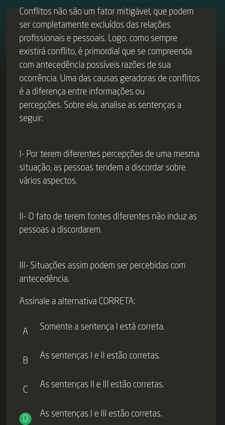 Sobre ela, analise as sentenças a seguir: Por terem diferentes percepções de uma mesma situação, as pessoas tendem a discordar sobre vários aspectos. fato de terem fontes diferentes não induz as pessoas a discordarem. III- Situações assim podem ser percebidas com antecedência. Assinale a alternativa CORRETA: