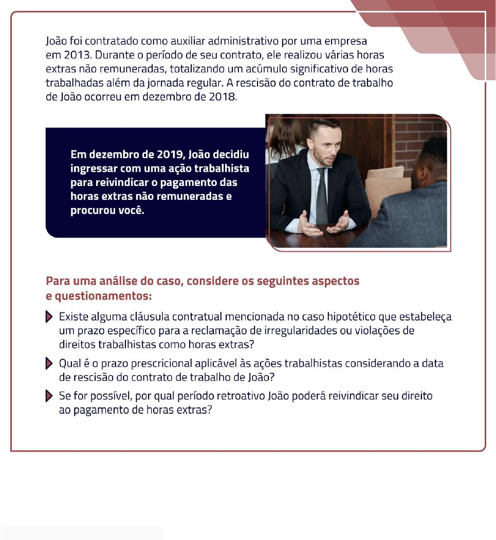 PRESCRIÇÃO E DECADÊNCIA Desafio Com base nos questionamentos acima, elabore um breve parecer, identificando se o direito de João pleitear as horas extras é possível, se está prescrito ou se houve decadência de seu direito de ação. Justifique a sua resposta e cite as bases legais. Padrão de resposta esperado Os elementos do caso de João permitem verificar se é caso de prescrição ou decadência. Primeiro, deve-se verificar se há menção no caso concreto sobre a existência de uma cláusula de decadência no contrato de trabalho de João. Depois, deve-se verificar por quanto tempo João trabalhou na empresa e qual foi a data da rescisão de seu contrato de trabalho. Posteriormente, com base na legislação trabalhista, deve-se verificar se João tinha direito de ingressar com ação em dezembro de 2019. Por fim, em caso de resposta afirmativa, com base na legislação trabalhista, deve-se verificar por qual período retroativo João poderá pleitear o seu direito. A partir dessas bases, será possível responder de forma clara que se o caso de João se refere à prescrição ou à decadência, bem como quais são os caminhos possíveis para a solução do caso. Sua resposta A prescrição, segundo o artigo 189 do Código Civil, é a extinção da pretensão (ação judicial para assegurar um direito) pelo tempo. O texto do mencionado artigo descreve que quando um direito é violado, nasce uma pretensão, ou seja, o direito de ingressar com uma ação para assegurar o direito violado. Essa pretensão é extinta pela prescrição, após a passagem do prazo, definido em lei. Caso a pessoa não apresente a ação à Justiça dentro do prazo, ela perde a oportunidade de ingressar com a ação judicial. A decadência refere-se à perda do direito em si, pela falta de atitude do titular, durante o prazo, previsto em lei. Quando ocorre a decadência, a pessoa não tem mais o direito. Veja o que diz a Lei: Da Prescrição Art. 189. Violado o direito, nasce para o titular a pretensão, a qual se extingue, pela prescrição, nos prazos a que aludem os arts. 205 e 206. Art. 190. A exceção prescreve no mesmo prazo em que a pretensão. Art. 191. A renúncia da prescrição pode ser expressa ou tácita, e só valerá, sendo feita, sem prejuízo de terceiro, depois que a prescrição se consumar; tácita é a renúncia quando se presume de fatos do interessado, incompatíveis com a prescrição. Art. 192. Os prazos de prescrição não podem ser alterados por acordo das partes. Art. 193. A prescrição pode ser alegada em qualquer grau de jurisdição, pela parte a quem aproveita. Art. 195. Os relativamente incapazes e as pessoas jurídicas têm ação contra os seus assistentes ou representantes legais, que derem causa à prescrição, ou não a alegarem oportunamente. Art. 196. A prescrição iniciada contra uma pessoa continua a correr contra o seu sucessor. Da Decadência Art. 207. Salvo disposição legal em contrário, não se aplicam à decadência as normas que impedem, suspendem ou interrompem a prescrição. Art. 208. Aplica-se à decadência o disposto nos arts. 195 e 198, inciso I. Art. 209. É nula a renúncia à decadência fixada em lei. Art. 210. Deve o juiz, de ofício, conhecer da decadência, quando estabelecida por lei. Art. 211. Se a decadência for convencional, a parte a quem aproveita pode alegá-la em qualquer grau de jurisdição, mas o juiz não pode suprir a alegação. Sendo assim, a CLT, em seu artigo 11, trata do prazo prescricional aplicável ao Direito do Trabalho. Neste artigo está definido que prescreve em 5 anos a pretensão de se obter algum direito decorrente às relações de trabalho (prescrição quinquenal), limitados a 2 anos após o término do contrato de trabalho (prescrição bienal). Portanto, conforme descrito acima, João ao decidir ingressar com a ação trabalhista 01 ano após o término do contrato, está dentro do período permitido por lei, tendo direito a receber as horas extras por um período quinquenal, ou seja, referente aos últimos 15 anos (no caso em questão, a partir da sua contratação em 2013). 1. Paulo trabalhou em uma empresa por 6 anos e, ao ser demitido, descobriu que não recebeu corretamente o pagamento das férias dos últimos três anos. Ele deseja entrar com uma ação para reivindicar o valor das férias não pagas. Neste contexto, qual é o prazo prescricional para Paulo ingressar com essa ação após o encerramento do contrato de trabalho? Você acertou! C. 2 anos. 2. É essencial ter um bom entendimento do conceito de decadência no âmbito do Direito do Trabalho, uma vez que ele tem um papel fundamental na proteção e no exercício dos direitos trabalhistas. A compreensão da decadência, entre outros fatores, também auxilia os empregadores a cumprir suas obrigações e a evitar possíveis litígios. Portanto, é de suma importância estar familiarizado com o conceito de decadência no Direito do Trabalho para garantir a proteção e a efetivação dos direitos trabalhistas. No Direito do Trabalho, o conceito de decadência está relacionado à: Você acertou! E. perda do direito de ação em virtude do decurso de determinado prazo. 3. Joana é uma empregada doméstica que trabalha há cinco anos na residência de uma família. Durante esse período, ela cumpriu sua jornada de trabalho e realizou suas tarefas com dedicação e responsabilidade. Porém, nos últimos meses, Joana percebeu que não estava recebendo corretamente suas férias, o que despertou dúvidas e preocupações sobre seus direitos trabalhistas. Diante dessa situação, Joana decide buscar informações para entender melhor seus direitos no âmbito do Direito do Trabalho, especialmente em relação às férias. Ela procura um advogado especializado na área trabalhista, que a orienta sobre a importância de compreender a diferença entre os prazos prescricionais e decadenciais que podem afetar a reivindicação de seus direitos. Qual 