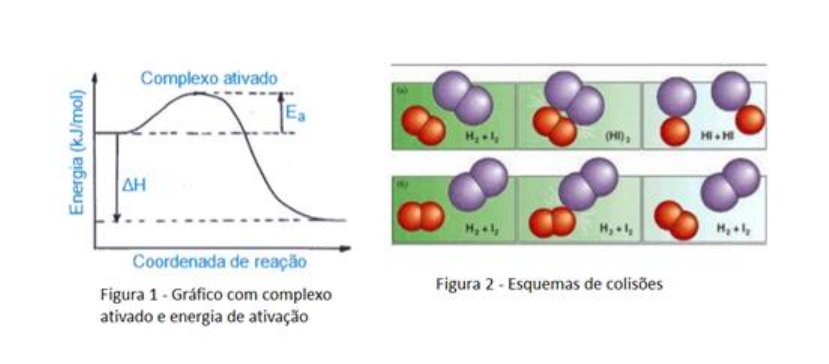 Experimento 3 - Relógio de Iodo: cinética química Objetivos Avaliar o efeito da concentração na velocidade de uma reação química; demostrar o efeito da temperatura na velocidade de uma reação química e ilustrar o método de obtenção de uma curva de calibração e usá-la para determinar a concentração de uma solução desconhecida. INTRODUÇÃO Todas as reações químicas se desenvolvem com uma velocidade definida que depende da natureza dos reagentes, de suas concentrações, da temperatura, da superfície exposta dos reagentes e da presença de catalisadores. Muitas reações, como a explosão de uma mistura de oxigênio e hidrogênio, ocorrem tão rapidamente que a medida de sua velocidade é extremadamente difícil. Outras, como a oxidação de ferro (formação de ferrugem), são tão vagarosas que as medidas de velocidade são também difíceis. Porém, existem muitas reações incluindo aquela que será realizada nesta pratica, que ocorrem a velocidades fáceis de serem calculadas. Chama-se cinética química o estudo das velocidades das reações. Quanto à natureza dos reagentes, observa-se que as reações iônicas geralmente tendem a ser mais rápidas do que as reações que envolvem a quebra de ligações covalentes. Considerando-se a estrutura submicroscópica da matéria, uma reação química pode ocorrer somente quando os átomos, íons ou moléculas dos reagentes entram em contato através das colisões. Assim, a velocidade de uma dada reação dependerá da frequência com a qual as partículas colidem. Porém, nem todas as colisões produzem uma reação química, porque elas não têm as condições energéticas necessárias (Figura 1) ou porque não apresentam as orientações relativas adequadas (Figura 2). De qualquer modo, qualquer mudança de condições que aumente o número de colisões entre as partículas, aumentará a velocidade de uma reação química. Experimentalmente observa-se que as seguintes mudanças aumentam a velocidade de uma reação: a) Aumento de concentração do reagente, com isto aumenta o número de partículas num dado volume e, portanto, as colisões serão mais frequentes. b) Aumento da temperatura. Isto acelera as partículas e por isso ocorrem mais colisões por unidade de tempo. A velocidade de reação também aumenta porque mais moléculas terão energia suficiente para vencer a barreira de energia para esta reação. Muitas vezes a velocidade de reação dobra para cada aumento de temperatura de 10 0C. c) Aumento da área superficial das partículas. Um pedaço de carvão requer certo tempo para queimar, enquanto que o carvão pulverizado pode produzir uma explosão por causa do aumento da área superficial. d) catalisadores aumentam a velocidade de reação. Inibidores podem ser usados para desacelerar velocidades de reações. Os catalisadores atuam diminuindo a barreira energética (energia de ativação). Muitas vezes para uma reação ocorrer são necessários vários estágios elementares sucessivos antes que haja formação de produto final. O conjunto destes estágios é definido como mecanismo de uma reação e a velocidade de reação é então determinada pelas velocidades individuais de todos estes estágios. Se um deles for mais lento que os demais, a velocidade de reação dependerá da velocidade deste único estagio mais lento, que é, portanto, o determinante da velocidade. As reações que ocorrerão nesta prática são as seguintes: Enquanto houver íons sulfito, o iodo molecular, I2, formado conforme a equação 2, será reduzido a iodeto como descrito pela equação 3. Ao se acumular iodo molecular, ele formará um aduto de cor azul com o amido, equação 3, indicando com precisão o final da reação, possibilitando uma medida do tempo de reação. A fim de verificar-se o efeito da concentração dos reagentes sobre a velocidade de uma reação, será construído um gráfico a partir dos dados dos experimentos conduzidos a partir de cinco (5) soluções contendo concentrações diferentes de iodato. A concentração desconhecida de iodato de uma solução pode então pode ser determinada a partir do gráfico construído. Nesta prática, pode-se construir um gráfico de leitura fácil, colocando-se o inverso do tempo no eixo das ordenadas e a concentração molar no eixo das abcissas. O inverso do tempo é proporcional à velocidade média de reação. Para verificar o efeito da temperatura sobre a velocidade de uma reação, serão mantidas as concentrações das soluções dos reagentes e variada a temperatura. Materiais Balão volumétrico de 50 mL; Bastão de vidro; 4 Béquer de 50 mL, 100 mL e 150 mL; Bureta; Cronômetro; Pipeta Pasteur; Solução de iodato de potássio; Solução de bissulfito de sódio; Solução desconhecida; Termômetro. Procedimento A – Influência da concentração na velocidade da reação 1. Solução 1: 4,28 g de KIO3 em 1 L de solução (Solução pronta); 2. Solução 2: 0,852 g NaHSO3, 4 mL de H2SO4 conc a 50 mL de suspensão de amido, em 1 L de solução (Solução pronta); 3. Lavar a bureta (1) com pequenas porções da solução 1 e a bureta (2) com a solução 2; 4. Colocar as buretas no suporte vertical e completar seus volumes com as soluções 1 e 2, até a marca zero; 5. Preparar as soluções de A até E conforme indicado na Tabela 1, do seguinte modo: no balão volumétrico de 50 mL marcado 1, colocar, diretamente da bureta, a quantidade indicada na Tabela 1. Acrescentar água destilada até a marca de volume do balão volumétrico. Agitar bem. Para o balão volumétrico 2, repita a operação com a Solução 2. Não esquecer de utilizar a pipeta Pasteur para ajustar o menisco do balão. 6. Para efetuar a reação, transferir a solução 1 para um béquer de 150mL. Colocar um bastão de vidro nessa solução. Transferir a solução 2 para outro béquer de 100mL; 7. Colocar a solução 2 na solução 1 e disparar imediatamente o cronômetro. Agitar a
