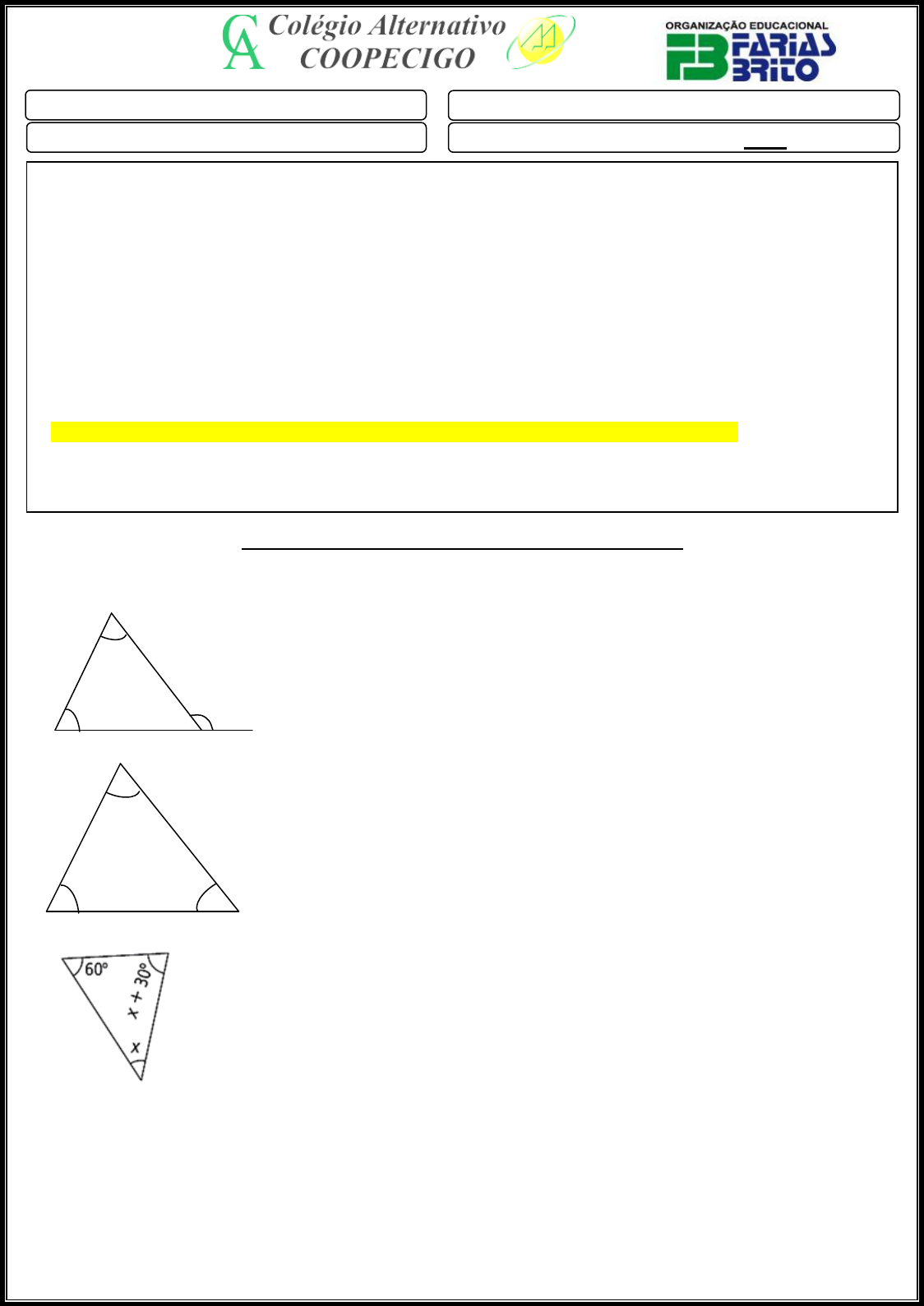 Disciplina: Geometria Aluno(a): Professor (a):Mattheus Ano: 8º Data: ____/____/2020 ATIVIDADE AVALIATIVA DEGEOMETRIA –EAD 1. (0.6) Determine o valor de x nos triângulos: a) b) c) 2.(0.4) A respeitos das propriedades dos triângulos julgue os itens em verdadeiro (V) ou falso (F): a) ( ) Os ângulos internos de um triângulo equilátero são congruentes e mede 60° cada. b) ( ) Os ângulos internos da base de um triângulo isósceles são congruentes. c) ( ) Os pontos notáveis no triângulo isósceles são coincidentes em relação a qualquer lado. d) ( ) Os pontos notáveis no triângulo equilátero são coincidentes em relação a base. OBSERVAÇÕES: Leia as questões com muita atenção antes de resolvê-las; A Avaliação dever ser respondida no caderno, após preencher o cabeçalho (data, nome do aluno e série) e a identificação: Avaliação de Geometria; As respostas devem ser todas escritas a caneta, nas cores azul ou preta; Não é permitida a utilização de corretivo. Questões rasuradas (subjetivas e objetivas) não serão consideradas; Questões subjetivas e objetivas, quando necessário, deverão conter todos os cálculos, caso contrá- rio, não serão consideradas; Depois de finalizada a avaliação deve ser enviada para o WhatsApp: 9 8472-2171; O conteúdo abordado na avaliação será: Triângulos. Valor: 3.5 pontos. Nota: _____ 4x + 40º x + 20º x 52º 85º x 3. (0.4)É possível traçar quatro segmentos de reta num triângulo, cada um com diferentes características. A partir destes quatro tipos diferentes de divisões do triângulo, conseguimos encontrar quatro pontos notáveis (altura, bissetriz, mediana e mediatriz) no triângulo. I) Relacione cada um dos pontos notáveis ao seu significado: ( ) segmento de reta, partindo do ponto médio da base e formando um ângulo reto com esta. ( ) segmento de reta a unir o ponto médio da base com o vértice oposto. ( ) Segmento de reta a unir a base com o vértice oposto formando um ângulo reto com esta. ( ) segmento de reta que divide o ângulo em duas partes congruentes. II)(0.4) Relacione cada um dos pontos notáveis ao seu ponto de intersecção: A) Altura B) Bissetriz C) Mediana D) Mediatriz ( ) Baricentro ( ) Incentro ( ) Circuncentro ( ) Ortocentro 4.(0.3) Considere a figura a seguir: a) Calcule a medida do ângulo BÂO. b) Identifique qual dos triângulos é um triângulo retân- gulo. c) No triângulo CDO, identifique o lado de maior com- primento. 6. (0.3) Na figura, onde G é o baricentro, AE = 1,8 cm; DC = 2 cm e FC = 2,4 cm; calcule, em centímetros, o perímetro do triângulo ABC. A) Altura B) Bissetriz C) Mediana D) Mediatriz 3 7. (0.3)Na figura, BM é mediana do triângulo ABC. Calcule x de modo que o perímetro do triângulo ABC se- ja 24 cm. 8. (0.4)O peso da figura está suspenso por duas cordas de mesma medida e presas no teto. Se o ângulo entre as cordas é de 58º, quanto medem os ângulos formados pela corda e pelo teto? 9. (0.4) Em cada figura a seguir, observe as indicações de congruência e escreva qual o caso de congruên- cia entre os triângulos: Bom trabalho!