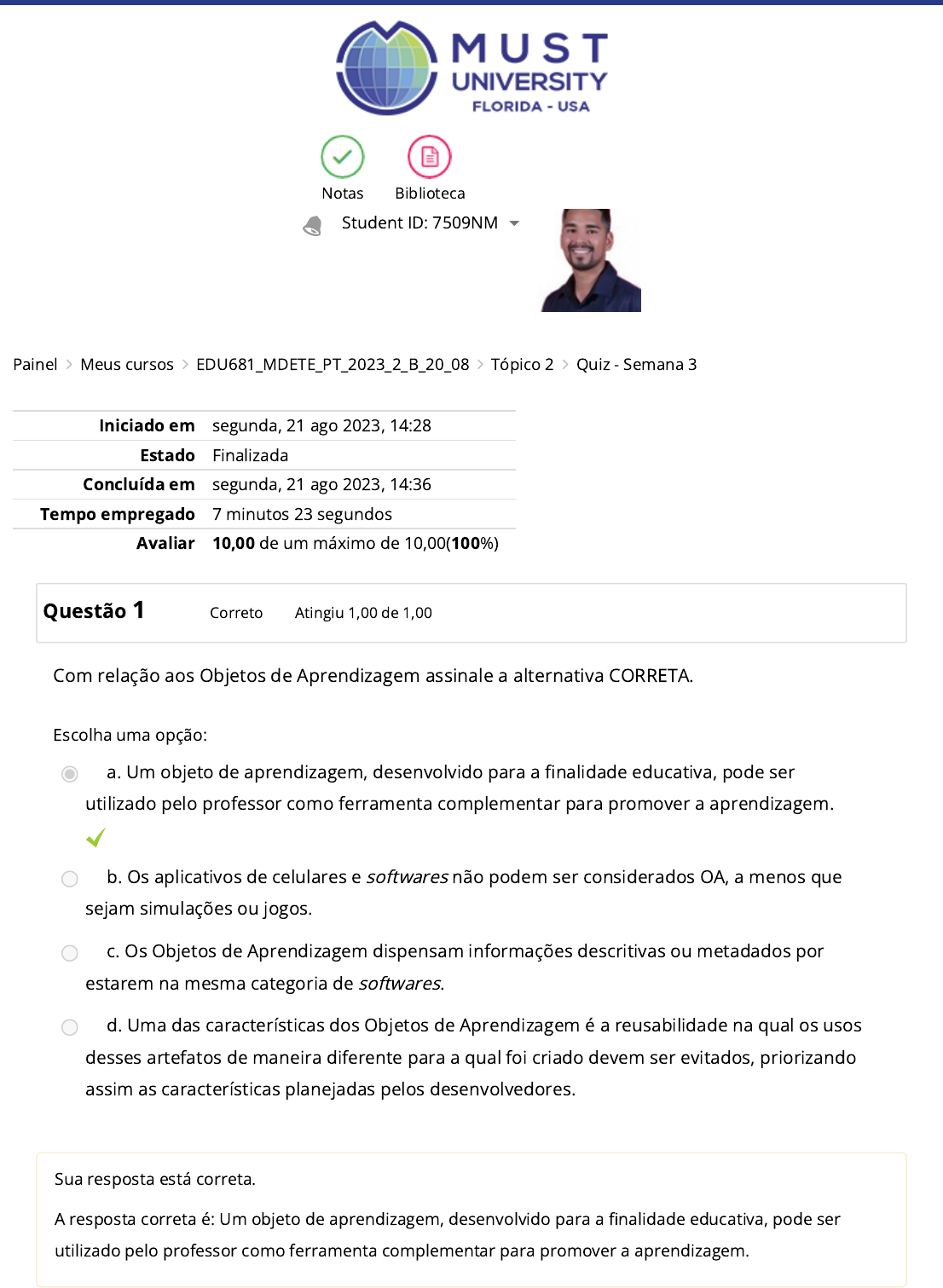 Painel Meus cursos EDU681_MDETE_PT_2023_2_B_20_08 Tópico 2 Quiz - Semana 3 Student ID: 7509NM Notas Biblioteca Iniciado em segunda, 21 ago 2023, 14:28 Estado Finalizada Concluída em segunda, 21 ago 2023, 14:36 Tempo empregado 7 minutos 23 segundos Avaliar 10,00 de um máximo de 10,00(100%) Questão 1 Correto Atingiu 1,00 de 1,00 Com relação aos Objetos de Aprendizagem assinale a alternativa CORRETA. Escolha uma opção: a. Um objeto de aprendizagem, desenvolvido para a �nalidade educativa, pode ser utilizado pelo professor como ferramenta complementar para promover a aprendizagem. b. Os aplicativos de celulares e softwares não podem ser considerados OA, a menos que sejam simulações ou jogos. c. Os Objetos de Aprendizagem dispensam informações descritivas ou metadados por estarem na mesma categoria de softwares. d. Uma das características dos Objetos de Aprendizagem é a reusabilidade na qual os usos desses artefatos de maneira diferente para a qual foi criado devem ser evitados, priorizando assim as características planejadas pelos desenvolvedores. Sua resposta está correta. A resposta correta é: Um objeto de aprendizagem, desenvolvido para a �nalidade educativa, pode ser utilizado pelo professor como ferramenta complementar para promover a aprendizagem. https://my.mustedu.com/my/ https://my.mustedu.com/course/view.php?id=899 https://my.mustedu.com/course/view.php?id=899#section-2 https://my.mustedu.com/mod/quiz/view.php?id=73821 https://my.mustedu.com/ https://my.mustedu.com/user/view.php?id=7272&course=899 https://my.mustedu.com/custom/minhas_notas.php Questão 2 Correto Atingiu 1,00 de 1,00 Lee Sheldon propõe a seguinte de�nição: “gami�cação é a aplicação de mecânicas de games em atividades que não são de games”. Em função da citação, é correto a�rmar que: Escolha uma opção: a. A gami�cação valoriza o pensamento linear. b. O uso de elementos dos games em estratégias de aprendizagem não garante o engajamento. c. A adoção da gami�cação depende da inserção do participante em um contexto de game. d. A gami�cação sempre implica na presença de um vencedor. Sua resposta está correta. A resposta correta é: O uso de elementos dos games em estratégias de aprendizagem não garante o engajamento. Questão 3 Correto Atingiu 1,00 de 1,00 Podemos de�nir gami�cação como o uso de elementos de design de games em contextos que não são de games. Baseado nessa de�nição, bastante comum na literatura, é correto a�rmar que: Escolha uma opção: a. É possível gami�car uma disciplina sem utilizar games. b. A gami�cação só ocorre nos contextos dos games. c. Não é possível gami�car uma atividade sem utilizar games. d. Gami�cação signi�ca utilizar games em educação. Sua resposta está correta. A resposta correta é: É possível gami�car uma disciplina sem utilizar games. Questão 4 Correto Atingiu 1,00 de 1,00 A utilização dos objetos de aprendizagem pressupõe um novo tipo de paradigma apoiado na tecnologia da informação e comunicação. Nesse contexto, o professor torna-se: Escolha uma opção: a. mediador do processo de ensino e aprendizagem. b. transmissor de informações. c. produtor de conhecimentos. d. agente passivo do conhecimento. Sua resposta está correta. A resposta correta é: produtor de conhecimentos. Questão 5 Correto Atingiu 1,00 de 1,00 Hipermídia pode ser de�nida como: Escolha uma opção: a. o elemento básico de hipertexto que oferece um método de ir de um ponto do documento a outro. b. o acesso do leitor a diversos computadores simultaneamente. c. a disponibilização de todos os meios de transmissão de informações digitais. d. a hiperexposição de um conteúdo relevante, viralizado na rede. Sua resposta está correta. A resposta correta é: a disponibilização de todos os meios de transmissão de informações digitais. Questão 6 Correto Atingiu 1,00 de 1,00 Uma das características principais do hipertexto é a possibilidade que o leitor tem de construir seu percurso de leitura, podendo, inclusive, exercer o papel de coautor do texto. Isso só é possível porque: Escolha uma opção: a. a partir do hipertexto, os limites entre autor e leitor �caram ainda mais demarcados. b. a noção de hipertexto não altera a noção tradicional de autoria do texto. c. o hipertexto possibilita uma eventual interatividade entre o texto e o leitor. d. o leitor, depois de ter acessado diversos links e hiperlinks que formaram o hipertexto, é o responsável por construir a versão �nal do texto. Sua resposta está correta. A resposta correta é: o leitor, depois de ter acessado diversos links e hiperlinks que formaram o hipertexto, é o responsável por construir a versão �nal do texto. Questão 7 Correto Atingiu 1,00 de 1,00 Sobre o hipertexto, é CORRETO a�rmar: Escolha uma opção: a. O hipertexto é um texto maior formado por vários outros elementos textuais acessíveis através de links e hiperlinks, que permitem aos leitores cadastrados em uma plataforma acessarem para leitura. b. Tipo de texto que somente pode ser encontrado na internet, sendo somente possível sua concepção mediante disponibilização do arquivo em rede. c. O termo hipertexto foi criado na década de 1960 pelo �lósofo, sociólogo e pioneiro da Tecnologia da Informação, Ted Nelson, como um texto eletrônico independente de suportes inteligentes e interativos. d. O hipertexto é uma forma de organizar a escrita encontrada também no papel, porém geralmente relacionada aos textos virtuais. É um tipo de intertextualidade nos modos de leitura e de escrita. Sua resposta está correta. A resposta correta é: O hipertexto é uma forma de organizar a escrita encontrada também no papel, porém geralmente relacionada aos textos virtuais. É um tipo de intertextualidade nos modos de leitura e de escrita. Questão 8 Correto Atingiu 1,00 de 1,00 A produção do vídeo interativo difere da produção da vi