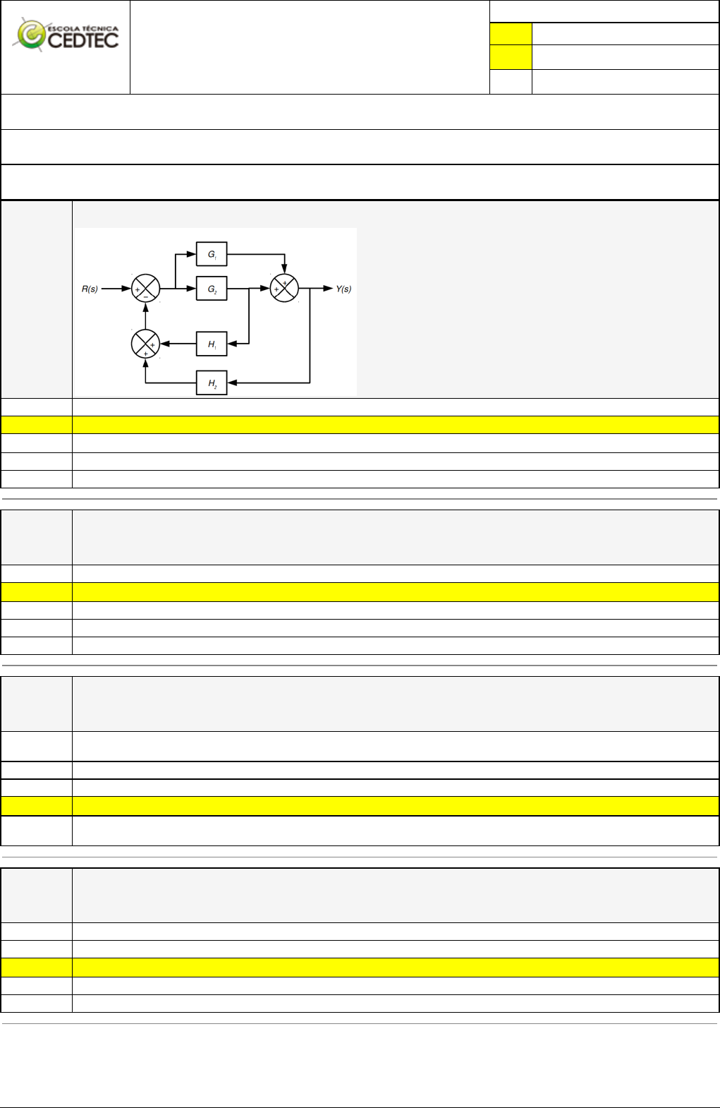 Pincel Atômico - 21/08/2023 18:45:15 1/1 VALTHEIR DA SILVA ARAÚJO Exercício Caminho do Conhecimento - Etapa 4 (27707) Atividade finalizada em 15/08/2023 19:21:58 (1136709 / 2) LEGENDA Resposta correta na questão # Resposta correta - Questão Anulada X Resposta selecionada pelo Aluno Disciplina: CONTROLE DE PROCESSOS [838684] - Avaliação com 4 questões, com o peso total de 6,50 pontos [capítulos - 112] Turma: Curso Técnico: Automação Industrial - Grupo: EAD - 05/23 - EAD AUT [88401] Aluno(a): 91312004 - VALTHEIR DA SILVA ARAÚJO - Respondeu 3 questões corretas, obtendo um total de 4,88 pontos como nota [350090_1915 95] Questão 001 Assinale a alternativa que apresenta CORRETAMENTE a equação de função de transferência simplificada de um sistema linear representado através do diagrama de blocos mostrado na figura: Y(s) / R(s) = 1 / (1 + H1.G2 +H2. (G1+G2)) Y(s) / R(s) = (G1 + G2) / (1 + H1.G2 +H2. (G1+G2)) X Y(s) / R(s) = (G1 + G2) / (1 - H1.H2 +H2. (G1+G2)) Y(s) / R(s) = (G1. G2) / (1 + H1.G2 +H2. (G1+G2)) Y(s) / R(s) = 1 / (1 + H1.G1 +H2. (G1+G2)) [350090_1915 97] Questão 002 Os ingredientes básicos de um sistema de controle podem ser descritos por: Variáveis de entrada, variáveis de saída e atuadores. X Objetivos de controle, componentes do sistema de controle e resultados ou saídas. Controladores lógicos programáveis, sensores e atuadores. Elementos de sequência, variáveis controladas e resultados ou saídas. Organização de dados, coleta de dados e distribuição de dados. [350091_1915 89] Questão 003 Sobre os elementos de final de controle (atuadores), é CORRETO afirmar que: São dispositivos que convertem o sinal de leitura de um elemento secundário de medição em um sinal padrão e o transmitem a um mostrador ou controlador terciário. Têm a finalidade de controlar o erro do sistema de medição utilizando processo de integração proporcional. Têm a função de converter o sinal da variável física em um sinal da variável de saída apropriado. X São a parte do sistema de controle que atua para alterar fisicamente a variável manipulada. São dispositivos que convertem o sinal de leitura de um elemento primário de medição em um sinal padrão e o transmitem a um mostrador ou controlador. [350092_1915 94] Questão 004 Em uma estação de tratamento de despejos industriais (ETDI), a temperatura dos tanques de biodigestores anaeróbios deve ser mantida entre 34ºC e 38ºC para eficiência satisfatória e bem-estar das bactérias digestoras. Considerando que, em uma estação desse tipo, o controle de vapor que aquece o tanque é controlado pelo operador, ao verificar alguma mudança na temperatura, o tipo de malha de controle, com o respectivo acionamento, que está sendo utilizado é: Malha fechada com acionamento manual. Malha fechada com acionamento aberto. X Malha aberta com acionamento manual. Malha aberta com acionamento automático. Malha aberta com acionamento robótico.