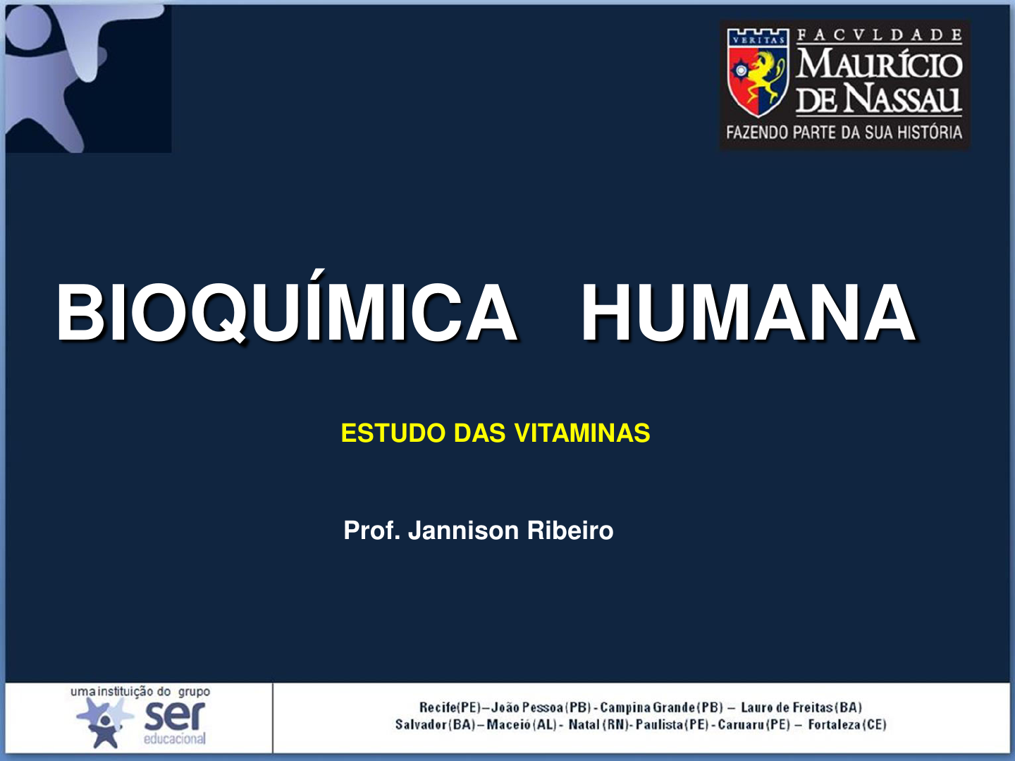 BIOQUÍMICA HUMANA Prof. Jannison Ribeiro ESTUDO DAS VITAMINAS "compostos orgânicos obtidos em uma dieta normal e capazes de manter a vida e promover o crescimento" INTRODUÇÃO • Substâncias essenciais para o funcionamento normal do metabolismo. • O termo vitamina foi utilizado (1911) para designar substâncias com o grupo funcional amina (achava-se que todas essas substâncias eram aminas) • Atualmente o termo fator alimentar acessório também é utilizado para esse grupo de substâncias. INTRODUÇÃO • O organismo não é capaz de sintetizar a grande maioria das vitaminas, portanto devem ser obtidas através da dieta. • A falta de vitaminas pode ser total (avitaminose) ou parcial (hipovitaminose), nessas situações podem surgir manifestações classificadas como doenças carênciais. INTRODUÇÃO • Não podem ser sintetizadas pelo nosso organismo em quantidades apreciáveis • Atuam como coenzimas. • Ativam enzimas de atuação metabólica. http://upload.wikimedia.org/wikipedia/commons/a/ae/Retinol_3Dstructure.png INTRODUÇÃO • Não energético. • São termoestáveis (100ºC). • Abundante na natureza e podem ser encontradas sob forma inativa (Provitamina). • Classificadas em dois grandes grupos: HIDROSSOLÚVEIS LIPOSSOLÚVEIS INTRODUÇÃO Divisão de acordo com sua solubilidade: • Lipossolúveis são: A (Retinol); D (Calciferol); E (Tocoferol) ; K (Menaquinona). • Hidrossolúveis são: B1(Tiamina), B2 (Riboflavina), B3 (Niacina), B5 (Ácido Pantotênico), B6 (Piridoxina), B9 (Ácido Fólico), B12(Cianocobalamina) e Vitamina C (Ácido Ascórbico), Vitaminas Lipossolúveis Vitaminas Lipossolúveis • As vitaminas solúveis em gorduras são absorvidas no intestino humano com a ajuda de sais biliares segregados pelo fígado. • Transportados na forma de quilomícrons. • Vitamina A no fígado; • Vitamina D e E no tecido adiposo e muscular; • Vitamina K não é armazenada. Vitaminas Lipossolúveis • O excesso das vitaminas solúveis em gorduras serão armazenadas em locais específicos do corpo; Vitamina A (Retinol) • Necessária em maior quantidade pelo nosso organismo; • Relacionada diretamente com a Fisiologia da Visão; Produção de uma proteína produzida na retina Rodopsina Relacionada a visão adaptada a ambientes mais escuros; Vitamina A (Retinol) • Importante para queratinização da Pele e Cabelos; • Importante função no reforço imunológico, Bactericida • Importante função anti-oxidante; Vitamina A (Retinol) • Fontes Principais: Fígado, Ovos, leite (Integral) e Vegetais avermelhados http://upload.wikimedia.org/wikipedia/commons/e/e6/Carrots.JPG http://upload.wikimedia.org/wikipedia/commons/0/0e/Milk_glass.jpg http://upload.wikimedia.org/wikipedia/commons/3/35/Raw_egg.jpg http://upload.wikimedia.org/wikipedia/commons/d/d2/Tomatoes_plain_and_sliced.jpg Vitamina A (Retinol) • Carência Vitamina A; Desmame Precoce, Infecções frequentes com perda do apetite (Anorexia), Alimentos pobres em gordura (Desnatados), e Alimentos pobres em vit. A; Xeroftalmia Pele escamosa Diminuição da Resistência a Infecções • Excesso Vitamina A; Náuseas, Vômito, Tonturas, Lesões Hepáticas. Vitamina D (Calciferol) • Atua no metabolismo do cálcio (absorção de cálcio pelos ossos), promove crescimento normal e mineralização dos ossos. • Regula os níveis sanguíneos de cálcio e fósforo; • Produzida a partir da ação dos raios UV na pele, convertendo a provitamina D em vitamina D ativada. Vitamina D (Calciferol) Vitamina D (Calciferol) • Fontes Principais: Fígado, Ovos, Manteiga, Salmão e Sardinha. • Lembrando Importante a exposição ao Sol ! http://upload.wikimedia.org/wikipedia/commons/3/35/Raw_egg.jpg http://upload.wikimedia.org/wikipedia/commons/9/9f/Meersalzbutter_IMGP1995_wp.jpg Vitamina D (Calciferol) • Carência Vitamina D; Falta exposição a Luz solar, excesso de protetores solares, falta de suplementação em Idosos; RAQUITISMO OSTEOPOROSE Vitamina E (Tocoferol) • Extremamente Antioxidante (Altamente anti cancerígena e previne doenças cardiovasculares); • Bom funcionamento do Tecido muscular; • Auxilia na Tensão pré-menstrual (TPM) • Formação de células sexuais (principalmente espermatogênese) e células sanguíneas; Vitamina E (Tocoferol) • Fontes Principais: Sementes e Óleos Vegetais; Aveia, Amendoim, Castanha do Pará, Nozes, Cevada, milho, trigo, ervilha, soja, ovos. http://upload.wikimedia.org/wikipedia/commons/b/b3/Various_grains.jpg http://upload.wikimedia.org/wikipedia/commons/7/77/Arachis-hypogaea-%28peanuts%29.jpg http://upload.wikimedia.org/wikipedia/commons/2/2c/Corn-raw-boiled-and-dry.jpg http://upload.wikimedia.org/wikipedia/commons/3/35/Raw_egg.jpg Vitamina E (Tocoferol) • Carência Vitamina E; Alimentação pobre em Sementes ricas em Óleos e demais alimentos fonte de vitamina E, Doenças intestinais (Síndrome do intestino Irritado); Poucas doenças estão relacionadas à falta de vitamina E. Infertilidade Masculina Anemia Vitamina K (Filoquinona) • Síntese da protombina e de várias proteínas relacionadas com a coagulação do sangue; • Conhecida como vitamina anti-hemorrágica; • Resistência óssea (Osteocalcina); • Cerca de 1/3 de toda necessidade diária de vit. K é produzida pelas bactérias da flora intestinal. Vitamina K (Filoquinona) Principais fontes: vegetais folhosos couve, espinafre, repolho, acelga etc. Chá verde, Fígado e ovos. http://upload.wikimedia.org/wikipedia/commons/3/35/Raw_egg.jpg Vitamina K (Filoquinona) • Carência Vitamina K; A doença no fígado ou na vesícula biliar, ou qualquer doença do trato intestinal que interfira na absorção das gorduras; Medicamentos utilizados a longo prazo para redução do colesterol; Bebês não suplementados com vitamina K (nascem sem a flora bacteriana). Processos Hemorrágicos Hematomas e Petéquias Vitaminas Hidrossolúveis Vitaminas Hidrossolúveis • Absorção Intestinal dissolvidas