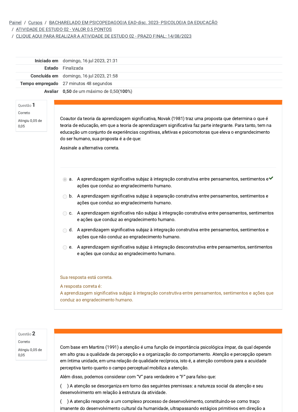 Questão 1 Correto Atingiu 0,05 de 0,05 Questão 2 Correto Atingiu 0,05 de 0,05 Iniciado em domingo, 16 jul 2023, 21:31 Estado Finalizada Concluída em domingo, 16 jul 2023, 21:58 Tempo empregado 27 minutos 48 segundos Avaliar 0,50 de um máximo de 0,50(100%) Coautor da teoria da aprendizagem significativa, Novak (1981) traz uma proposta que determina o que é teoria de educação, em que a teoria de aprendizagem significativa faz parte integrante. Para tanto, tem na educação um conjunto de experiências cognitivas, afetivas e psicomotoras que eleva o engrandecimento do ser humano, sua proposta é a de que: Assinale a alternativa correta. a. A aprendizagem significativa subjaz à integração construtiva entre pensamentos, sentimentos e ações que conduz ao engradecimento humano. b. A aprendizagem significativa subjaz à separação construtiva entre pensamentos, sentimentos e ações que conduz ao engradecimento humano. c. A aprendizagem significativa não subjaz à integração construtiva entre pensamentos, sentimentos e ações que conduz ao engradecimento humano. d. A aprendizagem significativa subjaz à integração construtiva entre pensamentos, sentimentos e ações que não conduz ao engradecimento humano. e. A aprendizagem significativa subjaz à integração desconstrutiva entre pensamentos, sentimentos e ações que conduz ao engradecimento humano. Sua resposta está correta. A resposta correta é: A aprendizagem significativa subjaz à integração construtiva entre pensamentos, sentimentos e ações que conduz ao engradecimento humano. Com base em Martins (1991) a atenção é uma função de importância psicológica ímpar, da qual depende em alto grau a qualidade da percepção e a organização do comportamento. Atenção e percepção operam em íntima unidade, em uma relação de qualidade recíproca, isto é, a atenção corrobora para a acuidade perceptiva tanto quanto o campo perceptual mobiliza a atenção. Além disso, podemos considerar com “V” para verdadeiro e “F” para falso que: ( ) A atenção se desorganiza em torno das seguintes premissas: a natureza social da atenção e seu desenvolvimento em relação à estrutura da atividade. ( ) A atenção responde a um complexo processo de desenvolvimento, constituindo-se como traço imanente do desenvolvimento cultural da humanidade, ultrapassando estágios primitivos em direção a Painel / Cursos / BACHARELADO EM PSICOPEDAGOGIA EAD-disc. 3023- PSICOLOGIA DA EDUCAÇÃO / ATIVIDADE DE ESTUDO 02 - VALOR 0,5 PONTOS / CLIQUE AQUI PARA REALIZAR A ATIVIDADE DE ESTUDO 02 - PRAZO FINAL: 14/08/2023 https://www.eadunifatecie.com.br/course/view.php?id=18038 https://www.eadunifatecie.com.br/my/ https://www.eadunifatecie.com.br/course/index.php https://www.eadunifatecie.com.br/course/view.php?id=18038 https://www.eadunifatecie.com.br/course/view.php?id=18038#section-8 https://www.eadunifatecie.com.br/mod/quiz/view.php?id=573443 Questão 3 Correto Atingiu 0,05 de 0,05 Questão 4 Correto Atingiu 0,05 de 0,05 estágios altamente organizados e complexos (VYGOTSKI, 1996). ( ) Do ponto de vista filogenético, o desenvolvimento da atenção é causa e efeito do trabalho. ( ) Sobre a atenção Vygotski (1996, p. 139) ressaltou que: “[...] devemos encarar seu estudo como o de um produto do desenvolvimento cultural da criança, devemos considerá-la como um modo de adaptação à vida social superior [...]”. Assinale a alternativa correta. a. F, F, V, V. b. F, V, F, V. c. F, F, F, V. d. V, V, V, V. e. F, V, V, V. Sua resposta está correta. A resposta correta é: F, V, V, V. De acordo com os estudos de Freud (1915), todas as crianças passam por cinco estágios de desenvolvimento psicossexual, nos quais o instinto sexual foca em diferentes zonas erógenas do corpo. Qual estágio em especial apresenta as seguintes características: I . Prazer centrado nos órgãos genitais; II. Identificação com os pais do mesmo sexo reduz a tensão. III. Compreende o surgimento do superego. IV. Compreende a faixa etária dos 4 a 6 anos. Assinale a alternativa correta. a. Estágio genital. b. Estágio latente. c. Estágio fálico. d. Estágio oral. e. Estágio anal. Sua resposta está correta. A resposta correta é: Estágio fálico. A Pedagogia Libertadora defende que as pessoas só podem mudar por meio de uma educação que tenha, entre outras, fontes a política. Em outras palavras, ela propõe uma educação embasada no desenvolvimento do senso crítico, de maneira no qual, transformações sociais sejam desencadeadas, Questão 5 Correto Atingiu 0,05 de 0,05 Questão 6 Correto Atingiu 0,05 de 0,05 fazendo com que a sociedade se torne mais justa, humana, igualitária e solidária. Mediante a essa caracterização, quem foi o defensor dessa pedagogia: Assinale a alternativa correta. a. Paulo Freire. b. Gowin. c. Novak. d. Rogers. e. Vygotski. Sua resposta está correta. A resposta correta é: Paulo Freire. De acordo com Vygotski (1989) é pelo movimento ambiente social e os sígnicos, que cada indivíduo se torna um ser humano. Ou seja, o uso de signos como ferramenta mediadoras, auxiliares na composição do funcionamento psicológico humano, muda a atividade natural que são as funções psicológicas elementares, em prática social e, consequentemente, surgem as formas complexas de pensamento e de comportamento. Em que constrói se nesse movimento, não somente a cognição tipicamente humana, mas a própria __________________________. Assinale a alternativa que completa corretamente a frase. a. Estima. b. Visão de mundo. c. Personalidade. d. Autenticidade. e. Confiança. Sua resposta está correta. A resposta correta é: Personalidade. Em meados da década 70, Gowin (1981) deu início a essa nova maneira de construir e disseminar o conhecimento científico, e então apresentou o diagrama V, em que aparecem os elementos que estruturam o processo de produção do conhecimento. O diagrama traz duas formas de olhar o conhecimento cie