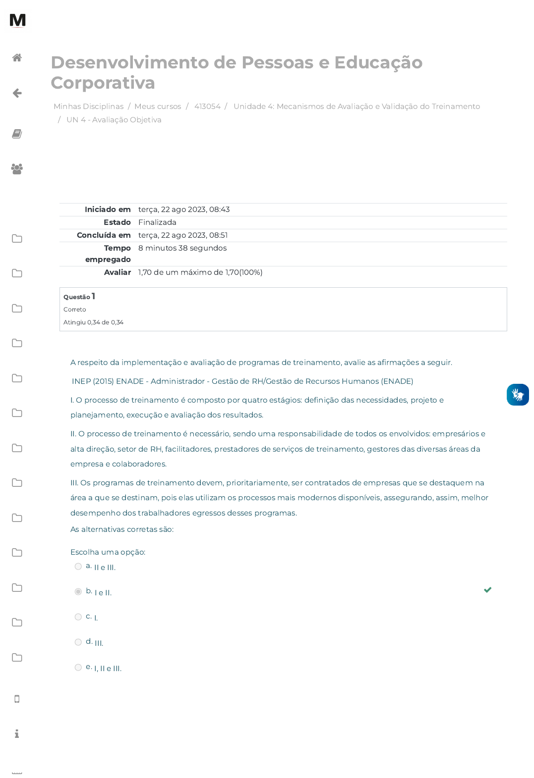 22/08/2023, 08:56 UN 4 - Avaliação Objetiva: Revisão da tentativa https://avap.multivix.edu.br/mod/quiz/review.php?attempt=3651734&cmid=1523967 1/4 Minhas Disciplinas / Meus cursos / 413054 / Unidade 4: Mecanismos de Avaliação e Validação do Treinamento / UN 4 - Avaliação Objetiva Desenvolvimento de Pessoas e Educação Corporativa Iniciado em terça, 22 ago 2023, 08:43 Estado Finalizada Concluída em terça, 22 ago 2023, 08:51 Tempo empregado 8 minutos 38 segundos Avaliar 1,70 de um máximo de 1,70(100%) Questão 1 Correto Atingiu 0,34 de 0,34 A respeito da implementação e avaliação de programas de treinamento, avalie as a�rmações a seguir. INEP (2015) ENADE - Administrador - Gestão de RH/Gestão de Recursos Humanos (ENADE) I. O processo de treinamento é composto por quatro estágios: de�nição das necessidades, projeto e planejamento, execução e avaliação dos resultados. II. O processo de treinamento é necessário, sendo uma responsabilidade de todos os envolvidos: empresários e alta direção, setor de RH, facilitadores, prestadores de serviços de treinamento, gestores das diversas áreas da empresa e colaboradores. III. Os programas de treinamento devem, prioritariamente, ser contratados de empresas que se destaquem na área a que se destinam, pois elas utilizam os processos mais modernos disponíveis, assegurando, assim, melhor desempenho dos trabalhadores egressos desses programas. As alternativas corretas são: Escolha uma opção: a. II e III. b. I e II. c. I. d. III. e. I, II e III. https://avap.multivix.edu.br/my/ https://avap.multivix.edu.br/course/view.php?id=23617 https://avap.multivix.edu.br/course/view.php?id=23617§ion=5 https://avap.multivix.edu.br/mod/quiz/view.php?id=1523967 https://avap.multivix.edu.br/my/ https://avap.multivix.edu.br/course/view.php?id=23617 https://avap.multivix.edu.br/user/index.php?id=23617 https://avap.multivix.edu.br/course/view.php?id=23617§ion=1 https://avap.multivix.edu.br/course/view.php?id=23617§ion=2 https://avap.multivix.edu.br/course/view.php?id=23617§ion=3 https://avap.multivix.edu.br/course/view.php?id=23617§ion=4 https://avap.multivix.edu.br/course/view.php?id=23617§ion=5 https://avap.multivix.edu.br/course/view.php?id=23617§ion=6 https://avap.multivix.edu.br/course/view.php?id=23617§ion=7 https://avap.multivix.edu.br/course/view.php?id=23617§ion=8 https://avap.multivix.edu.br/course/view.php?id=23617§ion=9 https://avap.multivix.edu.br/course/view.php?id=23617§ion=10 https://avap.multivix.edu.br/course/view.php?id=23617§ion=11 https://avap.multivix.edu.br/course/view.php?id=23617§ion=12 https://avap.multivix.edu.br/course/view.php?id=23617§ion=13 https://avap.multivix.edu.br/hooks/portal/ https://avap.multivix.edu.br/mod/page/view.php?id=1252%2F%22%20target%3D%22_blank https://avap.multivix.edu.br/calendar/view.php/ https://avap.multivix.edu.br/ 22/08/2023, 08:56 UN 4 - Avaliação Objetiva: Revisão da tentativa https://avap.multivix.edu.br/mod/quiz/review.php?attempt=3651734&cmid=1523967 2/4 Questão 2 Correto Atingiu 0,34 de 0,34 A e�cácia do treinamento é na medida em que o mesmo atenda as necessidades diagnosticadas. Ou seja, tudo depende primeiramente do diagnóstico, caso ele não seja correto ou su�ciente, in�uenciará negativamente no resultado do treinamento. No treinamento existe uma relação de instrução e aprendizagem. Instrução é o ensino de modo organizado de determinar uma atividade. Aprendizagem é a absorção do que foi instruído e incorporado ao comportamento. A respeito de métodos e técnicas de treinamento, é correto a�rmar que: Fundação para o vestibular da Universidade Estadual Paulista (VUNESP) 2016. Adaptada. Escolha uma opção: a. Não existem técnicas melhores ou piores em todas as circunstâncias, e sim técnicas mais adequadas ou menos adequadas, em função dos objetivos que se pretenda atingir. b. Para garantir bons resultados, é importante de�nir uma postura diante do treinamento (método), mas os procedimentos (técnicas) não precisam ser coerentes com a postura adotada. c. Trabalho em equipe, dramatização, experiência individual em laboratório, debates e jogos são diferentes meios ou técnicas, e devem ser utilizados somente em treinamentos comportamentais. d. Princípios universais de aprendizagem são impróprios para situações de sala de aula convencional ou para situações de treinamento. e. A população-alvo e as condições gerais (tempo, material, recursos humanos e �nanceiros disponíveis) são fatores pouco relevantes para a determinação dos métodos e técnicas de treinamento. https://avap.multivix.edu.br/my/ https://avap.multivix.edu.br/course/view.php?id=23617 https://avap.multivix.edu.br/user/index.php?id=23617 https://avap.multivix.edu.br/course/view.php?id=23617§ion=1 https://avap.multivix.edu.br/course/view.php?id=23617§ion=2 https://avap.multivix.edu.br/course/view.php?id=23617§ion=3 https://avap.multivix.edu.br/course/view.php?id=23617§ion=4 https://avap.multivix.edu.br/course/view.php?id=23617§ion=5 https://avap.multivix.edu.br/course/view.php?id=23617§ion=6 https://avap.multivix.edu.br/course/view.php?id=23617§ion=7 https://avap.multivix.edu.br/course/view.php?id=23617§ion=8 https://avap.multivix.edu.br/course/view.php?id=23617§ion=9 https://avap.multivix.edu.br/course/view.php?id=23617§ion=10 https://avap.multivix.edu.br/course/view.php?id=23617§ion=11 https://avap.multivix.edu.br/course/view.php?id=23617§ion=12 https://avap.multivix.edu.br/course/view.php?id=23617§ion=13 https://avap.multivix.edu.br/hooks/portal/ https://avap.multivix.edu.br/mod/page/view.php?id=1252%2F%22%20target%3D%22_blank https://avap.multivix.edu.br/calendar/view.php/ https://avap.multivix.edu.br/ 22/08/2023, 08:56 UN 4 - Avaliação Objetiva: Revisão da tentativa https://avap.multivix.edu.br/mod/quiz/review.php?attempt=3651734&cmid=1523967 3/4 Questão 3 Correto Atingiu 0,34 de 0,34 Questão 4 Correto Atingiu 0