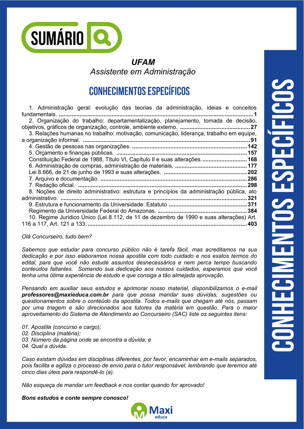1 UFAM Assistente em Administração 1. Administração geral: evolução das teorias da administração, ideias e conceitos fundamentais. .......................................................................................................................... 1 2. Organização do trabalho: departamentalização, planejamento, tomada de decisão, objetivos, gráficos de organização, controle, ambiente externo. ............................................ 27 3. Relações humanas no trabalho: motivação, comunicação, liderança, trabalho em equipe, a organização informal. ......................................................................................................... 91 4. Gestão de pessoas nas organizações. ........................................................................ 142 5. Orçamento e finanças públicas. .................................................................................. 157 Constituição Federal de 1988, Título VI, Capítulo II e suas alterações. ............................ 168 6. Administração de compras, administração de materiais, ............................................. 177 Lei 8.666, de 21 de junho de 1993 e suas alterações. .................................................... 202 7. Arquivo e documentação. ............................................................................................ 286 7. Redação oficial. .......................................................................................................... 298 8. Noções de direito administrativo: estrutura e princípios da administração pública, ato administrativo. ..................................................................................................................... 321 9. Estrutura e funcionamento da Universidade: Estatuto ................................................. 371 Regimento da Universidade Federal do Amazonas. ........................................................ 384 10. Regime Jurídico Único (Lei 8.112, de 11 de dezembro de 1990 e suas alterações) Art. 116 a 117, Art. 121 a 133. .................................................................................................... 403 Olá Concurseiro, tudo bem? Sabemos que estudar para concurso público não é tarefa fácil, mas acreditamos na sua dedicação e por isso elaboramos nossa apostila com todo cuidado e nos exatos termos do edital, para que você não estude assuntos desnecessários e nem perca tempo buscando conteúdos faltantes. Somando sua dedicação aos nossos cuidados, esperamos que você tenha uma ótima experiência de estudo e que consiga a tão almejada aprovação. Pensando em auxiliar seus estudos e aprimorar nosso material, disponibilizamos o e-mail professores@maxieduca.com.br para que possa mandar suas dúvidas, sugestões ou questionamentos sobre o conteúdo da apostila. Todos e-mails que chegam até nós, passam por uma triagem e são direcionados aos tutores da matéria em questão. Para o maior aproveitamento do Sistema de Atendimento ao Concurseiro (SAC) liste os seguintes itens: 01. Apostila (concurso e cargo); 02. Disciplina (matéria); 03. Número da página onde se encontra a dúvida; e 04. Qual a dúvida. Caso existam dúvidas em disciplinas diferentes, por favor, encaminhar em e-mails separados, pois facilita e agiliza o processo de envio para o tutor responsável, lembrando que teremos até cinco dias úteis para respondê-lo (a). Não esqueça de mandar um feedback e nos contar quando for aprovado! Bons estudos e conte sempre conosco! 1571043 E-book gerado especialmente para MARIA MERCEDES MOURA MARTINS 1 EVOLUÇÃO DAS TEORIAS DA ADMINISTRAÇÃO A administração evoluiu através dos séculos: - 3000 a.C., na Mesopotâmia, a civilização suméria apresentou os primeiros dirigentes e funcionários administrativos profissionais, que realizavam a escrituração de operações comerciais; - A construção das pirâmides do Egito, no século XXVI a.C., evidenciaram planejamento, organização e controle sofisticados; - No século IV a.C., na China, Sun-Tzu prescreveu princípios de estratégia e comportamento gerencial; - No século III a.C., o Exército romano, conhecido como a instituição militar mais efetiva e duradoura da história, foi um modelo para os exércitos dos séculos seguintes e influenciou outros tipos de organizações. - No século XVIII, a Revolução Industrial influenciou a produção e a aplicação dos conhecimentos administrativos. No decorrer do tempo, as experiências práticas das organizações geraram “as teorias da administração”, que são conhecimentos organizados e produzidos por essas experiências. A Abordagem Clássica da Administração ou Escola Clássica engloba a Administração Científica, a Teoria Clássica e a Teoria da Burocracia1. ADMINISTRAÇÃO CIENTIFICA A Revolução Industrial transformou as cidades, as relações de trabalho e o processo produtivo. Os comerciantes reuniram trabalhadores em galpões para exercer maior controle sobre seu desempenho, assim surgiram as fábricas e as primeiras empresas industriais. A emigração da área rural para os centros industriais das cidades originou novas necessidades de administração pública (infraestrutura como saneamento básico, moradia, serviços de saúde etc.), a f igura do artesão foi substituída pelo operário especializado. O artesão conhecia e participava de todo o processo produtivo, já o operário especializado trabalhava de acordo com a divisão do trabalho, ou seja, o operário era treinado e capacitado para executar apenas uma tarefa específica, como aparafusar um assento de bicicleta. De acordo com os teóricos da Administração Científica era mais fácil treinar os funcionários para uma especialidade, do que treiná-los para montar uma bicicleta inteira. Além da especialização dos operários, destaca-se um novo tipo de processo produtivo: o da produção em massa. A partir das primeiras m