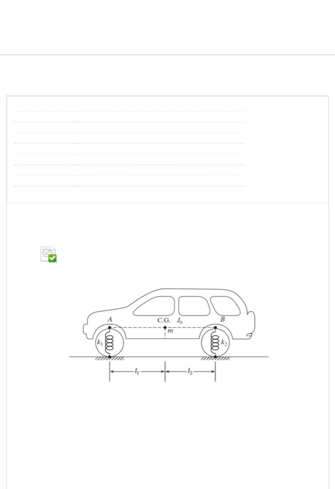 22/08/2023, 14:43 Revisar envio do teste: QUESTIONÁRIO UNIDADE II – ... https://ava.ead.unip.br/webapps/assessment/review/review.jsp?attempt_id=_96654998_1&course_id=_302183_1&content_id=_3547666_1&retur… 1/6 Revisar envio do teste: QUESTIONÁRIO UNIDADE II VIBRAÇÕES MECÂNICAS D85F_15302_R_20232 CONTEÚDO Usuário PATRICK MARCOS G MOREIRA Curso VIBRAÇÕES MECÂNICAS Teste QUESTIONÁRIO UNIDADE II Iniciado 22/08/23 14:40 Enviado 22/08/23 14:43 Status Completada Resultado da tentativa 2,5 em 2,5 pontos Tempo decorrido 3 minutos Resultados exibidos Respostas enviadas, Perguntas respondidas incorretamente Pergunta 1 Resposta Selecionada: b. A �gura a seguir representa um sistema de quantos graus de liberdade? 2. Pergunta 2 CONTEÚDOS ACADÊMICOS BIBLIOTECAS MURAL DO ALUNOUNIP 0,25 em 0,25 pontos 0,25 em 0,25 pontos http://company.blackboard.com/ https://ava.ead.unip.br/webapps/blackboard/execute/courseMain?course_id=_302183_1 https://ava.ead.unip.br/webapps/blackboard/content/listContent.jsp?course_id=_302183_1&content_id=_3535837_1&mode=reset https://ava.ead.unip.br/webapps/portal/execute/tabs/tabAction?tab_tab_group_id=_25_1 https://ava.ead.unip.br/webapps/portal/execute/tabs/tabAction?tab_tab_group_id=_27_1 https://ava.ead.unip.br/webapps/portal/execute/tabs/tabAction?tab_tab_group_id=_47_1 https://ava.ead.unip.br/webapps/portal/execute/tabs/tabAction?tab_tab_group_id=_49_1 https://ava.ead.unip.br/webapps/login/?action=logout 22/08/2023, 14:43 Revisar envio do teste: QUESTIONÁRIO UNIDADE II – ... https://ava.ead.unip.br/webapps/assessment/review/review.jsp?attempt_id=_96654998_1&course_id=_302183_1&content_id=_3547666_1&retur… 2/6 Resposta Selecionada: d. No sistema ilustrado a seguir, as duas polias são leves e sem atrito. A polia superior tem eixo �xo. A polia inferior está ligada a uma mola de rigidez k = 8,0 kN/m. A mola é ancorada ao piso. Um �o ideal (leve, �exível e inextensível) que passa pelas polias e não escorrega em relação às mesmas liga-se a um bloco de massa m = 10,0 kg e ao teto. A partir da posição de equilíbrio, descola-se o bloco de a0 = 0,3 m e o abandona em repouso. Determine a fase inicial do movimento. Qual a frequência de vibração do sistema? 14,4 rad/s. Pergunta 3 No sistema ilustrado a seguir, as duas polias são leves e sem atrito. A polia superior tem eixo �xo. A polia inferior está ligada a uma mola de rigidez k = 8,0 kN/m. A mola é ancorada ao piso. Um �o ideal (leve, �exível e inextensível) que passa pelas polias e não escorrega em relação às mesmas liga-se a um bloco de massa m = 10,0 kg e ao teto. A partir da posição de equilíbrio, descola-se o bloco de a0 = 0,3 m e o abandona em repouso. Qual a energia mecânica do sistema? 0,25 em 0,25 pontos 22/08/2023, 14:43 Revisar envio do teste: QUESTIONÁRIO UNIDADE II – ... https://ava.ead.unip.br/webapps/assessment/review/review.jsp?attempt_id=_96654998_1&course_id=_302183_1&content_id=_3547666_1&retur… 3/6 Resposta Selecionada: b. 90 J. Pergunta 4 Resposta Selecionada: e. No sistema ilustrado a seguir, a polia de eixo �xo possui raio R = 0,3 m, momento de inércia em relação ao seu centro I = 0,113 kg.m2, gira livremente (sem atrito). Um �o ideal (leve, �exível e inextensível) que passa pela polia e não escorrega em relação à mesma liga-se a um bloco de massa m = 1,5 kg. Outro �o de mesmas características liga o ponto da polia distante d = 0,2 m de seu centro a uma mola de rigidez k = 1.000 N/m. A mola é ancorada a uma parede. A partir da posição de equilíbrio, descola-se o bloco de a0 = 0,01 m e o abandona em repouso. Qual a pulsação do movimento? 12,7 rad/s. Pergunta 5 No sistema ilustrado a seguir, a polia de eixo �xo possui raio R = 0,3 m, momento de inércia em relação ao seu centro I = 0,113 kg.m2, gira livremente (sem atrito). Um �o ideal (leve, �exível e inextensível) que passa pela polia e não escorrega em relação à mesma liga-se a um bloco de massa m = 1,5 kg. Outro �o de mesmas características liga o ponto da polia distante d = 0,2 m de seu centro a uma mola de rigidez k = 1.000 N/m. A mola é ancorada a uma parede. A partir da posição de equilíbrio, descola-se o bloco de a0 = 0,01 m e o abandona em repouso. Qual a energia mecânica do movimento? 0,25 em 0,25 pontos 0,25 em 0,25 pontos 22/08/2023, 14:43 Revisar envio do teste: QUESTIONÁRIO UNIDADE II – ... https://ava.ead.unip.br/webapps/assessment/review/review.jsp?attempt_id=_96654998_1&course_id=_302183_1&content_id=_3547666_1&retur… 4/6 Resposta Selecionada: a. 0,022 J. Pergunta 6 Resposta Selecionada: a. No sistema ilustrado a seguir, a polia de eixo �xo possui raio R = 0,3 m, momento de inércia em relação ao seu centro I = 0,113 kg.m2, gira livremente (sem atrito). Um �o ideal (leve, �exível e inextensível) que passa pela polia e não escorrega em relação à mesma liga-se a um bloco de massa m = 1,5 kg. Outro �o de mesmas características liga o ponto da polia distante d = 0,2 m de seu centro a uma mola de rigidez k = 1.000 N/m. A mola é ancorada a uma parede. A partir da posição de equilíbrio, descola-se o bloco de a0 = 0,01 m e o abandona em repouso. Qual a equação horária do movimento? y¨ + 161,29 ⋅ y = 0. Pergunta 7 Um canhão possui cano com massa de 700 kg, cujo recuo se faz por meio de um sistema com mola e amortecedor. Sabendo que a rigidez da mola é de 80.000 N/m, determine a rigidez equivalente do sistema em kN.m. 0,25 em 0,25 pontos 0,25 em 0,25 pontos 22/08/2023, 14:43 Revisar envio do teste: QUESTIONÁRIO UNIDADE II – ... https://ava.ead.unip.br/webapps/assessment/review/review.jsp?attempt_id=_96654998_1&course_id=_302183_1&content_id=_3547666_1&retur… 5/6 Resposta Selecionada: b. 80. Pergunta 8 Resposta Selecionada: e. Um canhão possui cano com massa de 700 kg, cujo recuo se faz por meio de um sistema com mola e amortecedor. Sabendo que a rigidez da mola é de 80.000 N/m, determine a frequência a