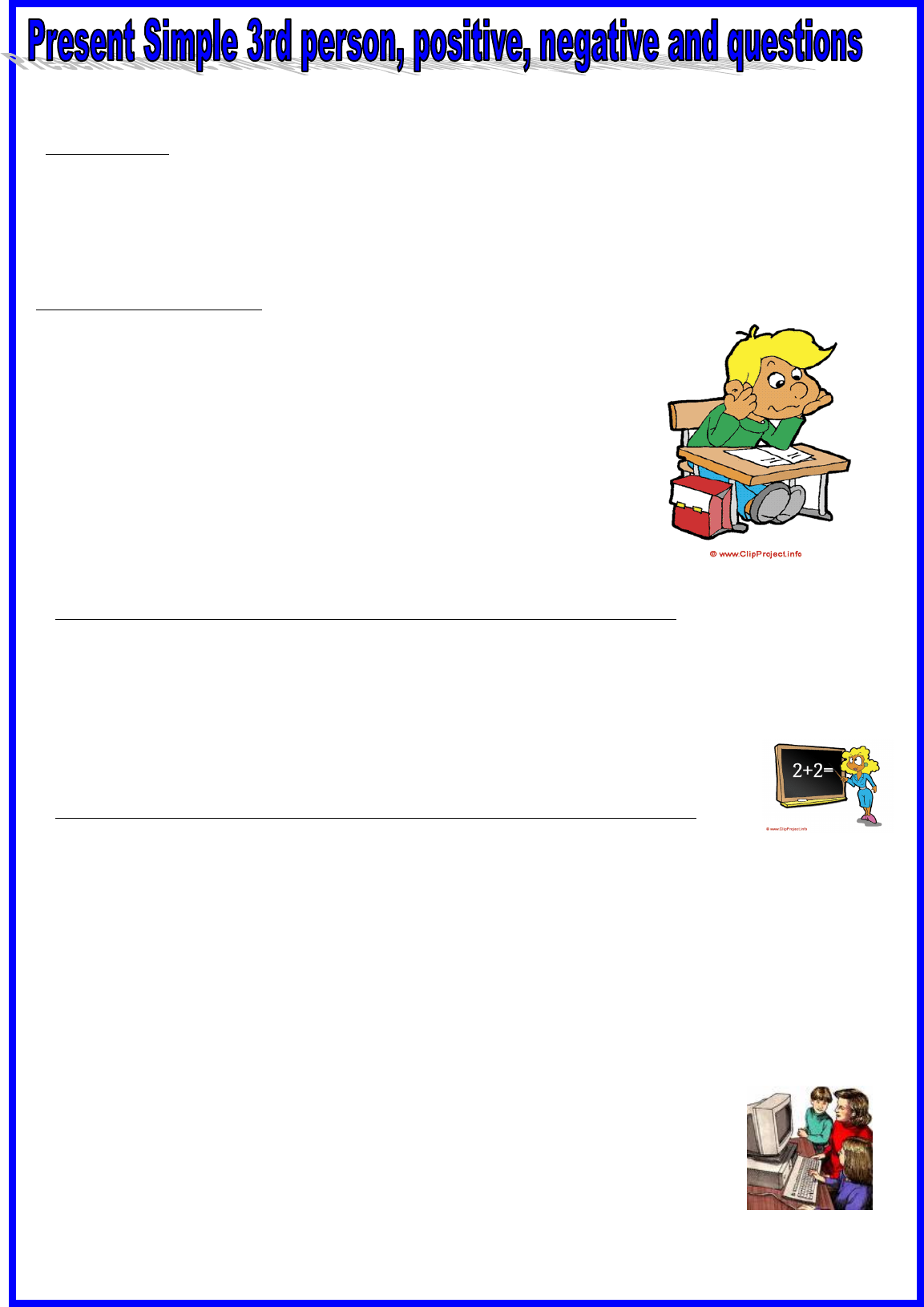 I. Write the 3rd person singular of the verbs: 1. I join - he joins 2. I like - he ………… 3. I kiss - he ……………. 4. I fly - he ……………. 5. I watch - he ………… 6. I enjoy - he ……………. 7. I talk - he ……………. 8. I go - he ………… 9. I teach - he …………… 10. I buy - she …………… 11. I finish - she ……….. 12. I cry - she …………… II. Use the verbs in brackets to complete the sentences, as in the example: 1. I ..live.. (live) in Edinburgh. 2. He ………. (do) his homework every evening. 3. She’s a teacher. She ……….. (work) at primary school. 4. “Are you a singer?” “No, I’m a pilot. I ………….. (fly) aeroplanes. 5. Joan …………. (wash) her hair every day. 6. The museum …………….. (close) at seven in the evening. 7. Daniel ……………. (brush) his teeth every morning. 8. She ……………... (study) Science at university. 9. Every Saturday, Paul …………… (give) his dog a bath. 10. In the mornings, Betty …………… (take) her sister to school. 11. We ……… (go) to the swimming pool at the weekend. 12. John and Mary ………… (have) a cup of tea in the afternoon. III. Use the prompts to write sentences, as in the example: 1. he / every day / work / on the computer → He works on the computer every day. 2. Susana / at the weekend / do her laundry → …………………………………………………………. 3. My friends and I / at the weekend / go fishing → ……………………………………………………. 4. he / every morning / read the newspaper → ………………………………………………………….. 5. Sharon / exercise / in the morning → ………………………………………………………………… 6. dinner / they / at 7:30 / eat → ………………………………………………………………………… IV. Write questions and negations as in the example. 1. Tom lives in England. → Does Tom live in England? Tom doesn’t live in England. 2. Mr Simpson teaches Chemistry. →………………………………………………………………….. 3. You like playing computer games. → ………………………………………………………………. 4. John and Sue work in a café. → …………………………………………………………………….. 5. We do the shopping on Saturdays. → ………………………………………………………………. 6. The baby cries all the time. → ………………………………………………………………………. V. Fill in do / don’t, does / doesn’t. 1. Sam speaks French, but he ……. Speak Russian. 2. Ann …… like jazz music but she likes pop music. 3. “…….. she play the saxophone?” “No, she ……”. 4. Where ….. you work? 5. He …….. go to school on Sunday. 6. What …... you have for dinner? VI. Match the questions to the answers. 1. What time does she get up? A. She goes to bed at 10:00. 2. How does she go to school? B. She walks to school. 3. Does she have breakfast every day? C. She gets up at 7:00. 4. What does she do in the afternoon? D. No, she doesn’t. 5. When does she go to bed? E. She does her homework. ☺ Good luck ☺ iSLCollective.com