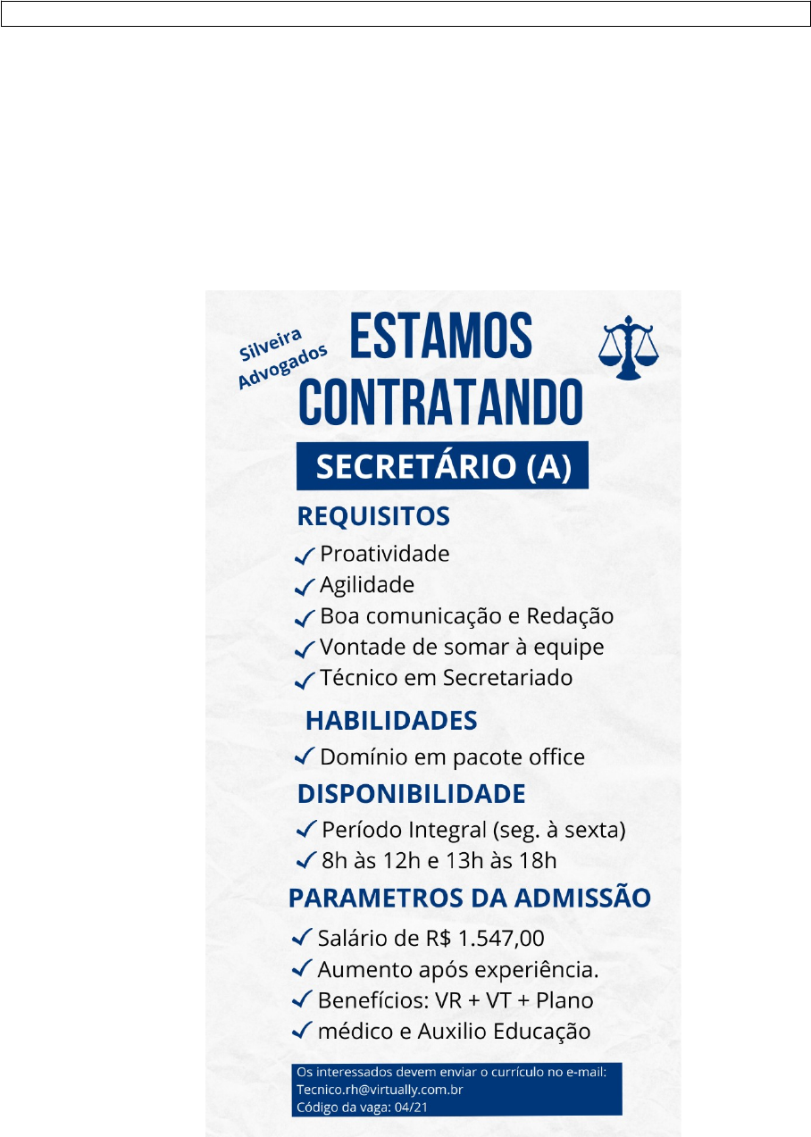Atividade 1 UC 2 – Recrutamento, seleção e ambientação Nome do estudante: Mayane Cardoso Valerio 1. Anúncio da vaga (post) Analise a requisição de pessoal enviada pelo escritório Silveira Advogados e, com base nas informações do documento, elabore um post (anúncio) para que possa ser divulgado nas redes sociais, como LinkedIn, Instagram e Facebook, para a vaga em aberto. Use sua criatividade (PowerPoint, Canva ou outro aplicativo de sua preferência). 2. Etapas do processo seletivo Cite e descreva as etapas do processo seletivo específicas para a vaga do anúncio (por exemplo: tipo de entrevista, testes, dinâmicas etc.) e explique detalhadamente os objetivos de cada uma das etapas escolhidas. Será realizada 2 entrevistas. A primeira entrevista a ser realizada é a Entrevista Técnica: O objetivo dessa avaliação é confirmar a experiência e proficiência de um candidato na área do secretariado, como domínio de softwares específicos e o pacote office. A segunda entrevista é a Comportamental: Essa entrevista ajuda a mapear o perfil se comportamental e ajuda a entender se a pessoa é a melhor candidata para o cargo em questão, além de orientar planos futuros de treinamento e desenvolvimento de cada novo colaborador.