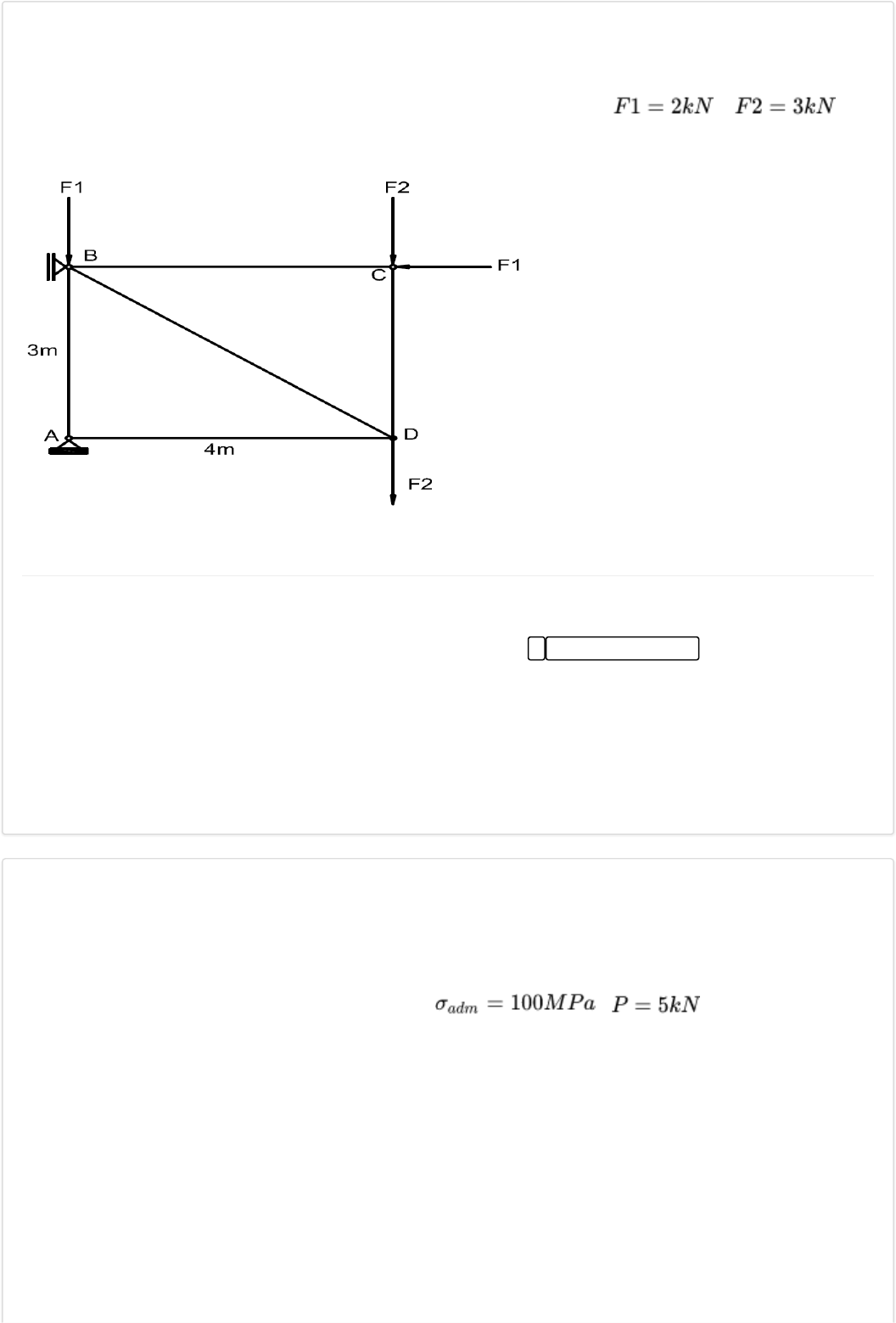 22/08/2023, 17:00 Colaborar - Av1 - Resistência dos Materiais https://www.colaboraread.com.br/aluno/avaliacao/index/2386791307?atividadeDisciplinaId=9862162 1/4 ) a) b) c) d) e) 2) "Treliça é uma estrutura de membros esbeltos conectados entre si em suas extremidades". No encontro destes elementos tem-se os nós. Para uma treliça com carregamento em seus nós, as barras apresentarão forças internas normais, podendo ser de compressão ou de tração. Para a treliça apresentada na figura, sabendo a intensidade das forças e , quais devem ser as forças internas nas barras AB, AD, BD, BC e CD, respectivamente? Figura - Treliça Fonte: Elaborado pelo autor (2017) Alternativas: 8kN; 8kN; 10kN; 2kN; 3kN. Apenas a barra BD traciona. Alternativa assinalada 8kN; 10kN; 8kN; 2kN; 3kN. Apenas a barra BD comprime. 8kN; 8kN; 12kN; 2kN; 3kN. Todas as barras comprimem. 8kN; 10kN; 8kN; 2kN; 3kN. Todas as barras tracionam. 8kN; 12kN; 8kN; 2kN; 3kN. Apenas BC e CD tracionam. A resistência dos materiais é uma disciplina onde se estuda a capacidade de um corpo resistir a um carregamento. A partir disso, estruturas são dimensionadas pré-determinando a forma e o carregamento que atenda a um projeto, assim pode-se adotar um material com uma tensão conhecida para dimensionar a geometria da peça. Para a estrutura apresentada na figura a seguir, determine o diâmetro mínimo das cordas AB e BC, respectivamente, sabendo que ambas podem ter e . Figura - Estrutura. 22/08/2023, 17:00 Colaborar - Av1 - Resistência dos Materiais https://www.colaboraread.com.br/aluno/avaliacao/index/2386791307?atividadeDisciplinaId=9862162 2/4 a) b) c) d) e) 3) a) b) c) d) e) Alternativas: 7,7 mm e 7,4 mm 5,3 mm e 5,5 mm 7,4 mm e 7,7 mm Alternativa assinalada 5,5 mm e 5,3 mm 6,4 mm e 6,6 mm É comum que determinados pontos ao longo do comprimento longitudinal das estruturas apresentem variação da área de seção transversal, e também as barras podem sofrer outros carregamentos externos ao longo da barra. Assim deve-se analisar em qual seção transversal há uma tensão máxima. A figura a seguir apresenta um cabo de 60 mm de diâmetro carregado por duas forças, 2P e P. O apoio A é móvel e o B é fixo. Sabendo que a tensão normal máxima permitida do material é de 50 MPa, qual o valor da máxima carga P o sistema? Figura - Cabo Alternativas: 141,37 kN 70,68 kN 65,37 kN 54,26 kN 47,12 kN Alternativa assinalada 22/08/2023, 17:00 Colaborar - Av1 - Resistência dos Materiais https://www.colaboraread.com.br/aluno/avaliacao/index/2386791307?atividadeDisciplinaId=9862162 3/4 4) a) b) c) d) e) 5) A tensão de cisalhamento é um tipo de tensão gerada devido a aplicação, na seção transversal de um material, de forças de mesma direção, porém com sentido contrário, proporcionando no material uma deformação ou corte. Este tipo de esforço é muito comum em elementos de ligação de estruturas. A figura a seguir apresenta a ligação de duas barras tracionadas. Sabendo que a intensidade de tração nas barras é de 5 kN, qual é a tensão de cisalhamento no pino A que possui diâmetro de 25 mm? Figura - Ligação Alternativas: 10,18 MPa 8,19 MPa 7,07 MPa 5,09 MPa Alternativa assinalada 3,98 MPa Nas ligações das estruturas, os parafusos, rebite e pino, além de sofrerem tensões de cisalhamento na ligação, estes podem proporcionar tensões de esmagamento no contato com a superfície das barras que estão conectadas. Para este tipo de tensão, também é considerado o valor médio. Para o parafuso apresentado na figura, calcule a tensão de esmagamento atuante na arruela do parafuso, sabendo que há uma folga de 2 mm entre a arruela e o parafuso. Figura - Parafuso Fonte: Hibbeler (2010, p.45) 22/08/2023, 17:00 Colaborar - Av1 - Resistência dos Materiais https://www.colaboraread.com.br/aluno/avaliacao/index/2386791307?atividadeDisciplinaId=9862162 4/4 a) b) c) d) e) Alternativas: 110,10 MPa 55,45 MPa 45,47 MPa 41,92 MPa Alternativa assinalada 4,72 MPa