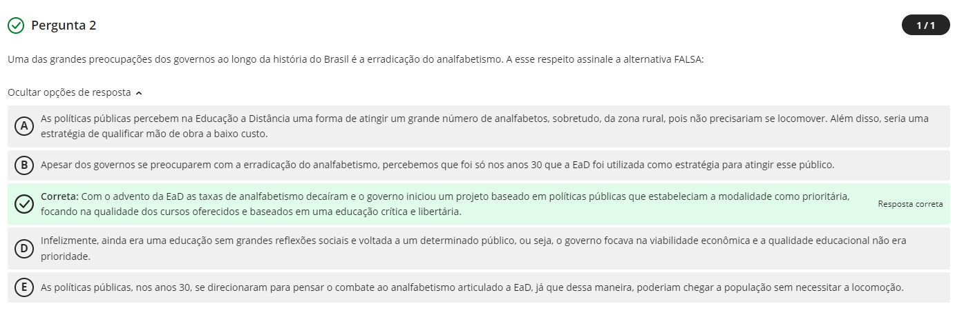 a) As políticas públicas percebem na Educação a Distância uma forma de atingir um grande número de analfabetos, sobretudo, da zona rural, pois não precisariam se deslocar. b) Apesar dos governos se preocuparem com a erradicação do analfabetismo, percebemos que foi só nos anos 30 que a EaD foi utilizada como estratégia para atingir esse público. c) Com advento da EaD as taxas de analfabetismo decaíram e o governo iniciou um projeto baseado em políticas públicas que estabeleciam a modalidade como prioritária, focando na qualidade dos cursos oferecidos e baseados em uma educação crítica e reflexiva. d) Infelizmente, ainda era uma educação sem grandes reflexões sociais e voltada a um determinado grupo, ou seja, o governo focava na viabilidade econômica e a qualidade educacional não era prioridade. e) As políticas públicas, nos anos 30, se direcionaram para pensar o combate ao analfabetismo articulado à EaD, já que dessa maneira, poderiam chegar à população sem necessitar de locomoção.