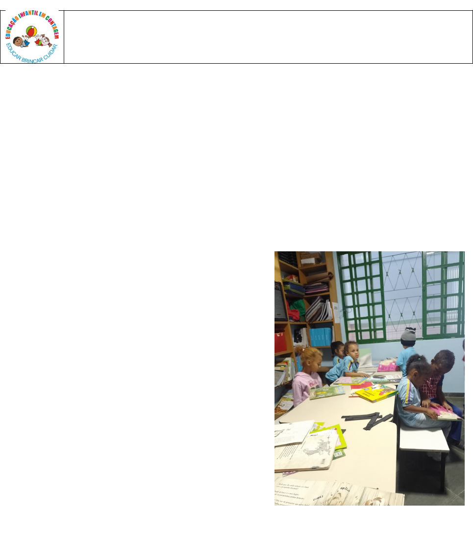 CEMEI – Vila Esperança - Nosso Lar Rua VL 38, nº 90 – Bairro: Nova Contagem Contagem/MG – Cep: 32.050-020 / Tel: (31) 3356-7370 ATIVIDADES Turma: O SAPO NÃO LAVA O PÉ Idade: 5 ANOS Ano Letivo: 2023 Professora: MARTA LOPES SILVA CONTAÇÃO DE HISTÓRIA (BIBLIOTECA) Contar histórias promove o desenvolvimento de importantes habilidades, ainda na fase da primeira infância. Todas essas habilidades têm uma estreita ligação com os cinco campos de experiência propostos pela BNCC (Base Nacional Comum Curricular) para a Educação Infantil. O que diz Paulo Freire sobre a contação de história? A contação de história pode ser um ato de libertação, se cada conto e reconto for momento de diálogo aberto e crítico com compromisso e responsabilidade de formação de um ser humano digno, fraterno e justo. Enquanto se conta, são feitas perguntas sobre o enredo, personagens e as características do cenário. Depois da contação, pergunta- se quem quer recontar a história para os colegas. A análise de dados é realizada através de fotografias e anotações que são feitas durante a realização da atividade. A leitura estimula a criatividade e a imaginação, a criança aprende a interpretar textos e a desenvolver seu senso crítico, a leitura transporta a criança para uma realidade diferente da dela, o que ajuda a desenvolver empatia e consciência do seu papel como cidadã. CEMEI – Vila Esperança - Nosso Lar Rua VL 38, nº 90 – Bairro: Nova Contagem Contagem/MG – Cep: 32.050-020 / Tel: (31) 3356-7370 ATIVIDADES Turma: O SAPO NÃO LAVA O PÉ Idade: 5 ANOS Ano Letivo: 2023 Professora: MARTA LOPES SILVA PINTURA COM CANUDINHO (SALA E ARTE) O objetivo da atividade com a técnica de pintura soprada é desenvolver o conhecimento das cores e percepção de formas, além de exercitar o controle respiratório. Além de estimular os sentidos, auxilia no desenvolvimento da coordenação motora, incentiva na percepção das cores e desenvolve a parte da criatividade, pelo fato da expressão artística estar ligada totalmente à imaginação. Este é um tipo de pintura muito interessante e que as crianças costumam adorar já que elas podem fazer diversos tipos de arte com esquemas de cores diferentes. Nenhuma obra sairá completamente igual a outra e as crianças ao final da aula poderão contar o que acharam da experiência. Campos de Experiência: Traços, sons, cores e formas; corpo, gestos e movimentos; espaços, tempos, quantidades, relações e transformações.