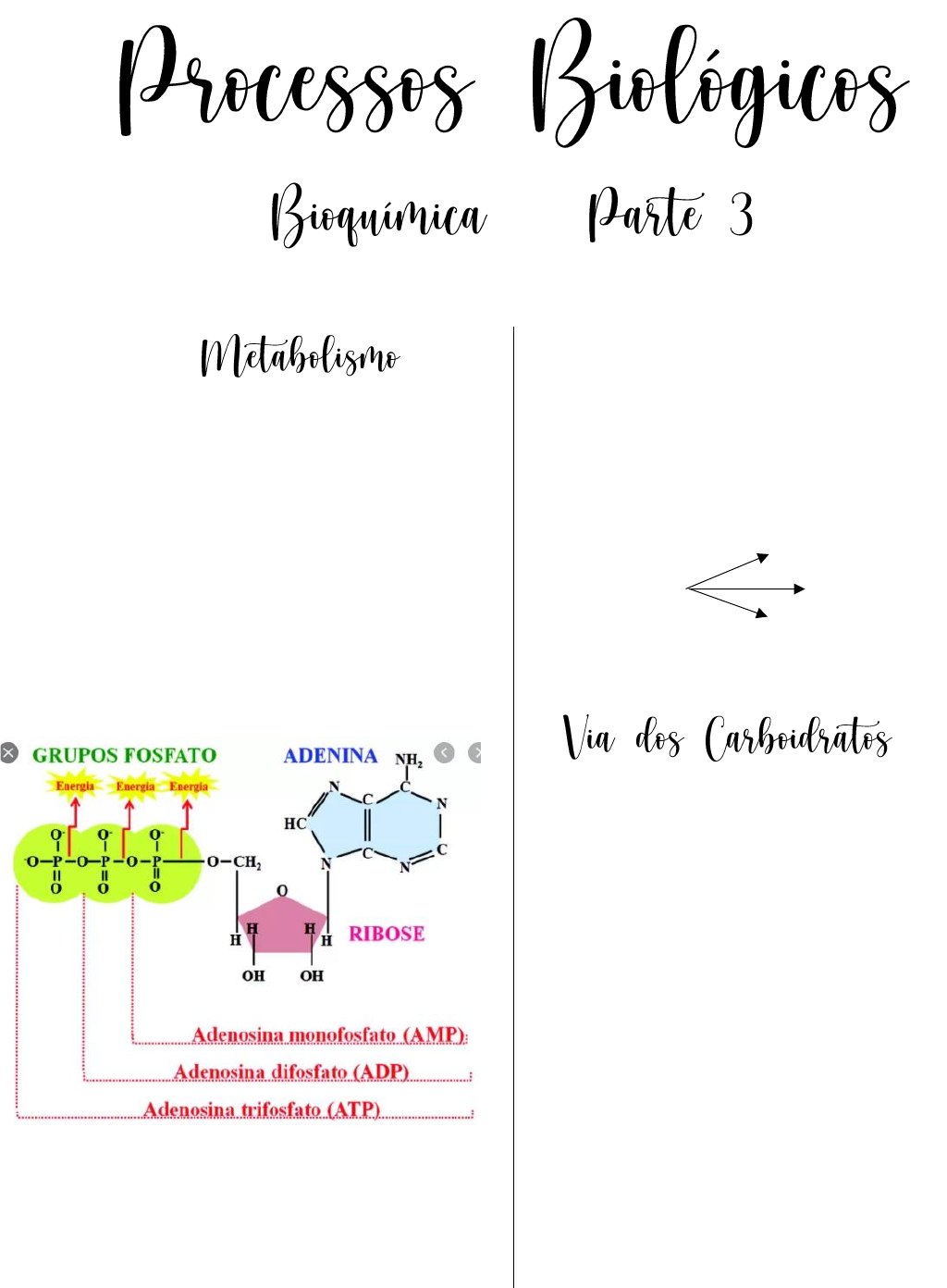 | → Conjunto de reações químicas que visam a produção de ATP → Vias metabólicas: reações quími- cas que ocorrem para a produ- ção de energia → ATP: adenosina trifosfato (nucleotídeo com mais Fosfato) Quebra de ligação entre P / doar um P = doar uma energia → Energia: é usada para movi- mento, síntese e transporte ativo, relacionado diretamente com a sobrevivência e reações biológicas Carboidratos Metabolismo Lipídeos (via metabólica) Aminoácidos Via metabólica através dos Carboidratos → Respiração celular (pois há ga- ses na reação) Baseia-se na oxidação do carbono, precisa do oxigênio da inspiração Resulta CO2 (liberado pelo pulmão na expiração), H2O e energia → Etapas: 1. Digestão e absorção dos carboidratos (antes) 2. Glicólise 3. Ciclo de Krebs 4. Cadeia respiratória Antecedente Digestão e absorção dos carboidra- tos em forma de monossacarídeos o Monossacarídeos: carboidrato absorvível pela célula do in- testino, exemplo: glicose, fru- tose e galactose 1. Ato mecânico: mastigação Glândula salivar emite a enzima ami- lase salivar para início da quebra de ligações glicosídicas do polissacarí- deos amido → maltose 2. No estomago A enzima amilase salivar é desativada pelo pH ácido Pâncreas libera a enzima amilase pancreática 3. No duodeno: primeira parte do intestino Liberação das enzimas finais, ou seja, as enzimas específicas para a ultima quebra de ligações do dissa- carídeos, como a sacarase, lactase e maltase, formando monossacarí- deos, podendo ser absorvidos pela células intestinais por transporte ativo ou difusão simples → Transporte ativo: há uma força sendo exercida sob a molécula, tendo gasto de energia – Bomba de Na e K. → Difusão facilitada: (90%) por meio de proteínas carregadora – GLUT (exemplo: GLUT 4 em uma célula muscular), precisa de uma sinalização para “liberar” a passagem da molécula Insulina: hormônio proteico li- berado pelo pâncreas, que emite sinalização através do receptor da insulina, para abertura da GLUT Hiperglicêmico: baixa produ- ção de insulina, aumentando a glicemia pois aumenta a quan- tidade de glicose do sangue e diminui a quantidade de gli- cose da célula DIABETE TIPO 1 → Objetivo: é importante ter etapas para a quebra da glicose, para re- tirar energia por partes da que- bra de ligações, e NÂO causar aquecimento e alta dispersão de energia Quebra da glicose → Glicose com 6C 2 piruvatos com 3C → Acontece no citosol – onde está a glicose após absorção → Possui 2 fases Primeira fase Fase preparatória / investimento energético (há gasto de 2 ATP) 1) Glicose Glicose 6 – Fosfato o Enzima: Hexoquinase Enzima quinase: trans- ferência de P P no lugar do H no car- bono 6 o O P veio de uma molécula de ATP = gasto de energia, libe- rando ADP 2) Glicose 6-Fosfato Frutose 6-Fosfato o Enzima: Fosfoglicose Isome- rase Enzima isomerase: al- tera isômeros, a geo- metria da molécula Transformando uma glicose em frutose para aumentar a sime- tria da quantidade de carbono da molécula ao meio o Isômeros – C6H11O6P = sem perda de átomos 3) Frutose 6-Fosfato Frutose 1,6-Fosfato o Enzima: Fosfofruquinase Enzima quinase: trans- ferência de P Adiciona P no carbono 1 o Utiliza OUTRA molécula de ATP = gasto de energia, libe- rando ADP (segundo) o Deixa o molécula totalmente simétrica ATP (adenosina trifosfato) Após gasto de energia = 1 P ADP (adenosina bifosfato) 4. Frutose 1,6-Fosfato 1 -Di-hidroxiacetona fosfato 2- Gliceraldeído 3 – fosfato o Enzima: Aldose Quebra a molécula no meio, em duas o Resulta em duas moléculas idênticas numericamente (isô- meros): C3H5O3P – se dife- renciam pela =O o Gliceraldeído 3-fosfato conti- nua na glicólise 5. Di – hidroxiacetona Gliceraldeído 3-fosfato o Enzima: triose fosfato isome- rase → A primeira fase da glicólise re- sulta: 2x Gliceraldeído 3-fosfato (3C) 1. Quebra da frutose 2. Conversão da di-hidroxiacetona fosfato 1 Glicose + 2ATPs 2 Gliceraldeído 3-fosfato (3C) + 2ADPs Segunda Fase Fase de pagamento energético → Tudo acontece por duas vezes, pois há 2x gliceraldeído 3 – fos- fato 6. Gliceraldeído 3-fosfato 1,3 -bifosfatoglicerato o Enzima: gliceraldeído 3-fos- fato desidrogenase o Pi: Pinorgânico, doado pelo ci- tosol – SEM GASTO DE ENERGIA o NAD+ NADH+ + H+ Vão para a mitocôndria H+ = acompanhante doado pelo citosol NAD+ (Dinucleótido de nicoti- namida e adenina) é uma co- enzima transportadora de íons H+ o Entra 2x NAD+ e sai dois NADH 7. 1,3 – bifosfatoglicerato 3- fosfoglicerato o Enzima: fosfoglicertato qui- nase quinase: transfere P Tira para os 2x ADPs da primeira fase que estão no citosol o Recarrega os dois ADPs usa- dos na primeira fase, transfor- mando-o em ATPs – paga- mento da dívida, produção de dois ATPs 8. 3- fosfoglicertato 2 – fosfoglicerato o Enzima: fosfoglicertato mu- tase Mutase: mutação, mu- dança da posição do C3 para o C2 9. 2- fosfoglicerato Fosfonolpiruvato (+ H2O) o Enzima: enolase Desidratação o Perde 2x água (H2O) 10. Fosfoglicertato Piruvato o Enzima: piruvato quinase Transferência de P para dois ADPs o Forma 2x ATPs - colocando o P nos ADPs soltos no citosol ou que já foi gasto a energia dele. o Há produção de duas energia → A segunda fase da glicólise re- sulta: 2x Piruvatos (3C) 4x ATPs - 2x foram gastos na primeira fase 2x são o lucro energético da glicólise 1x H2O 2 Gliceraldeído 3-fosfato + 2NAD+ + 4ADPs 2 piruvatos + 2NADH + 4ATPs + 2H2O • H2O: permanecem na célula, no citoplasma • 4APTs – 2ATPs: vão ser gastos • NADH: vão para a mitocôn- dria • Piruvato: Dependente da alteração de O2, do citosol vão para: o Se ter oxigênio: glicó- lise aeróbica – vão para a mitocôndria e continuam o ciclo de Krebs o Se a célula estiver sem oxigênio: glicólise anae- róbica – fermentação Piruvato fica no citosol Fermentação: glicólise anaeróbica → Alcoólica
