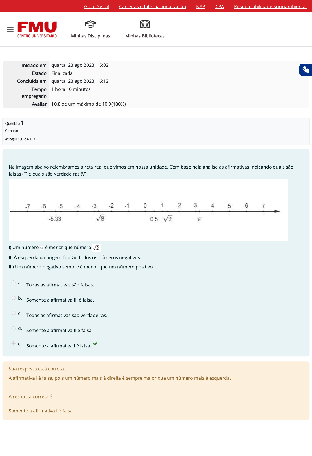 Questão 1 Correto Atingiu 1,0 de 1,0 Na imagem abaixo relembramos a reta real que vimos em nossa unidade. Com base nela analise as a�rmativas indicando quais são falsas (F) e quais são verdadeiras (V): I) Um número é menor que número II) À esquerda da origem �carão todos os números negativos III) Um número negativo sempre é menor que um número positivo a. Todas as a�rmativas são falsas. b. Somente a a�rmativa III é falsa. c. Todas as a�rmativas são verdadeiras. d. Somente a a�rmativa II é falsa. e. Somente a a�rmativa I é falsa. Sua resposta está correta. A a�rmativa I é falsa, pois um número mais à direita é sempre maior que um número mais à esquerda. A resposta correta é: Somente a a�rmativa I é falsa. Minhas Disciplinas Minhas Bibliotecas Iniciado em quarta, 23 ago 2023, 15:02 Estado Finalizada Concluída em quarta, 23 ago 2023, 16:12 Tempo empregado 1 hora 10 minutos Avaliar 10,0 de um máximo de 10,0(100%) Guia Digital Carreiras e Internacionalização NAP CPA Responsabilidade Socioambiental Minhas Disciplinas Minhas Bibliotecas https://codely-fmu-content.s3.amazonaws.com/Moodle/GuiaDigital/Guia+digital/index.html https://carreiras.fmu.br/ https://codely-fmu-content.s3.amazonaws.com/Moodle/NAP/inicial/nap/fmu/index.html https://codely-fmu-content.s3.amazonaws.com/Moodle/CPA/landing_CPA/index.html https://portal.fmu.br/sustentabilidade https://ambienteacademico.com.br/ https://ambienteacademico.com.br/ https://ambienteacademico.com.br/course/view.php?id=236 Questão 2 Correto Atingiu 1,0 de 1,0 Encontre o valor de x na equação: a. 2 b. 1 c. 5 d. 4 e. 3 Sua resposta está correta. A resposta correta é: 5 https://codely-fmu-content.s3.amazonaws.com/Moodle/GuiaDigital/Guia+digital/index.html https://carreiras.fmu.br/ https://codely-fmu-content.s3.amazonaws.com/Moodle/NAP/inicial/nap/fmu/index.html https://codely-fmu-content.s3.amazonaws.com/Moodle/CPA/landing_CPA/index.html https://portal.fmu.br/sustentabilidade https://ambienteacademico.com.br/ https://ambienteacademico.com.br/ https://ambienteacademico.com.br/course/view.php?id=236 Questão 3 Correto Atingiu 1,0 de 1,0 De�na o conceito de radiano: a. é a função de uma variável que satisfaz a equação diferencial y" + y = 0. b. é a unidade padrão de medida que equivalente à duração de períodos da radiação. c. é a medida mais comum atribuídas aos ângulos e nos permite saber o quão aberto ou fechado é um ângulo. d. é a unidade padrão de medida angular e corresponde a razão entre o comprimento de um arco e o seu raio. e. é a unidade padrão de medida angular e que satisfaz a condição f (x + 1) = f (x) + f (1), qualquer que seja o valor da variável x. Sua resposta está correta. O Radiano é uma unidade de medida angular que por compor o Sistema Internacional de Unidades é tratado como padrão. Equivale ao ângulo de�nido em um círculo por um arco de circunferência com o mesmo comprimento que o raio do referido círculo. A resposta correta é: é a unidade padrão de medida angular e corresponde a razão entre o comprimento de um arco e o seu raio. https://codely-fmu-content.s3.amazonaws.com/Moodle/GuiaDigital/Guia+digital/index.html https://carreiras.fmu.br/ https://codely-fmu-content.s3.amazonaws.com/Moodle/NAP/inicial/nap/fmu/index.html https://codely-fmu-content.s3.amazonaws.com/Moodle/CPA/landing_CPA/index.html https://portal.fmu.br/sustentabilidade https://ambienteacademico.com.br/ https://ambienteacademico.com.br/ https://ambienteacademico.com.br/course/view.php?id=236 Questão 4 Correto Atingiu 1,0 de 1,0 Três ilhas A, B e C aparecem num mapa em escala 1:10000, como na �gura. Das alternativas, a que melhor se aproxima de distância entre as ilhas A e B é: a. 1,9 km b. 2,5 km c. 2,1 km d. 1,4 km e. 1,7 km Sua resposta está correta. Primeiramente, sabemos que se temos um triângulo cujos dois ângulos medem 105° e 30°, o terceiro medirá 45°. Como a questão pede a medida do lado AB, deveremos relacioná-lo ao seu ângulo oposto, o ângulo de 45°. Então: Agora, convertendo o valor no desenho para o valor real temos: 16,97 x 10000 = 169700 cm. Sendo assim, convertendo de centímetros para quilômetros teremos aproximadamente 1,7km. A resposta correta é: 1,7 km Minhas Disciplinas Minhas Bibliotecas https://codely-fmu-content.s3.amazonaws.com/Moodle/GuiaDigital/Guia+digital/index.html https://carreiras.fmu.br/ https://codely-fmu-content.s3.amazonaws.com/Moodle/NAP/inicial/nap/fmu/index.html https://codely-fmu-content.s3.amazonaws.com/Moodle/CPA/landing_CPA/index.html https://portal.fmu.br/sustentabilidade https://ambienteacademico.com.br/ https://ambienteacademico.com.br/ https://ambienteacademico.com.br/course/view.php?id=236 Questão 5 Correto Atingiu 1,0 de 1,0 O grá�co, a seguir, é a representação de uma função exponencial. Analisando o grá�co, a lei de formação dessa função exponencial é: a. f(x) = 0,5 b. f(x) = 2 c. f(x) = 5x1 d. f(x) = 0,5-x e. f(x) = 0,2 x x x Sua resposta está correta. Analisando o plano cartesiano, é possível perceber que o ponto (-1, 2) faz parte da função e que ela é uma função exponencial decrescente, então, temos que: f(x) = a Por outro lado, temos que: f(-1) = 2 Então: Forma Descrição gerada automaticamente com con�ança baixa Sabemos que 1÷2 = 0,5, então, a lei de formação dessa função é f(x) = 0,5 A resposta correta é: f(x) = 0,5 x x x Minhas Disciplinas Minhas Bibliotecas https://codely-fmu-content.s3.amazonaws.com/Moodle/GuiaDigital/Guia+digital/index.html https://carreiras.fmu.br/ https://codely-fmu-content.s3.amazonaws.com/Moodle/NAP/inicial/nap/fmu/index.html https://codely-fmu-content.s3.amazonaws.com/Moodle/CPA/landing_CPA/index.html https://portal.fmu.br/sustentabilidade https://ambienteacademico.com.br/ https://ambienteacademico.com.br/ https://ambienteacademico.com.br/course/view.php?id=236 Questão 6 Correto Atingiu 1,0 de 1,0 Na função exponencial a seguir, calcu