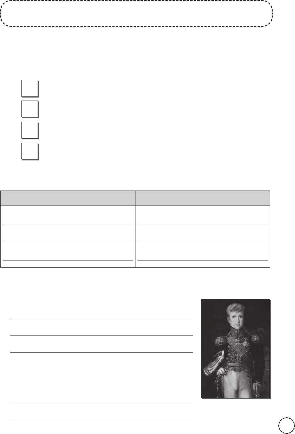 Nome: ________________________________________ Data: ____ /____ /____ 63 O PERÍODO REGENCIAL 1. Marque V para verdadeiro e F para falso. a) Como o príncipe Pedro de Alcântara tinha apenas 5 anos em 1831, foram escolhidos regentes para governar o Brasil. b) O período regencial terminaria quando Pedro de Alcântara atingisse a maioridade. c) Durante o regime regencial, não ocorreram rebeliões no Brasil. d) Os regentes governavam o Brasil diretamente de Salvador, na Bahia, que era a capital do Brasil em 1831. 2. Explique o que eram a Regência Trina e a Regência Una. Regência Trina Regência Una 3. Explique o que foi o Golpe da Maioridade. Por que alguns políticos optaram por aplicá-lo? 4. Quanto tempo durou o período regencial? Em que momento ele foi interrompido? O príncipe Pedro de Alcântara, aos 12 anos de idade. ATIV_5oANO_HISTORIA.indd 63ATIV_5oANO_HISTORIA.indd 63 19/03/20 11:5119/03/20 11:51