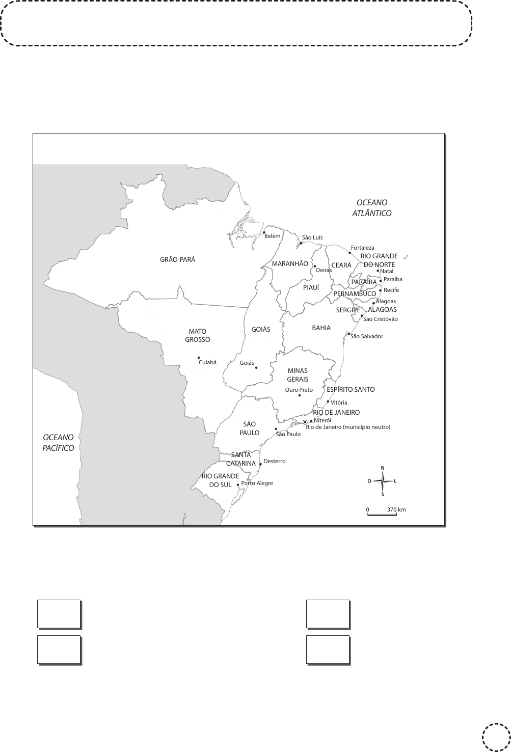 Nome: ________________________________________ Data: ____ /____ /____ 65 REVOLTAS CONTRA A COROA 1. Observe este mapa político do Brasil do século XIX. Principais revoltas do período regencial GOIÁS CEARÁ MATO GROSSO ESPÍRITO SANTO RIO DE JANEIRO SÃO PAULO SANTA CATARINA RIO GRANDE DO SUL RIO GRANDE DO NORTE MINAS GERAIS BAHIA PIAUÍ PERNAMBUCO ALAGOASSERGIPE PARAÍBA MARANHÃO GRÃO-PARÁ OCEANO ATLÂNTICO OCEANO PACÍFICO Porto Alegre Desterro Cuiabá São Salvador São Cristóvão Recife Natal Fortaleza Oeiras Ouro Preto Goiás São Paulo Rio de Janeiro (município neutro) Niterói Vitória Alagoas Paraíba Belém São Luís 370 km0 a) Pinte cada quadrinho desta legenda com uma cor diferente. Use cores claras. Revolução Farroupilha Balaiada Cabanagem Sabinada b) Agora, pinte no mapa a(s) província(s) onde ocorreu(ocorreram) cada uma dessas revoltas, usando a mesma cor da legenda. ATIV_5oANO_HISTORIA.indd 65ATIV_5oANO_HISTORIA.indd 65 19/03/20 11:5119/03/20 11:51