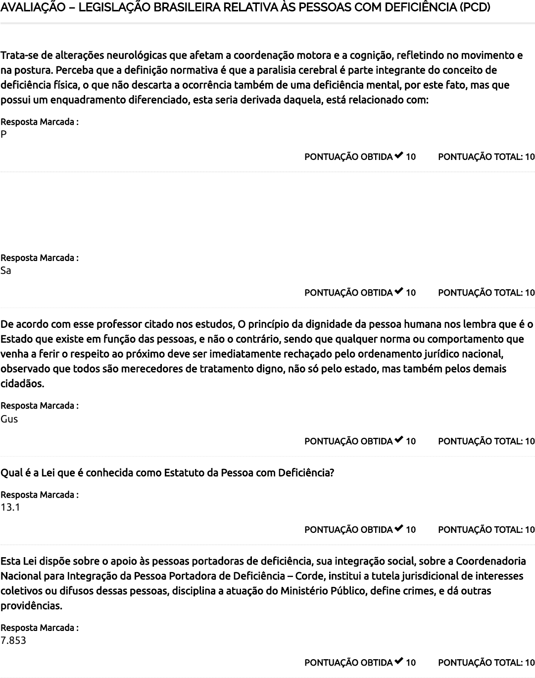 23/08/2023, 20:42 Course Status – Faculdade Educavales https://ava.educavales.universaeducacional.com.br/course-status/# 1/3 AVALIAÇÃO – LEGISLAÇÃO BRASILEIRA RELATIVA ÀS PESSOAS COM DEFICIÊNCIA (PCD) PONTUAÇÃO TOTAL: 10PONTUAÇÃO OBTIDA 10 Trata-se de alterações neurológicas que afetam a coordenação motora e a cognição, re�etindo no movimento e na postura. Perceba que a de�nição normativa é que a paralisia cerebral é parte integrante do conceito de de�ciência física, o que não descarta a ocorrência também de uma de�ciência mental, por este fato, mas que possui um enquadramento diferenciado, esta seria derivada daquela, está relacionado com: Resposta Marcada : Paralisia cerebral. TRATA-SE DA PESSOA QUE NÃO CONSEGUE COMPREENDER QUE DETERMINADOS CUIDADOS SÃO ESSENCIAIS PARA PRESERVAR SUA SAÚDE E SUA SEGURANÇA, COMO POR EXEMPLO A INCAPACIDADE DE ENTENDIMENTO QUE O FOGO QUEIMA, QUE NÃO DEVEMOS INGERIR VENENO, QUE NÃO DEVEMOS COLOCAR A MÃO E UM LOCAL QUE POSSUI A PLACA “CÃO BRAVO”, ENTRE OUTROS. PONTUAÇÃO TOTAL: 10PONTUAÇÃO OBTIDA 10 Resposta Marcada : Saúde e segurança. PONTUAÇÃO TOTAL: 10PONTUAÇÃO OBTIDA 10 De acordo com esse professor citado nos estudos, O princípio da dignidade da pessoa humana nos lembra que é o Estado que existe em função das pessoas, e não o contrário, sendo que qualquer norma ou comportamento que venha a ferir o respeito ao próximo deve ser imediatamente rechaçado pelo ordenamento jurídico nacional, observado que todos são merecedores de tratamento digno, não só pelo estado, mas também pelos demais cidadãos. Resposta Marcada : Gustavo Muzy. PONTUAÇÃO TOTAL: 10PONTUAÇÃO OBTIDA 10 Qual é a Lei que é conhecida como Estatuto da Pessoa com De�ciência? Resposta Marcada : 13.146/2015. PONTUAÇÃO TOTAL: 10PONTUAÇÃO OBTIDA 10 Esta Lei dispõe sobre o apoio às pessoas portadoras de de�ciência, sua integração social, sobre a Coordenadoria Nacional para Integração da Pessoa Portadora de De�ciência – Corde, institui a tutela jurisdicional de interesses coletivos ou difusos dessas pessoas, disciplina a atuação do Ministério Público, de�ne crimes, e dá outras providências. Resposta Marcada : 7.853/1989. 23/08/2023, 20:42 Course Status – Faculdade Educavales https://ava.educavales.universaeducacional.com.br/course-status/# 2/3 PONTUAÇÃO TOTAL: 10PONTUAÇÃO OBTIDA 10 Analise as assertivas e assinale a alternativa correta de acordo com os estudos ministrados: I. A pessoa com Mobilidade Reduzida possui di�culdade para se movimentar, di�culdade na sua locomoção, de maneira permanente, e que não se enquadra no conceito de pessoa com de�ciência, podendo ocorrer de maneira permanente ou temporária. II. A pessoa com mobilidade reduzida é aquela que possui redução efetiva na sua �exibilidade como por exemplo, doenças que afetam os ossos e articulações. III. A perda ou redução da coordenação motora também se enquadra no conceito de pessoa com mobilidade reduzida, como por exemplo, uma pessoa que está sofrendo com tremores devido ao Mal de Parkinson, ou ainda, redução efetiva da percepção, como por exemplo uma pessoa com visão subnormal que não chegue a caracterizar a de�ciência visual. IV. A lei traz expressamente alguns exemplos de pessoas de com mobilidade reduzida como o idoso, a gestante, a lactante, pessoa com criança de colo e obeso. Assinale a alternativa CORRETA: Resposta Marcada : I, II, III e IV. PONTUAÇÃO TOTAL: 10PONTUAÇÃO OBTIDA 10 Assinale V para verdadeiro e F para falso: ( ) O desenho universal é uma regra geral, as coisas devem ser concebidas levando em consideração um padrão que permita a acessibilidade, e somente na impossibilidade de o colocar em prática é que utilizaremos a adaptação razoável, lembre-se que o desenho universal é regra geral e adaptação é exceção. ( ) Por mais que seja idealizado o conceito de desenho universal, muitas barreiras se tornam quase que instransponíveis, sem os instrumentos adequados. ( ) O Decreto nº 3.298/1999 em seu artigo 19 conceitua a ajuda técnica como sendo os elementos que permitem compensar uma ou mais limitações funcionais motoras, sensoriais ou mentais da pessoa com de�ciência, com o objetivo de permitir-lhe superar as barreiras da comunicação e da mobilidade e de possibilitar sua plena inclusão social. Assinale a alternativa CORRETA: Resposta Marcada : V, V, V. 23/08/2023, 20:42 Course Status – Faculdade Educavales https://ava.educavales.universaeducacional.com.br/course-status/# 3/3 90 / 100 PONTUAÇÃO TOTAL: 10PONTUAÇÃO OBTIDA 0 De acordo com os estudos assinale a alternativa correta: I- De acordo com a Lei havendo a necessidade de avaliação da de�ciência, esta deverá ser feita com base em critérios biológicos, psicológicos e sociais. II- Em determinados casos esta avaliação completa poderá ser dispensada, como exemplo uma pessoa que tenha ausência de membro, não precisaremos de um conhecimento técnico especializado tão aprofundado para notar a situação. III- A avaliação, quando necessária, deve ser feita por uma equipe multipro�ssional, ou seja, por pro�ssionais de diversas áreas, como por exemplo, médicos, assistentes sociais, psicólogos, entre outros. Assinale a alternativa CORRETA: Resposta Marcada : Apenas I e III. PONTUAÇÃO TOTAL: 10PONTUAÇÃO OBTIDA 10 Perda parcial de movimentos em um hemisfério do corpo, para exempli�car, de maneira didática, separe o corpo humano em dois, lado esquerdo e lado direito, nesta modalidade de de�ciência a pessoa não conseguirá movimentos em um dos hemisférios, está relacionado à: Resposta Marcada : Hemiplegia. PONTUAÇÃO TOTAL: 10PONTUAÇÃO OBTIDA 10 Analise as assertivas e assinale V para verdadeiro e F para falso: ( ) Art. 3º Para �ns de aplicação desta Lei, consideram-se: IX – Pessoa com mobilidade reduzida: aquela que tenha, por qualquer motivo, di�culdade