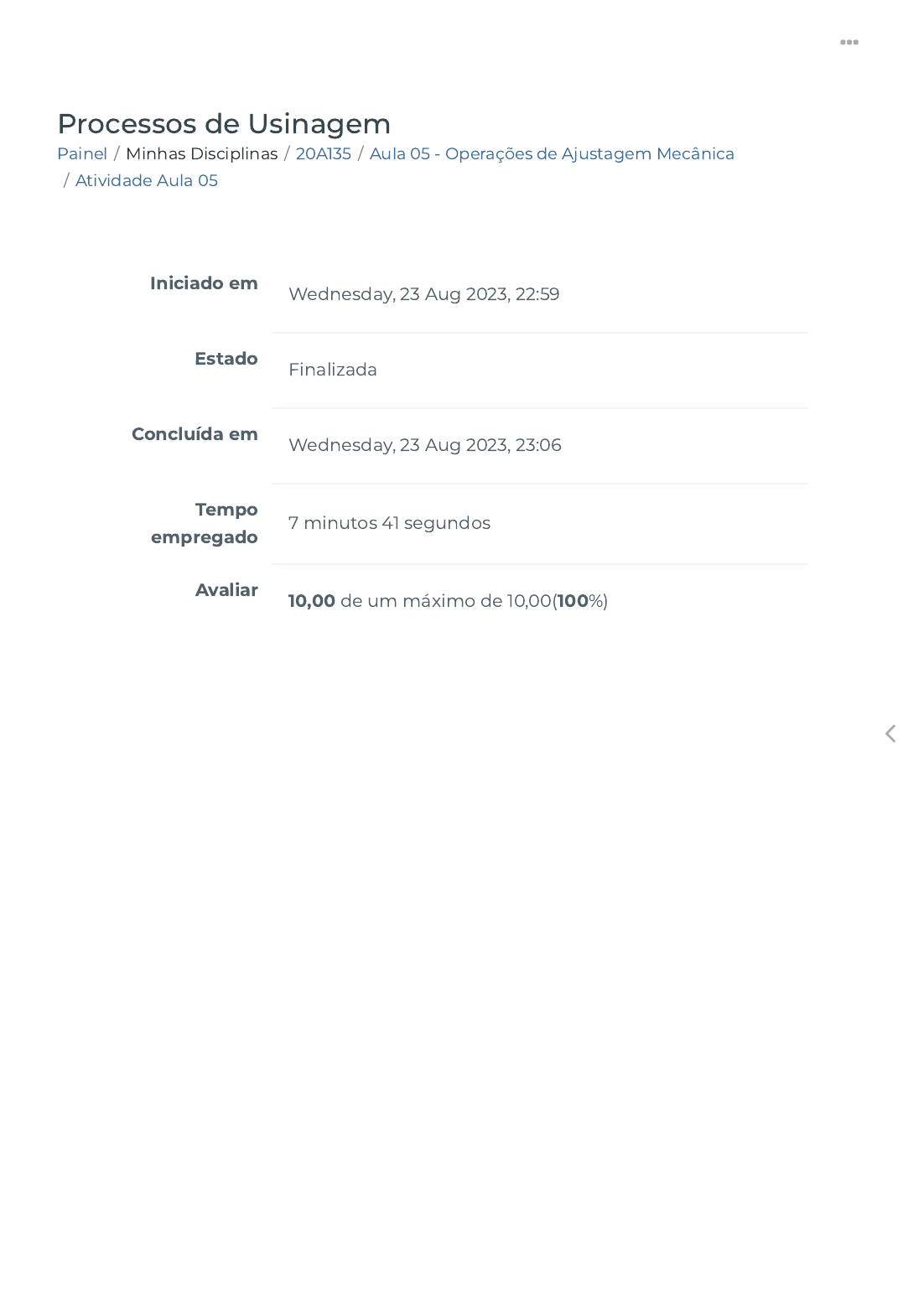 23/08/2023, 23:07 Atividade Aula 05 https://ava.politecnicabr.com.br/mod/quiz/review.php?attempt=5471496 1/7 Painel / Minhas Disciplinas / 20A135 / Aula 05 - Operações de Ajustagem Mecânica / Atividade Aula 05 Processos de Usinagem Iniciado em Wednesday, 23 Aug 2023, 22:59 Estado Finalizada Concluída em Wednesday, 23 Aug 2023, 23:06 Tempo empregado 7 minutos 41 segundos Avaliar 10,00 de um máximo de 10,00(100%) https://ava.politecnicabr.com.br/my/ https://ava.politecnicabr.com.br/course/view.php?id=972 https://ava.politecnicabr.com.br/course/view.php?id=972#section-6 https://ava.politecnicabr.com.br/mod/quiz/view.php?id=31578 https://ava.politecnicabr.com.br/ 23/08/2023, 23:07 Atividade Aula 05 https://ava.politecnicabr.com.br/mod/quiz/review.php?attempt=5471496 2/7 Questão 1 Correto Atingiu 2,00 de 2,00 De acordo com o tipo de picado, as limas são classi�cadas em cinco tipos: a distância entre os dentes é maior, o que torna esse tipo de lima indicado para desbastes, ou seja, maior retirada de material com rugosidade alta. possui o picado �no, o que possibilita melhor rugosidade e permite bom acabamento de superfície, inclusive para encaixes que devem ser ajustados manualmente. Indicada também para limar a lateral de chapas. trata-se de lima com picado médio, que permite retirar uma quantidade de material menor em relação à lima bastarda, porém com melhor acabamento super�cial. utilizadas em materiais endurecidos com tratamento térmico de têmpera e para pequenos ajustes de precisão. É muito utilizada em ferramentaria de corte, dobra e repuxo e moldes plásticos. utilizadas em trabalhos especiais como limagem de furos de pequeno diâmetro, construção de ranhuras e acabamento de cantos vivos e outras superfícies de pequenas dimensões. Bastard Murça Bastard Limas d Limas-a https://ava.politecnicabr.com.br/ 23/08/2023, 23:07 Atividade Aula 05 https://ava.politecnicabr.com.br/mod/quiz/review.php?attempt=5471496 3/7 Questão 2 Correto Atingiu 2,00 de 2,00 Marque Verdadeiro ou Falso: ( ) Serra de �ta horizontal Sua estrutura se assemelha à da serra de �ta vertical, porém é móvel a parte que contém as duas polias que acomodam a serra de �ta. Isso permite a regulagem da altura e do movimento do avanço de corte. Em sua base �xa há uma morsa especial para �xação do material a ser cortado. Procedimento para operação de serra de �ta horizontal » Utilizar óculos de proteção, sapato de segurança e protetor auricular. » Traçar a medida onde ocorrerá o corte. » Apertar �rmemente a morsa para evitar que o material escape. Precauções » Não utilizar luvas durante a operação de corte, para evitar pontos de agarramento. » Apoiar o material a ser cortado para que o mesmo não caia ao �nal do corte, causando acidentes. Escolha uma opção: Verdadeiro Falso https://ava.politecnicabr.com.br/ 23/08/2023, 23:07 Atividade Aula 05 https://ava.politecnicabr.com.br/mod/quiz/review.php?attempt=5471496 4/7 Questão 3 Correto Atingiu 2,00 de 2,00 Marque Verdadeiro ou Falso: ( ) A serra de �ta é destinada a cortar materiais metálicos ou não metálicos. Pode ser utilizada na área de alimentação (em açougues ou marcenarias) e na área de metalmecânica (serralheria, funilaria industrial, caldeiraria, ferramentaria e usinagem). Na área de usinagem, é utilizada para corte de chapas e barras de diversos per�s. Essas operações serão executadas em máquinas operatrizes. Em função de suas características construtivas e de aplicação, as serras de �ta podem ser: » Horizontais: sua aplicação é limitada ao corte seriado de per�s e barras. » Verticais: possuem vasta aplicação em caldeiraria, ferramentaria e mecânica em geral, pois permitem mudança de direção moderada no sentido de corte, porém sem muita precisão. Escolha uma opção: Verdadeiro Falso https://ava.politecnicabr.com.br/ 23/08/2023, 23:07 Atividade Aula 05 https://ava.politecnicabr.com.br/mod/quiz/review.php?attempt=5471496 5/7 Questão 4 Correto Atingiu 2,00 de 2,00 Recomendações para a utilização de furadeiras: Escolha uma opção: a. Nas furadeiras de coluna e bancada, a peça a ser furada deve estar bem �xada por meio de morsa ou grampos. b. Nunca utilizar luvas, roupas folgadas ou de manga comprida na operação da furadeira ou qualquer outra máquina rotativa. c. Selecionar a broca ideal e veri�car se os ângulos de corte estão bem a�ados. d. Utilizar óculos de proteção, protetor auricular; em caso de cabelo comprido, utilizar rede para prendê-lo; e se o material a ser furado produzir pó (concreto, ferro fundido etc.), utilizar máscara para partículas sólidas em suspensão. e. Todas as alternativas corretas. https://ava.politecnicabr.com.br/ 23/08/2023, 23:07 Atividade Aula 05 https://ava.politecnicabr.com.br/mod/quiz/review.php?attempt=5471496 6/7 Questão 5 Correto Atingiu 2,00 de 2,00 Para uma operação de limagem adequada, é importante seguir as recomendações a seguir: Escolha uma opção: a. iniciar a limagem com passos paralelos à lateral da peça ou inclinados para controle da planicidade da superfície. b. veri�car a planeza com o esquadro e a régua paralela. c. antes de iniciar a operação de limar, veri�que se o cabo e o picado da lima estão em boas condições. d. prender a peça na morsa de modo que a superfície a ser limada �que pouco para fora dos mordentes, evitando que a lima atinja os mordentes. e. todas as alternativas corretas. Entre em Contato https://www.politecnicabr.com.br 0800 084 2627 0800 084 2627 Links Úteis Dicas da nossa Diretora Acadêmica Planner de Estudos Declaração de Matrícula Orientações do AVA Abertura de Ticket Fale com o Tutor Cronograma de Estudos Manual de Estágio Manual de Competência https://www.politecnicabr.com.br/ https://soundcloud.com/user-501638417/sets/escola-politecnica-brasileira https://storage.googleapis.com/sirius-pubstore/semestre_plannerdeestudo%20poli.pdf htt