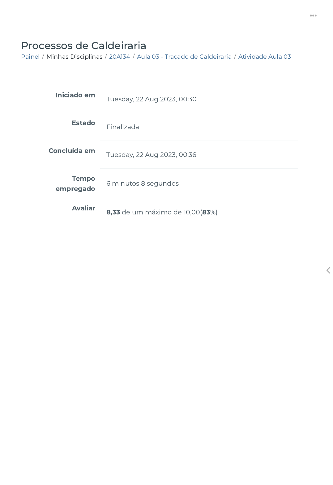 23/08/2023, 23:27 Atividade Aula 03 https://ava.politecnicabr.com.br/mod/quiz/review.php?attempt=5456359 1/7 Painel / Minhas Disciplinas / 20A134 / Aula 03 - Traçado de Caldeiraria / Atividade Aula 03 Processos de Caldeiraria Iniciado em Tuesday, 22 Aug 2023, 00:30 Estado Finalizada Concluída em Tuesday, 22 Aug 2023, 00:36 Tempo empregado 6 minutos 8 segundos Avaliar 8,33 de um máximo de 10,00(83%) https://ava.politecnicabr.com.br/my/ https://ava.politecnicabr.com.br/course/view.php?id=971 https://ava.politecnicabr.com.br/course/view.php?id=971#section-4 https://ava.politecnicabr.com.br/mod/quiz/view.php?id=31362 https://ava.politecnicabr.com.br/ 23/08/2023, 23:27 Atividade Aula 03 https://ava.politecnicabr.com.br/mod/quiz/review.php?attempt=5456359 2/7 Questão 1 Correto Atingiu 2,00 de 2,00 Assinale Verdadeiro ou Falso: Com o valor do diâmetro médio é possível construir o desenho plani�cado, de acordo com os seguintes passos: 1) Traçar a elevação considerando o diâmetro médio e traçar uma meia circunferência na base da elevação. Depois, dividir esta meia circunferência em partes equidistantes, de modo que cada divisão será utilizada para a plani�cação da base inclinada do cilindro. Portanto, não deve ser de�ciente, evitando a falta de precisão, nem excessiva, para que o traçado não �que com muitos pontos de curva, tornando-se praticamente impossível realizar o corte com precisão. No exemplo a seguir, com uma base a 45°, usaremos sete divisões. 2) As divisões da meia circunferência serão a referência para transportar os pontos para a geometria da peça plani�cada, portanto, devem ser traçados segmentos de reta verticais, partindo de cada ponto da meia circunferência dividida até o contorno da inclinação do cilindro. 3) Os pontos gerados pela coincidência do contorno do cilindro e os segmentos de reta verticais que partem da meia circunferência serão a partida para segmentos de reta horizontais, os quais servirão de referência para o per�l da peça plani�cada. 4) Para a traçagem completa da peça plani�cada, deve-se calcular o comprimento do cilindro multiplicando-se seu diâmetro médio por π (para �ns de cálculo, pode-se considerar π = 3,14). Depois, deve-se traçar o cilindro plani�cado com o comprimento calculado e dividi-lo no mesmo número de partes da meia circunferência, de modo que os traços feitos para a divisão cruzem com os traços horizontais já feitos no 3° passo. 5) Traçar a curva da inclinação plani�cada utilizando a curva francesa e os pontos gerados pelo cruzamento dos traços como referência. Escolha uma opção: https://ava.politecnicabr.com.br/ 23/08/2023, 23:27 Atividade Aula 03 https://ava.politecnicabr.com.br/mod/quiz/review.php?attempt=5456359 3/7 Questão 2 Parcialmente correto Atingiu 0,33 de 2,00 Associe corretamente as alternativas: A divisão é indicada quando é preciso minimizar o choque do �uido na mudança de direção gerada pela curva, ou então quando a curva é muito grande e deve apresentar um raio em sua geometria, ou seja, sem vértice. É desenvolvido de modo que, de acordo com o dimensionamento, a peça seja desenhada aberta, ou seja, ao curvar a chapa, a mesma deve estar de acordo com a geometria e o dimensionamento previstos no desenho técnico mecânico da peça. Os gomos são cilindros com um ou dois lados inclinados, dependendo da posição, portanto, a plani�cação é executada conforme o procedimento descrito na plani�cação do cilindro de uma ou duas bocas inclinadas. Para o processo ___________________ com as duas bases inclinadas, deve-se proceder da mesma forma que nas fases de plani�cação do cilindro com uma base inclinada, repetindo a traçagem horizontal e o per�l com geometria da curvatura da inclinação para os dois lados. Possui vértice em sua geometria, e é fabricada a partir de duas chapas. Quando estas forem plani�cadas, ao serem calandradas, vão gerar a inclinação desejada. Para o _____________________________________, ou, como são popularmente chamadas, “bocas” inclinadas, procede-se inicialmente da mesma forma que o cilindro de bases paralelas, ou seja, analisa-se o desenho técnico do cilindro e calcula-se seu diâmetro médio. Verdadeiro Falso Process Process Process Process Curvas c Traçado https://ava.politecnicabr.com.br/ 23/08/2023, 23:27 Atividade Aula 03 https://ava.politecnicabr.com.br/mod/quiz/review.php?attempt=5456359 4/7 Questão 3 Correto Atingiu 2,00 de 2,00 Para fabricar um cilindro com encaixe em um tubo de mesmo diâmetro, são necessários os seguintes procedimentos, exceto: Escolha uma opção: a. Traçar a peça plani�cada considerando o perímetro da meia circunferência b. Traçar a vista frontal do cilindro e a meia circunferência, dividindo-a em 6 partes equidistantes c. Traçar a vista de elevação do cone e uma meia circunferência com diâmetro médio na parte inferior d. Fazer os traços longitudinais e transversais e traçar os raios da curva, que servirá de encaixe no cilindro plani�cado e. Calcular o diâmetro médio do cilindro https://ava.politecnicabr.com.br/ 23/08/2023, 23:27 Atividade Aula 03 https://ava.politecnicabr.com.br/mod/quiz/review.php?attempt=5456359 5/7 Questão 4 Correto Atingiu 2,00 de 2,00 Plani�caremos um de seus lados, e a plani�cação dos demais componentes é obtida com o mesmo procedimento. Marque a alternativa incorreta: Escolha uma opção: a. Dividir a parte inferior do cilindro em 7 partes, considerando a trajetória de linhas originadas da divisão da meia circunferência. b. Na parte superior do cilindro que será plani�cado, traçar uma meia circunferência e dividi-la em 7 partes equidistantes c. Traçar a vista plani�cada do cilindro com as plani�cações superior e inferior. d. Analisar o desenho da elevação da intersecção e utilizar um dos lados para gerar a plani�cação. e. Traçar as curvas do contorno. https://ava.politecnic