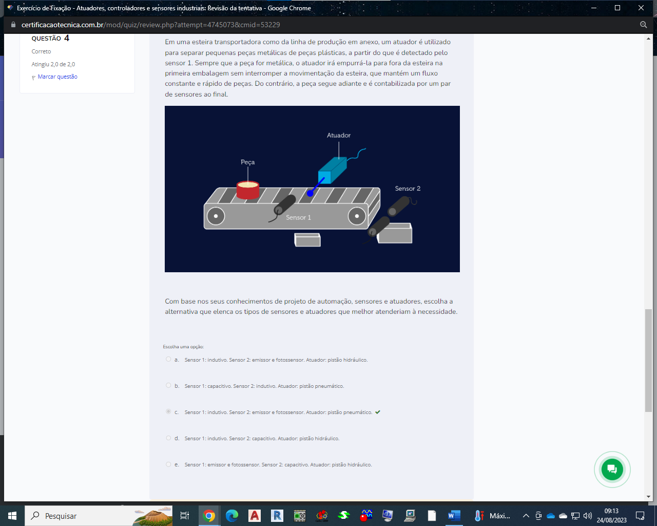 Em uma esteira transportadora como da linha de produção em um atuador é utilizado Correto para separar pequenas peças metálicas de peças a partir do que é detectado pelo Atingiu 2,0 de 2,0 sensor 1. Sempre que a peça for atuador irá empurrá-la para fora da esteira na primeira embalagem sem interromper a movimentação da que mantém um fluxo P Marcar questão constante e rápido de Do a peça segue adiante e é contabilizada por um par de sensores ao Atuador Peça Sensor 2 Sensor 1 Com base nos seus conhecimentos de projeto de sensores e escolha a alternativa que elenca os tipos de sensores e atuadores que melhor atenderiam à Escolha uma