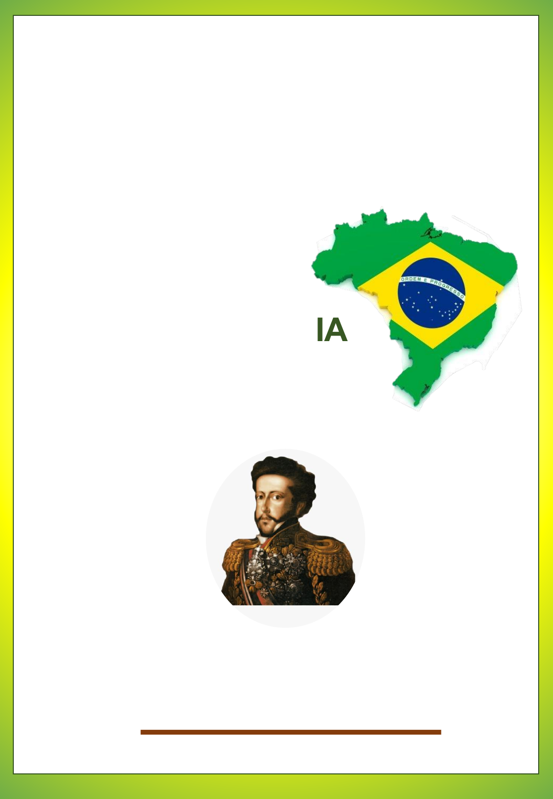 7 DE SETEMBRO 200 ANOS INDEPENDÊNCIA DO BRASIL DOM PEDRO I INDEPENDÊNCIA DO BRASIL 7 DE SETEMBRO / 2022 - 200 ANOS NO ANO DE 1500 O BRASIL FOI DESCOBERTO POR PEDRO ALVARES CABRAL, UM EXPLORADOR DE PORTUGAL, A PARTIR DISSO O BRASIL PASSOU A SER COLÔNIA DE PORTUGAL, TENDO SUAS TERRAS OCUPADAS E EXPLORADAS POR GOVERNANTES PORTUGUESES. EM 1808 O REI DE PORTUGAL DOM JOÃO VI E SUA FAMÍLIA, ENTRARAM EM UM NAVIO E VIERAM MORAR NO BRASIL, EM 1821 DOM JOÃO VI RESOLVEU VOLTAR PARA PORTUGAL, E DEIXOU SEU FILHO DOM PEDRO I COMO PRÍNCIPE DO BRASIL, pydpaulacavenaghi PORTUGAL QUERIA QUE O BRASIL FOSSE APENAS COLÔNIA, SENDO ASSIM O BRASIL IRIA SEMPRE DEPENDER DE PORTUGAL, MAS DOM PEDRO I QUE GOSTAVA MUITO DO BRASIL, E DAS PESSOAS QUE AQUI MORAVAM , NÃO ACEITARAM ESSA CONDIÇÃO, E ASSIM NO DIA 7 DE SETEMBRO DE 1822, AS MARGENS DO RIO IPIRANGA EM SÃO PAULO ,DOM PEDRO I PROCLAMOU A INDEPENDÊNCIA DO BRASIL. LEVANTOU SUA ESPADA E GRITOU: “INDEPENDÊNCIA OU MORTE”? E A PARTIR DESSE DIA O BRASIL NÃO PERTENCIA MAIS A PORTUGAL, E PASSOU A SER UM PAÍS LIVRE. DESDE ENTÃO TODO DIA 7 DE SETEMBRO É COMEMORADO O DIA DA INDEPENDÊNCIA DO BRASIL. pydpaulacavenaghi INDEPENDÊNCIA DO BRASIL 7 DE SETEMBRO / 2022 - 200 ANOS X PEDRO ALVARES CABRAL BRASIL X PORTUGAL COLÔNIA BRASIL DOM JOÃO VI DOM PEDRO I XNÃO INDEPENDÊNCIA DO BRASIL 200 ANOS INDEPENDÊNCIA DO BRASIL 200 ANOS INDEPENDÊNCIA DO BRASIL 200 ANOS C O LE A Q U I C O LE A Q U I C O LE A Q U I “INDEPENDÊNCIA OU MORTE”? MORO EM UM LUGAR, MUITO ENCANTADOR, É O MEU BRASIL, CHEIO DE AMOR!! O CÉU TODO AZUL, COM O SOL QUE VEM BRILHAR, E A CHUVINHA QUE INSISTE EM MOLHAR, AS PLANTAS E FRUTAS, QUE LEGAL!! ESSE É O MEU PAÍS TROPICAL! MORO EM UM LUGAR, MUITO ENCANTADOR, É O MEU BRASIL, CHEIO DE AMOR!! MÚSICA BOA, AQUI TEM! A BOSSA NOVA, NÃO TEM PARA NINGUÉM! NO FUTEBOL, AI QUE EMOÇÃO! SOMOS 5X CAMPEÃO! PENTACAMPEÃO! PENTACAMPEÃO! MORO EM UM LUGAR, MUITO ENCANTADOR, É O MEU BRASIL, CHEIO DE AMOOOOOR! Autor Desconhecido MEU BRASIL 1 - NA MÚSICA, PINTE COM O MARCA TEXTO TODAS AS VEZES QUE APARECER A PALAVRA BRASIL . 2- ESCREVA NO MAPA QUANTAS VEZES APARECEU A PALAVRA BRASIL NA MÚSICA. pydpaulacavenaghi NOME: SEQUÊNCIA DIDÁTICA 1 - ESCREVA O NOME DO NOSSO PAÍS. B R A SI L 2- ESCREVA QUAIS SÃO AS CORES DA BANDEIRA. pydpaulacavenaghi NOME: SIGNIFICADO DAS CORES DA BANDEIRA DO BRASIL pydpaulacavenaghi NOME: REPRESENTA A VEGETAÇÃO BRASILEIRA. REPRESENTA O OURO E AS RIQUEZAS. REPRESENTA O CÉU E OS RIOS BRASILEIROS. REPRESENTA O DESEJO PELA PAZ. VOCÊ SABIA QUE O NOSSO PAÍS É FORMADO POR PEDACINHOS? OS PEDACINHOS QUE FORMAM NOSSO PAÍS, SÃO CHAMADOS DE ESTADOS, CIDADES, BAIRROS... E DA MESMA FORMA SÃO FORMADAS AS PALAVRAS, AS PALAVRAS POSSUEM PEDACINHOS CHAMADOS DE SÍLABAS. VAMOS AGORA FORMAR ALGUMAS PALAVRAS COM AS SÍLABAS PERDIDAS PELO BRASIL? pydpaulacavenaghi NOME: BA LA LO CO MO SA PA TO JO CA RA XI VE GO PE NA PI PO LI XO pydpaulacavenaghi NOME: NO FUTEBOL, AI QUE EMOÇÃO! SOMOS 5X CAMPEÃO! PENTACAMPEÃO! PENTACAMPEÃO! NOSSO PAÍS FOI 5 VEZES CAMPEÃO!! VAMOS AGORA FAZER NOSSO GOL DA MATEMÁTICA? RESOLVA AS CONTAS E FAÇA UM GOLASSO!!! 10 5 8 9 + 15 5- 13 6 16 8- + 8 5+ + HINO DA INPENDÊNCIA DO BRASIL 1 JÁ PODEIS, DA PÁTRIA FILHOS, VER CONTENTE A MÃE GENTIL; JÁ RAIOU A LIBERDADE NO HORIZONTE DO BRASIL. 2 BRAVA GENTE BRASILEIRA! LONGE VÁ... TEMOR SERVIL: OU FICAR A PÁTRIA LIVRE OU MORRER PELO BRASIL. 3 4 5 6 OS GRILHÕES QUE NOS FORJAVA DA PERFÍDIA ASTUTO ARDIL... HOUVE MÃO MAIS PODEROSA: ZOMBOU DELES O BRASIL. BRAVA GENTE BRASILEIRA! LONGE VÁ... TEMOR SERVIL: OU FICAR A PÁTRIA LIVRE OU MORRER PELO BRASIL. NÃO TEMAIS ÍMPIAS FALANGES, QUE APRESENTAM FACE HOSTIL; VOSSOS PEITOS, VOSSOS BRAÇOS SÃO MURALHAS DO BRASIL. BRAVA GENTE BRASILEIRA! LONGE VÁ... TEMOR SERVIL: OU FICAR A PÁTRIA LIVRE OU MORRER PELO BRASIL. 7 8 PARABÉNS, Ó BRASILEIRO, JÁ, COM GARBO JUVENIL, DO UNIVERSO ENTRE AS NAÇÕES RESPLANDECE A DO BRASIL. BRAVA GENTE BRASILEIRA! LONGE VÁ... TEMOR SERVIL: OU FICAR A PÁTRIA LIVRE OU MORRER PELO BRASIL. INDEPENDÊNCIA DO BRASIL 200 ANOS C O LE A Q U I INDEPENDÊNCIA DO BRASIL 200 ANOS C O LE A Q U I INDEPENDÊNCIA DO BRASIL 200 ANOS C O LE A Q U I INDEPENDÊNCIA DO BRASIL 200 ANOS C O LE A Q U I INDEPENDÊNCIA DO BRASIL 200 ANOS C O LE A Q U I