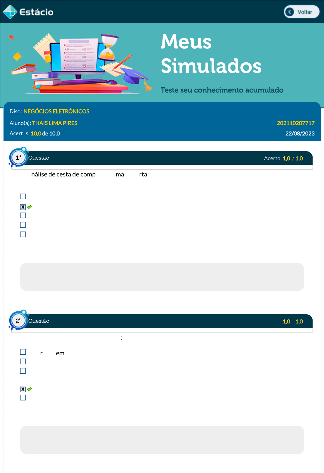 23/08/2023 12:13 Estácio: Alunos https://simulado.estacio.br/alunos/ 1/5 Meus Simulados Teste seu conhecimento acumulado Disc.: NEGÓCIOS ELETRÔNICOS Aluno(a): THAIS LIMA PIRES 202110207717 Acertos: 10,0 de 10,0 22/08/2023 Acerto: 1,0 / 1,0 A "análise de cesta de compras" é uma importante estratégia utilizada no e-commerce. Em relação aos métodos de Mineração de Dados, esse algoritmo é baseado em: Sumarizações Regras de Associações Hierarquias Árvores de Decisão Previsão Respondido em 22/08/2023 20:01:33 Explicação: A resposta correta é: Regras de Associações Acerto: 1,0 / 1,0 Farol (Beacons) são ferramentas que: reduzem drasticamente as operações necessárias para rastrear o estoque permitem a customização e personalização rápida de sites de comércio eletrônico identi�cam fraudes em tempo real, combinando dados de transações com o histórico de compras dos clientes enviam mensagens, noti�cações aos smartphones dos clientes sobre descontos permitem que os clientes experimentem as roupas virtualmente Respondido em 22/08/2023 20:03:15 Explicação: A resposta correta é: enviam mensagens, noti�cações aos smartphones dos clientes sobre descontos Questão1 a Questão2 a https://simulado.estacio.br/alunos/inicio.asp javascript:voltar(); 23/08/2023 12:13 Estácio: Alunos https://simulado.estacio.br/alunos/ 2/5 Acerto: 1,0 / 1,0 NÃO é um tipo de comércio eletrônico: B2C C2C B2G B2B D2C Respondido em 22/08/2023 20:04:23 Explicação: A resposta correta é: D2C Acerto: 1,0 / 1,0 Antes de re�etir sobre questões micro, é necessário também se preocupar com o macroambiente. Dentre os fatores abaixo, qual não está relacionado ao aspecto macro? Forças da empresa Aspectos político-legais Questões ambientais Questões socioculturais Questões econômicas Respondido em 22/08/2023 20:04:57 Explicação: A resposta correta é: Forças da empresa Acerto: 1,0 / 1,0 A Análise SWOT é uma ferramenta poderosa para as empresas. Ela consiste na identi�cação de forças, fraquezas, oportunidades e fornecedores. concorrentes. público-alvo. ameaças. dúvidas. Respondido em 22/08/2023 20:07:01 Explicação: Análise SWOT do seu negócio, o que permite a identi�cação de strengths), weakness (fraquezas), opportunities (oportunidades) e threats (ameaças). Tudo isso auxilia na de�nição de uma estratégia e de uma identidade da sua organização. Questão3 a Questão4 a Questão5 a 23/08/2023 12:13 Estácio: Alunos https://simulado.estacio.br/alunos/ 3/5 Acerto: 1,0 / 1,0 Os E-business são uma tendência da nova economia e possuem diversas vantagens, como os baixos custos operacionais. Entretanto, algumas desvantagens precisam ser supridas para que tal modalidade se torne cada mais e�ciente. Quais desvantagens podem ser citadas? Limitação de localização e Falhas de Segurança Di�culdade ao globalizar uma ideia e aumento do investimento inicial Falhas de segurança e ausência de contato direto com o cliente Atrasos nas entregas e atendimentos em horários especí�cos Atrasos nos processos de entrega e limitação geográ�ca Respondido em 22/08/2023 20:07:40 Explicação: A resposta correta é: Falhas de segurança e ausência de contato direto com o cliente Acerto: 1,0 / 1,0 Em relação ao mapeamento do caminho do consumidor, a fase de arguição corresponde: À fase quando o consumidor adquire o produto. À fase quando uma marca é lembrada pelo consumidor como referência no seu setor de atuação. À fase quando o consumidor entra em contato com a marca ativamente, por vontade própria. À fase quando o consumidor se torna um �el defensor e embaixador da marca. À fase onde o consumidor toma conhecimento da marca em meio a tantas outras. Respondido em 22/08/2023 20:08:32 Explicação: A resposta correta é: À fase quando o consumidor entra em contato com a marca ativamente, por vontade própria. Acerto: 1,0 / 1,0 O E-Commerce teve sua primeira transação em 1984, mas apenas a partir de 1995, a evolução das vendas comerciais ocorreu com agilidade, o que chamados de ondas de evolução. Podemos a�rmar que a Segunda Onda: É caracterizada pelo surgimento de dispositivos móveis e a popularização de tecnologias como o Myspace, que está popular até hoje. É caracterizada pelo surgimento de mais de 12 mil empresas físicas que investiram em serviços digitais, mas que fracassaram devido à falta de estruturação do mercado digital. É caracterizada pela expansão global da banda larga e pelo surgimento de serviços digitais que permitiram a criação e compartilhamento de conteúdo, além do surgimento de negócios digitais e novos modelos de venda online. É caracterizada pela crise da "Bolha das Pontocom" que ocorreu devido à excessiva oferta de empresas online, e após isso, houve um investimento mais cuidadoso em empresas sólidas, resultando em um Questão6 a Questão7 a Questão8 a 23/08/2023 12:13 Estácio: Alunos https://simulado.estacio.br/alunos/ 4/5 crescimento estruturado do mercado digital. É caracterizada pelo uso amplo de dispositivos móveis, maior conectividade e redes sociais, o que gerou um aumento na propaganda e nas vendas, permitiu a inclusão de pequenos negócios e a análise de grandes volumes de dados sobre os clientes digitais. Respondido em 22/08/2023 20:10:03 Explicação: A segunda onda da evolução do E-commerce, iniciou-se em 2004, quando o Google abriu capital na bolsa norte- americana e suas ações fecharam o primeiro dia de vendas avaliadas em 23 bilhões de dólares. Essa segunda onda durou até 2009 e foi caracterizada pela expansão da banda larga de forma global, os usuários da internet começaram a criar e compartilhar conteúdo por meio de serviços digitais como o Facebook, Wikipedia e YouTube. Grandes empresas começaram a fazer investimentos robustos na área, não apenas visando à comunicação, mas também à criação de verdadeiros negócios digitais. Foi nesta onda que a 