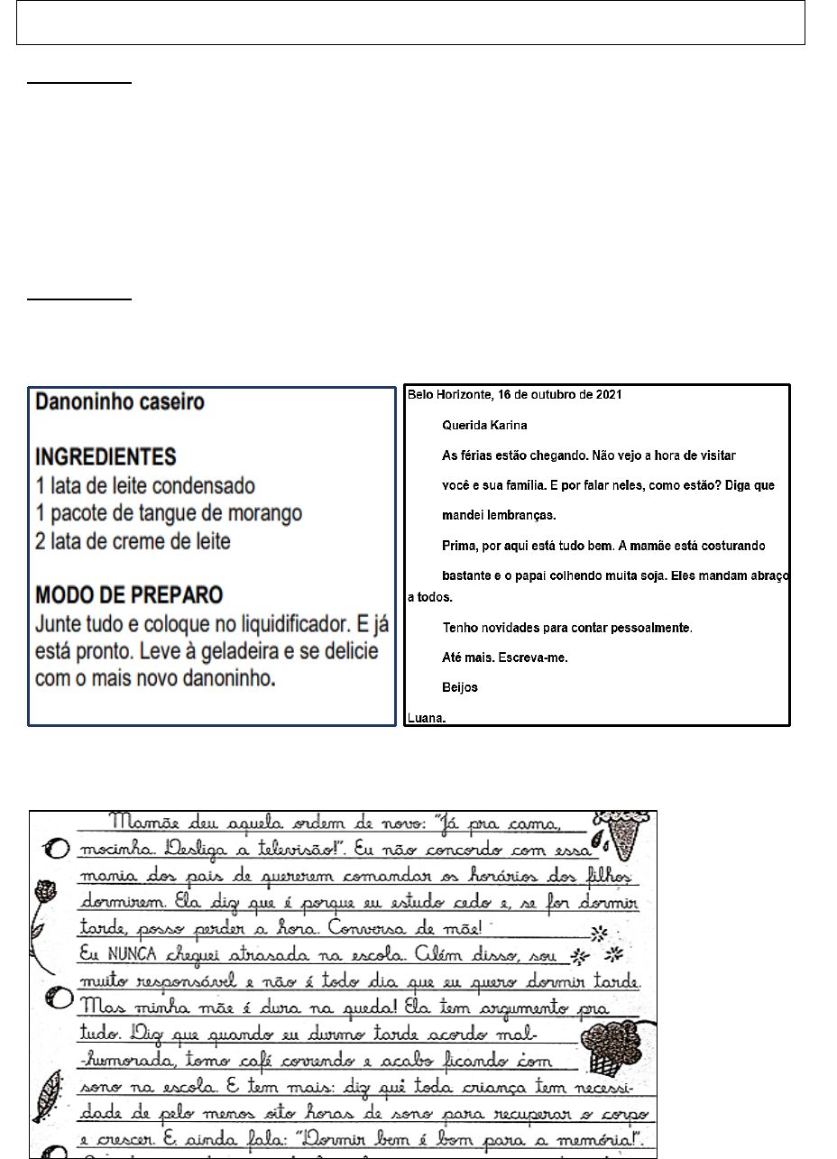 AVALIAÇÃO DE LÍNGUA PORTUGUESA – 3° ANO 2 E 3 QUESTÃO 1 ESCREVA SEU NOME COMPLETO NO ESPAÇO ABAIXO: QUESTÃO 2 LEIA OS TEXTOS E CLASSIFIQUE EM: DIÁRIO, RECEITA OU CARTA. ____________________________________ __________________________ _______________________________ __________________________________________________________________________________ __________________________________________________________________________________ QUESTÃO 3 LEIA A HISTÓRIA COM BASTANTE ATENÇÃO!! A) QUE TIPO DE HISTÓRIA VOCÊ ACABOU DE LER? _______________________________________________________________ B) QUAL É A MORAL DA HISTÓRIA? _______________________________________________________________________ _______________________________________________________________________ C) MORAL DA HISTÓRIA É UM TERMO QUE QUER INDICAR O QUE? ( ) UM SERMÃO ( ) UMA DÚVIDA ( ) UM ENSINAMENTO QUESTÃO 4 LEIA AS PALAVRAS E ORGANIZE EM ORDEM ALFABÉTICA: _______________________________________________________________________ _______________________________________________________________________ QUESTÃO 5 SEPARE AS SÍLABAS DAS PALAVRAS E CLASSIFIQUE-AS QUANTO A TONICIDADE (SÍLABA FORTE: PROPAROXÍTONA ANTEPENÚLTIMA SÍLABA PAROXÍTONA PENÚLTIMA SÍLABA OXÍTONA ÚLTIMA SÍLABA SEPARAÇÃO CLASSIFICAÇÃO ESCOLA LÂMPADA CAFÉ PIPOCA QUESTÃO 6 ESCREVA OS NOMES DAS FIGURAS ABAIXO: QUESTÃO 7 PRODUZIR FRASES: ESCOLA ______________________________________________________ LÁPIS________________________________________________________ BOLA________________________________________________________ QUESTÃO 8 O TEXTO ABAIXO FALTA PONTUAÇÃO. VAMOS PONTUAR? QUESTÃO 9 DÊ O AUMENTATIVO DAS PALAVRAS ABAIXO: GIGANTE:_____________________________________ GATO:________________________________________ PRATO:_______________________________________ CARRO:_______________________________________ QUESTÃO 10 OBSERVE A CENA E CONTINUE A HISTÓRIA. DÊ NOME PARA AS CRIANÇAS E PARA O CÃOZINHO TAMBÉM. NÃO SE ESQUEÇA DO TÍTULO E DA PONTUAÇÃO CORRETA. TÍTULO: _______________________________________________________________ Um dia, os irmãos __________________ e __________________ foram passear com o cãozinho __________________. Eles caminhavam felizes com seus balões, quando______ ____________________________________________________________________ ____________________________________________________________________ ____________________________________________________________________ ____________________________________________________________________ ____________________________________________________________________ ____________________________________________________________________ ____________________________________________________________________ ____________________________________________________________________