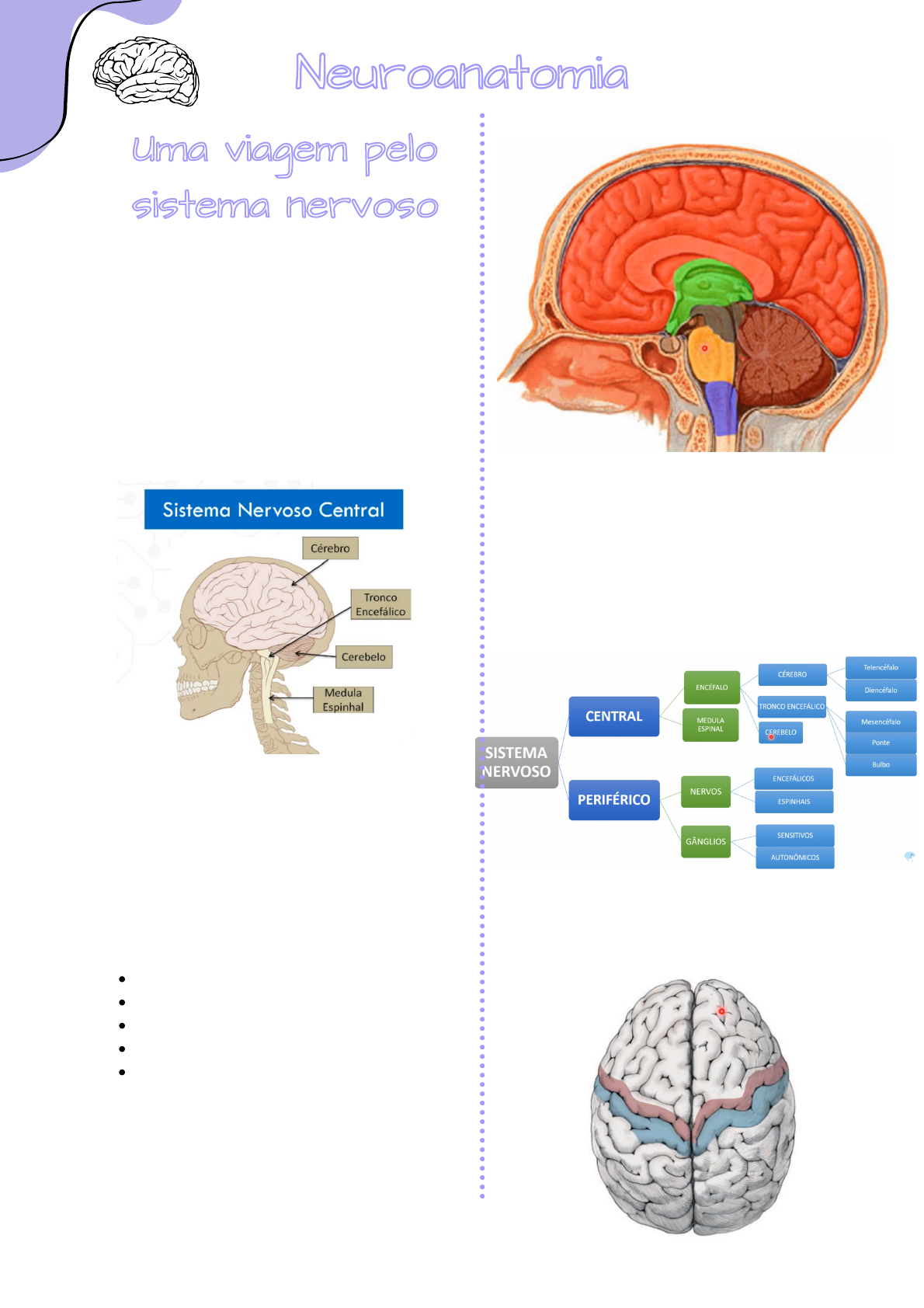 NeuroanatomiaNeuroanatomia Primeiro neurônio motor está no cortex = lesão no cortex gera espasticidade A neuroplasticidade do sistema nervoso periférico e sistema nervoso central são diferentes, por isso a recuperação das lesões tem caracteristicas diferentes, já que no central temos bloqueio a plasticidade. Uma viagem peloUma viagem pelo sistema nervososistema nervoso 8 cervicais 12 torácicas 5 lobares 5 sacrais 1 coccigeo Medula: medula é composta por 38 segmentos: O sistema nervoso é composto pelo ENCEFALO + MEDULA. ENCEFALO = Cerebelo, tronco e cerebelo. 1 = Telencéfalo; 2 = Diencéfalo; 3 = Mesencéfalo; 4 = Ponte; 5 = Bulbo; 6 = Cerebelo; 7 = Medula; 1 2 3 4 5 6 7 Cérebro: O telencéfalo e o diencéfalo formam o cérebro. Está errado falar que o cerebelo e o tronco encefálico fazem parte do cérebro. Telencéfalo: Compreende os 2 hemisférios cerebrais e lâmina terminal (fica abaixo do terceiro ventrículo) DiretoEsquerdo Fissura longitudinal Diencéfalo: Formado pelo tálamo, epitálamo, hipotálamo e subtálamo. O córtex é dividido em 5 lobos, substância branca, núcleos da base e os ventriculos. Córtex: É uma estrutura que fica externa ao encéfalo. É a camada cinzenta que cobre o centro de substância branca. Sendo que substância cinzenta são os corpos de neurônios. O córtex é dividido nos lobos: Lobo frontal: Anteriormente, com principal função motora e regula comportamento e tomada de decisão. Lobo parietal: Sensorial. Lobo Occipital: Visual. Lobo temporal: Auditiva. Lobo da ínsula: Importante no sistema límbico. Tronco encefálico Cerebelo: Atrás do tronco encefálico. Dividido em ganglios e nervos. Temos os nervos espinhais: Saem da medula. Nervos encefálicos/pares cranianos: Saem do encefalo. Nervo encefálico = Cranianos. Nervos espinhais = Saem dos segmentos medulares. Gânglios = Onde ficam os corpos de neurônios. Os ganglios são divididos em: ganglios espinhais Ganglios autonômicos: Fazem parte do sistema nervoso autônomo. Os nervos formam os plexos: Conforme vão se unindoo forma os plexos. Somático: Relacionar com o meio, receber informações sensitivas e realizar ações. Visceral: Relacionado com as visceras, regulação das visceras, algo que não temos controle, de forma automática. Divisão sistema nervoso periférico: Aferente = Sobem até o córtex. Eferentes = Que realizam movimentos voluntários. As fibras aferentes são responsáveis por levar as informações que o corpo obtém do meio externo e de seu interior até o sistema nervoso central. As fibras eferentes, por sua vez, garantem que os impulsos do sistema nervoso central cheguem até os órgãos efetores. Já o visceral está relacionado com a manutenção do nosso meio interno, é feito de forma automática, relacionado com sistema nervoso autônomo. Divisão segmentar: Tem comunicação com nervo, composto pela SNP, medula e tronco encefálico. Divisão hierárquica: No sistema nervoso temos uma hierarquia, em que algumas áreas realizam funções superiores as outras. Primárias: Funções motoras mais simples, fazem o ato motor. Secundária: Planejam ou interpretam como o movimento vai ocorrer. Terciária: Relacionada a área de tomada de decisão. AVC = Está caindo em desuso porque o AVC indica que ocorreu no cérebro, mas o acidente pode ocorrer no cerebelo, tronco encefálico e cérebro, ou seja, em todo o encéfalo. A medula acaba em L1, L2 abaixo não temos medula, mas os nervos continuam, formando a cauda equina. Diencéfalo: Fica ao redor do terceiro ventriculo. Lobo frontalLobo frontal Giro pré central Giro frontal superior: Acima do sulco frontal superior. Giro frontal médio: Entre o sulco frontal sup e o sulco frontal inferior. Giro frontal inferior: Tem algumas divisões como pares triangulares, pares orbitais e pares operculares, formando como se fosse um triangulo dividindo em 3 partes. Se localiza anterior ao sulco central e acima do sulco lateral. Composto por 4 giros: Giros em contato com os olhos = giros orbitários. A) Giro pré central: ÁREA MOTORA PRIMÁRIA, SAEM NEURÔNIO DAS VIAS MOTORAS. Função: é motricidade voluntária. Lesão: Plegia (musculo não contrai) ou paresia. A parte lateral está relacionada a movimentos da face e de membros superiores. A região mais interna está relacionada com funções de membros inferiores e tronco. área motora secundária: B) Giro frontal superior: ÁREA DO COMPORTAMENTO. Lesão: Alterações comportamentais Lesão: Apraxia, dificuldade de planejamento e executar o ato motor. Não é em contrair o musculo e sim no planejamento. ÁREA DE BROCA: 44,45 de Br. É o centro motor da palavra falada e escrita, quando queremos falar, quem organiza quais músculos vão se contrair para eu falar é a área de broca. Lesão: Afasia motora, não consegue falar, mas entende perfeitamente. C) Giro frontal inferior: Áreas motoras terciárias/ ÁREA PRÉ FRONTAL: 9, 10, 46 Br. Recebem as informações do cortex, relacionada a memoria, decisões, inibição e resultados. APF orbitofrontal: Supressão de comportamentos indesejáveis. APF Dorsolateral: Funções executivas. Lesão: APF Pessoa deixa de reagir a algo que antes tinha significado, tamponamento psíquico. A parte lateral está relacionada a movimentos da face e de membros superiores. A região mais interna está relacionada com funções de membros inferiores e tronco. Conexão entre área pré frontal, que toma decisão, ligada ao sistema límbico, a amígdala, as emoções influenciam nas tomadas de decisões. Crianças: IMC está associado ao desenvolvimento do córtex pré frontal e diminuição nas funções executivas, como memória de trabalho. Ou seja, o córtex pré frontal, tomada de decisão, ele é alterado em crianças que tem o IMC aumentado.