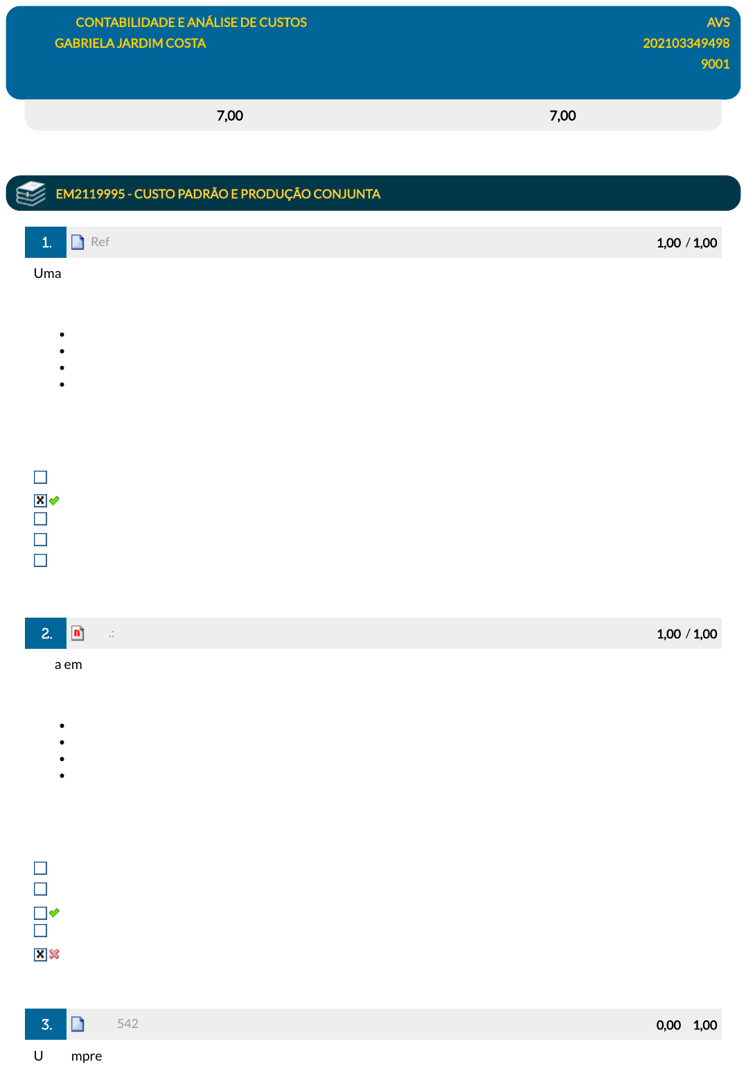 25/08/2023, 15:24 EPS https://simulado.estacio.br/alunos/template.asp?pagina=bdq_alunos_agendamento.asp&f_cod_disc=EGT0020&pag_voltar=inicio.asp# 1/4 Disciplina: CONTABILIDADE E ANÁLISE DE CUSTOS AVS Aluno: GABRIELA JARDIM COSTA 202103349498 Turma: 9001 EGT0022_AVS_202103349498 (AG) 23/09/2022 22:03:12 (F) Avaliação: 7,00 pts Nota SIA: 7,00 pts EM2119995 - CUSTO PADRÃO E PRODUÇÃO CONJUNTA 1. Ref.: 5421433 Pontos: 1,00 / 1,00 Uma empresa, ao fabricar seu produto, teve para sua matéria-prima os seguintes dados: Preço previsto da matéria-prima = R$ 6,00/kg Preço real da matéria-prima = R$ 6,30/kg Quantidade prevista da matéria-prima = 200 kg Quantidade real da matéria-prima = 195 kg Qual o custo padrão desse produto, baseado apenas na matéria-prima? R$ 1.000,00 R$ 1.200,00 R$ 1.300,00 R$ 900,00 R$ 1.100,00 2. Ref.: 5421405 Pontos: 1,00 / 1,00 Uma empresa, ao fabricar seu produto, teve para sua matéria-prima os seguintes dados: Preço previsto da matéria-prima = R$ 6,00/kg Preço real da matéria-prima = R$ 6,30/kg Quantidade prevista da matéria-prima = 200 kg Quantidade real da matéria-prima = 195 kg Qual o valor das variações de preço desse produto, baseado apenas na matéria-prima? R$ 20,00 R$ 40,00 R$ 60,00 R$ 50,00 R$ 30,00 3. Ref.: 5421406 Pontos: 0,00 / 1,00 Uma empresa, ao fabricar seu produto, teve para sua matéria-prima os seguintes dados: javascript:alert('C%C3%B3digo da quest%C3%A3o: 5421433.'); javascript:alert('C%C3%B3digo da quest%C3%A3o: 5421405.'); javascript:alert('C%C3%B3digo da quest%C3%A3o: 5421406.'); 25/08/2023, 15:24 EPS https://simulado.estacio.br/alunos/template.asp?pagina=bdq_alunos_agendamento.asp&f_cod_disc=EGT0020&pag_voltar=inicio.asp# 2/4 Preço previsto da matéria-prima = R$ 6,00/kg Preço real da matéria-prima = R$ 6,30/kg Quantidade prevista da matéria-prima = 200 kg Quantidade real da matéria-prima = 195 kg As variações de quantidade, preço e mistas, foram, respectivamente: Favorável, desfavorável e desfavorável. Favorável, favorável e favorável. Favorável, favorável e desfavorável. Desfavorável, favorável e favorável. Favorável, desfavorável e favorável. EM2119996 - MÉTODOS DE CUSTEAMENTO 4. Ref.: 5421344 Pontos: 0,00 / 1,00 Uma empresa utiliza o método de custeio por absorção. Ela produz dois produtos: O Produto A e o produto B, tendo o produto A 400 unidades mensalmente produzidas, e o produto B 600 unidades mensalmente produzidas. O custo unitário direto do Produto A é de R$12,00 (R$6,00 de matéria-prima e R$6,00 de mão de obra direta), e o custo unitário direto do Produto B é de R$15,00 (R$10,00 de matéria-prima e R$5,00 de mão de obra direta). Os custos indiretos são de R$50.000,00. A partir dos dados acima, calcule o rateio do custo indireto pelo método do Custeio por Absorção do Produto A utilizando mão de obra direta. R$22.727 R$27.273 R$27.777 R$27.737 R$27.773 5. Ref.: 5421393 Pontos: 1,00 / 1,00 Uma empresa utiliza o método de custeio por absorção. Ela produz dois produtos: O Produto A e o produto B, tendo o produto A 400 unidades mensalmente produzidas, e o produto B 600 unidades mensalmente produzidas. O custo unitário direto do Produto A é de R$12,00 (R$6,00 de matéria-prima e R$6,00 de mão de obra direta), e o custo unitário direto do Produto B é de R$15,00 (R$10,00 de matéria-prima e R$5,00 de mão de obra direta). Os custos indiretos são de R$50.000,00. A partir dos dados acima, calcule o rateio do custo indireto pelo método do Custeio por Absorção do Produto B utilizando mão de obra direta. R$22.727 R$24.773 R$25.737 R$23.273 R$26.777 javascript:alert('C%C3%B3digo da quest%C3%A3o: 5421344.'); javascript:alert('C%C3%B3digo da quest%C3%A3o: 5421393.'); 25/08/2023, 15:24 EPS https://simulado.estacio.br/alunos/template.asp?pagina=bdq_alunos_agendamento.asp&f_cod_disc=EGT0020&pag_voltar=inicio.asp# 3/4 EM2119997 - CUSTOS DE AQUISIÇÃO E CONTROLES DE ESTOQUES 6. Ref.: 5421334 Pontos: 0,00 / 1,00 Uma empresa tem no estoque 500 produtos produzidos em abril ao custo de R$5,00 cada, 1.000 produzidos em maio ao custo de R$6,00 cada e 2.000 em junho a R$5,80 cada. Sabe-se que ela possui controle especí�co de estoque e que vendeu 200 produtos produzidos em abril e 50 produzidos em maio. Calcule o custo de mercadorias vendidas pelo método UEPS. R$1.435,00 R$750,00 R$1.450,00 R$1.300,00 R$1.250,00 7. Ref.: 6097252 Pontos: 1,00 / 1,00 Os custos de uma empresa podem ser classi�cados de maneiras distintas. Considere os seguintes custos da empresa Alfa: R$10.000,00 de matéria-prima R$25.000,00 de mão de obra direta R$13.000,00 de mão de obra indireta R$8.000,00 de aluguel do espaço da fábrica R$1.000,00 de aluguel de espaço da loja R$4.000,00 de depreciação do maquinário R$1.000,00 de energia elétrica para alimentar as máquinas de produção. Assinale a alternativa que indica o total das despesas da empresa Alfa nesse período. 35.000,00 26.000,00 11.000,00 1.000,00 50.000,00 PE2110184 - CONTEXTUALIZAÇÃO DA CONTABILIDADE DE CUSTOS 8. Ref.: 4329336 Pontos: 1,00 / 1,00 Algumas expressões e terminologias são costumeiramente utilizadas em Contabilidade de Custos, como exemplo temos os Custos de Transformação, que representam a soma de todos os Custos de Produção, exceto os relativos a matérias-primas e outros eventuais itens adquiridos e empregados sem nenhuma modi�cação pela empresa. Diante desse conceito e de acordo com os gastos do ano de 2020 elencados a seguir de uma indústria, resolva o que se pede. Matéria-Prima Consumida: 300.000 Mão de Obra Direta: 200.000 Aluguel da Fábrica: 50.000 javascript:alert('C%C3%B3digo da quest%C3%A3o: 5421334.'); javascript:alert('C%C3%B3digo da quest%C3%A3o: 6097252.'); javascript:alert('C%C3%B3digo da quest%C3%A3o: 4329336.'); 25/08/2023, 15:24 EPS https://simulado.estacio.br/alunos/template.asp?pagina=bdq_alunos_agendamento.asp&f_cod_disc=EGT0020&pag_voltar=inicio.asp# 4/4 Manutenção das Máquinas da fábrica