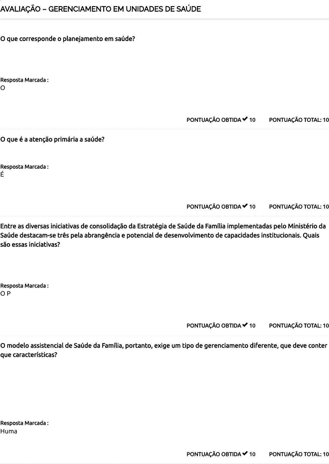 23/08/2023, 15:23 Course Status – Faculdade Facuvale https://ava.faculdadefacuvale.universaeducacional.com.br/course-status/ 1/3 AVALIAÇÃO – GERENCIAMENTO EM UNIDADES DE SAÚDE PONTUAÇÃO TOTAL: 10PONTUAÇÃO OBTIDA 10 O que corresponde o planejamento em saúde? Resposta Marcada : O planejamento em saúde, numa visão estratégica, se constitui num processo de caráter permanente e participativo, com uma dimensão técnica e política, que tem como produto – não acabado – um plano, que documenta e anuncia a política de saúde de�nida pelos diversos atares sociais envolvidos no processo. PONTUAÇÃO TOTAL: 10PONTUAÇÃO OBTIDA 10 O que é a atenção primária a saúde? Resposta Marcada : É entendida como o primeiro nível do sistema de serviços de saúde, devendo funcionar como porta de entrada preferencial, com ações resolutivas sobre os problemas de saúde, articulando-se com os demais níveis de complexidade, formando uma rede integrada de serviços. PONTUAÇÃO TOTAL: 10PONTUAÇÃO OBTIDA 10 Entre as diversas iniciativas de consolidação da Estratégia de Saúde da Família implementadas pelo Ministério da Saúde destacam-se três pela abrangência e potencial de desenvolvimento de capacidades institucionais. Quais são essas iniciativas? Resposta Marcada : O Projeto de Expansão e Consolidação da Estratégia Saúde da Família (PROESF), a implementação do projeto de Avaliação para Melhoria da Qualidade da Estratégia de Saúde da Família (AMQ) e o estudo de meta-avaliação comissionado pelo Ministério da Saúde para avaliação dos estudos de linha de base do Proesf PONTUAÇÃO TOTAL: 10PONTUAÇÃO OBTIDA 10 O modelo assistencial de Saúde da Família, portanto, exige um tipo de gerenciamento diferente, que deve conter que características? Resposta Marcada : Humanizado, sensível e dinâmico, embora devamos levar em conta os mesmos itens de uma organização com objetivos a serem atingidos. 23/08/2023, 15:23 Course Status – Faculdade Facuvale https://ava.faculdadefacuvale.universaeducacional.com.br/course-status/ 2/3 PONTUAÇÃO TOTAL: 10PONTUAÇÃO OBTIDA 10 Do que se trata a qualidade da saúde? Resposta Marcada : É o conjunto de práticas relacionadas aos cuidados globais comum em todos os âmbitos, desde a prevenção de doenças até a manutenção da qualidade. PONTUAÇÃO TOTAL: 10PONTUAÇÃO OBTIDA 10 O que compreende a organização dos serviços de saúde, segundo Mishima (1995)? Resposta Marcada : Compreende um conjunto de “ações” desenvolvidas com o objetivo de permitir a estruturação física e o desenvolvimento dos trabalhadores, através de uma alocação adequada dos recursos necessários para a prestação da assistência ã saúde da comunidade. PONTUAÇÃO TOTAL: 10PONTUAÇÃO OBTIDA 10 Qual é a função da administração de recursos de materiais no gerenciamento em unidade de saúde? Resposta Marcada : A gerência dos recursos materiais tem como objetivo coordenar todas as atividades necessárias para garantir o suprimento de equipamentos, materiais e medicamentos em todos os setores, de maneira que a prestação de seus serviços não sofra interrupções prejudiciais à clientela. PONTUAÇÃO TOTAL: 10PONTUAÇÃO OBTIDA 10 Quais as atividades do gerenciamento dos recursos humanos em unidades de saúde? Resposta Marcada : A administração de recursos humanos compreende as atividades de dimensionamento de pessoal, elaboração de escalas, supervisão, avaliação de desempenho e educação continuada. 23/08/2023, 15:23 Course Status – Faculdade Facuvale https://ava.faculdadefacuvale.universaeducacional.com.br/course-status/ 3/3 100 / 100 PONTUAÇÃO TOTAL: 10PONTUAÇÃO OBTIDA 10 O gerente pode usar para realizar o processo de supervisão em uma unidade de saúde as seguintes técnicas: Resposta Marcada : Observação direta, revisão de documentos técnicos, avaliação qualitativa dos serviços, entrevistas com clientes, trabalhadores e comunidade; orientação: reunião e avaliação quantitativa de dados. PONTUAÇÃO TOTAL: 10PONTUAÇÃO OBTIDA 10 É através de que recursos que a ESF comprova sua capacidade de modi�car a realidade, ampliando o acesso, melhorando índices de saúde e atuando diretamente sobre a vida das pessoas, de acordo com a realidade local? Resposta Marcada : Dos indicadores de saúde do município e do resultado das ferramentas de avaliação. Total