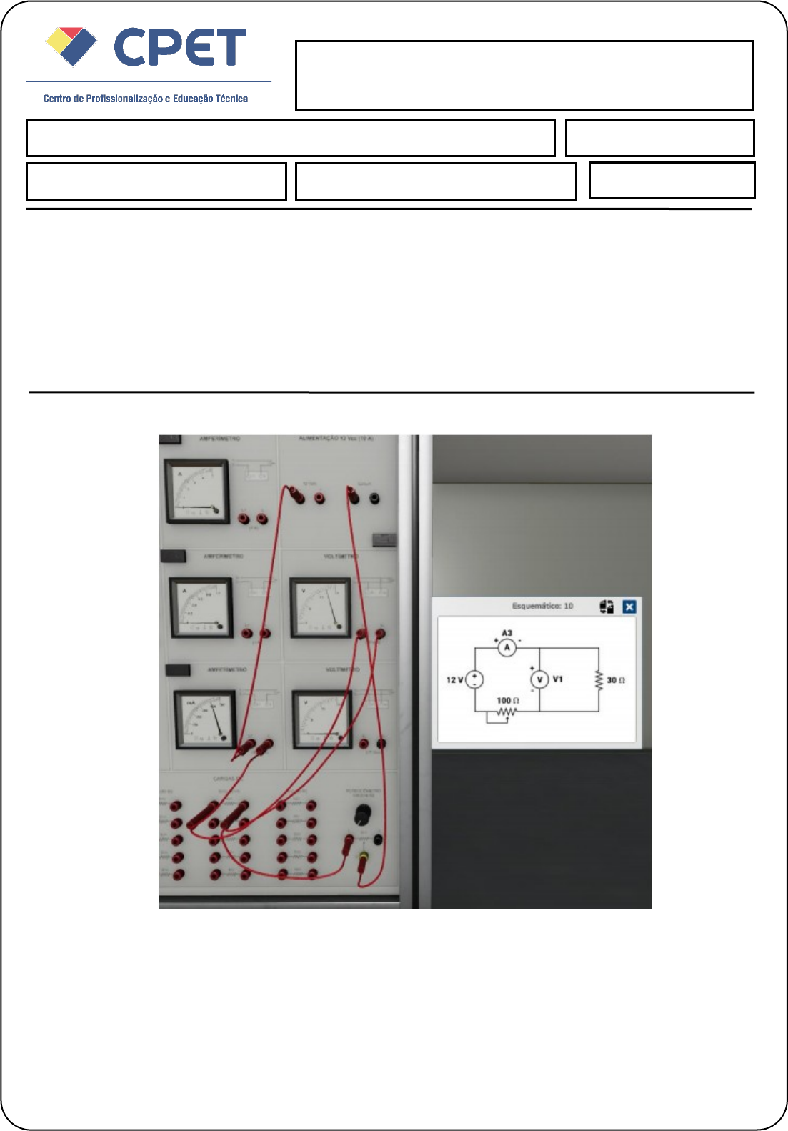 Laboratório de Instalações Elétricas Aluno (a): ISRAEL FERREIRA PINTO Data:02/07/ 2023. Avaliação Pesquisa/Prática NOTA: INSTRUÇÕES: · Esta Avaliação contém 1 (uma) questão, totalizando 10 (dez) pontos. · Você deve preencher dos dados no Cabeçalho para sua identificação · Nome / Data de entrega · As respostas devem ser digitadas abaixo de cada pergunta. · Ao terminar, grave o arquivo com o nome Avaliação Pesquisa/Prática. · Envio o arquivo pelo sistema. 1. Monte o circuito do esquemático 10 utilizando o amperímetro selecionado. Verifique se o circuito que você montou é igual ao circuito acima. Neste experimento você vai variar a posição do potenciômetro 10 vezes, para cada variação, preencha uma linha da tabela abaixo com os valores obtidos no amperímetro e no voltímetro. V I 3 95 3,5 115 4 125 4,5 145 5 165 6 195 7 230 8 260 9 300 12 400 Utilize os dados da tabela acima para construir o gráfico entre tensão e corrente sobre o resistor de 30 ɏ. O gráfico construído possui comportamento linear? O Gráfico construído possui comportamento linear. Qual deve ser o coeficiente angular da reta deste gráfico? O coeficiente angular da reta é igual a 30 Avaliação Pesquisa/Prática