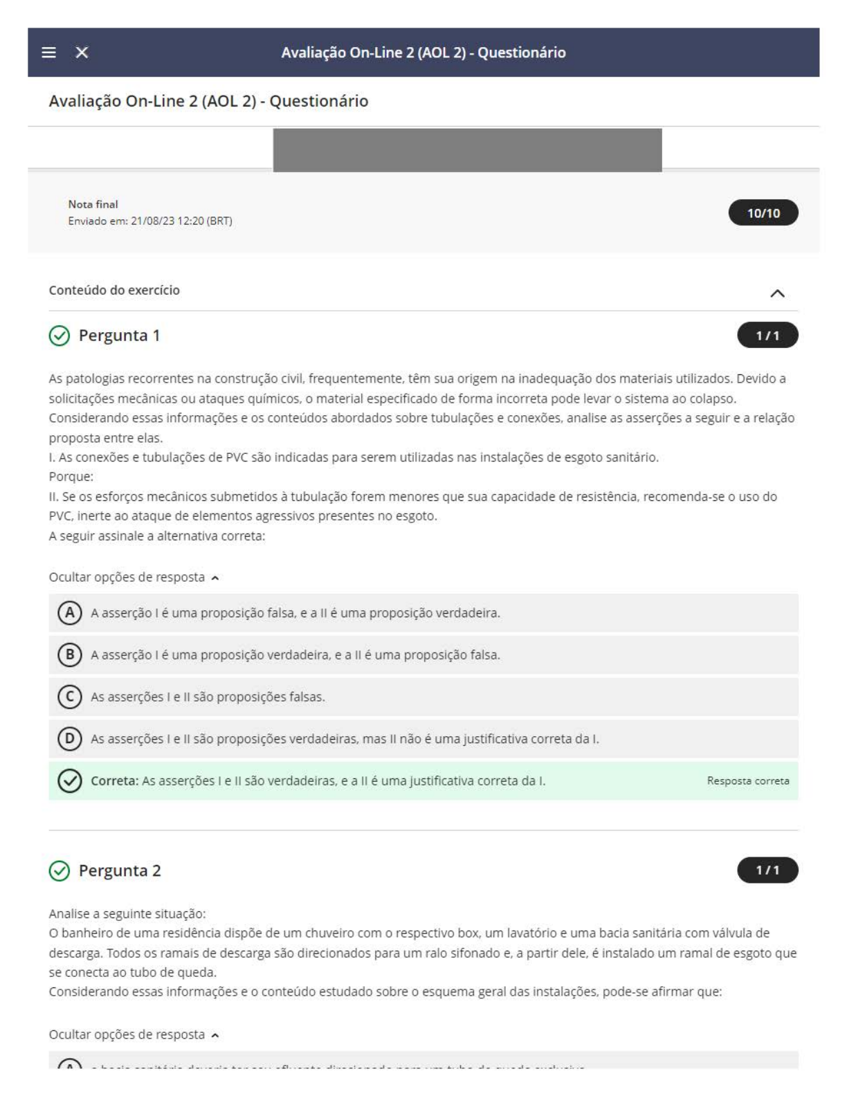 = X Avaliação On-line 2 (AOL 2) - Questionário Ava liação On-line 2 (AOL 2) - Questionário Nota fi nal Enviado em: 21 /08/23 12:20 (BRD Conteúdo do exercício A 0 Pergunta 1 As patologias recorrentes na construção civi l, frequentemente, têm sua origem na inadequação dos materiais utilizados. Devido a solicitações mecânicas ou ataques químicos, o material especificado de forma incorreta pode levar o sistema ao colapso. Considerando essas informações e os conteúdos abordados sobre tubulações e conexões, analise as asserções a seguir e a relação proposta entre elas. 1. As conexões e tubulações de PVC são indicadas para serem utilizadas nas instalações de esgoto sanitário. Porque: li. Se os esforços mecânicos submetidos à tubulação forem menores que sua capacidade de resistência, recomenda-se o uso do PVC, inerte ao ataque de elementos agressivos presentes no esgoto. A seguir assinale a alternativa correta: Ocultar opções de resposta A @ A asserção I é uma proposição fa lsa, e a li é uma proposição verdadeira. ® A asserção I é uma proposição verdadeira, e a li é uma proposição falsa. @ As asserções I e li são proposições falsas. @ As asserções I e li são proposições verdadeiras, mas li não é uma justificativa correta da 1. 0 Correta: As asserções I e li são verdadeiras, e a li é uma justificativa correta da 1. 0 Pergunta 2 Analise a seguinte situação: Resposta correta - O banheiro de uma residência dispõe de um chuveiro com o respectivo box, um lavatório e uma bacia sanitária com válvula de descarga. Todos os ramais de descarga são direcionados para um ralo sifonado e, a partir dele, é instalado um ramal de esgoto que se conecta ao tubo de queda. Considerando essas informações e o conteúdo estudado sobre o esquema geral das instalações, pode-se afirmar que: Ocultar opções de resposta A \,!::) d Udlld !>díllldíld U t'Vt'lld l t'f !>t'U t' I IUt'lllt' UHt'UOíldUU µdld UIII LUUO Ut' qut'Ud exuu:::.1vo. (;?) Correta: o ramal de descarga da bacia sanitária não deve ser direcionado para o ralo sifonado. @ a descrição atende às prescrições da NBR 8160:1999 e, portanto, a instalação está correta. Resposta correta ® os ramais de descarga do ralo do box do chuveiro podem ser direcionados diretamente para o tubo de queda, mesmo que esse ralo seja seco. © o ramal de descarga da bacia sanitária poderia ser direcionado para o ra lo sifonado se o acionamento fosse por caixa acoplada. 0 Pergunta 3 Os subcoletores e coletores devem ser interrompidos por Caixas de Inspeção (CI), que permitem o acesso às tubulações em uma eventual manutenção do sistema. Tais caixas devem estar posicionadas em mudanças de direção ou de decl ividade da tubulação, na conexão com tubos de queda ou ramais de esgoto, ou quando existir longo t recho de tubulação. Longos trechos de tubulação dificultam os serviços de manutenção, como uma eventual desobstrução e, dessa forma, deve-se limitar o comprimento de trechos retos. Essa limitação pode ser materializada inserindo Caixas de Inspeção intermediárias. Considerando essas informações e o conteúdo estudado sobre o esquema geral das instalações, pode-se afirmar que a máxima distância prescrita pela normatização brasileira entre duas CI é de: Ocultar opções de resposta A @ 10m. ® 35m. @ 40m. (;?) Correta: 25 m. © 15m. 0 Pergunta 4 Resposta correta Segundo Macintyre (1990), é obrigatória a instalação de dispositivos de desconexão para impedi r o acesso de gases, presentes no sistema de instalação primária do esgoto, aos ambientes internos. Um dos elementos utilizados para isso é o sifão, que provê a instalação de fecho hídrico. Para sua efetividade, o fecho hídrico deve ter uma altura mínima de coluna de água. Fonte: MACINTYRE, A. J. Manual de Instalações Hidráulicas. Rio de Janeiro: Editora L TC, 1990. Considerando essas informações e o conteúdo estudado sobre o esquema geral das instalações, sabe-se que a coluna de água do fecho hídrico garante a efetividade do desconector. Assim, pode-se afirmar que a mínima altu ra dessa coluna de água deve ser de: Ocultar opções de resposta A @ 20mm. \V 100 mm. © 200 mm. 0 Correta: 50 mm. Resposta correta © 10 mm. 0 Pergunta 5 A NBR 8160 define um dos componentes do sistema como sendo: "Prolongamento do tubo de queda acima do ramal mais alto a ele ligado e com extremidade superior aberta à atmosfera situada acima da cobertu ra do prédio." Fonte: ASSOCIAÇÃO BRASILEIRA DE NORMAS TÉCNICAS [ABNTJ. NBR 8160:1999 - Sistemas pred iais de esgoto sanitário - Projeto e execução. Rio de Janeiro: ABNT, 1999. Considerando essas informações e o conteúdo estudado sobre o esquema geral das instalações, pode-se afirmar que a defin ição apresentada se refere ao: Ocultar opções de resposta A @ desconector. ® tubo de venti lação secundária. @ ramal de venti lação. @ tubo de queda. 0 Correta: tubo de ventilação primária. 0 Pergunta 6 Resposta correta A presença de Ca ixas de Inspeção nas redes de subcoletores é necessária para manutenção e limpeza da tubulação. Em função disso, a NBR 8160:1999 prescreve a inserção de Caixas de Inspeção em diversas situações, notadamente em pontos que tenham maior probabilidade de apresentar obstruções ou necessidade de manutenção. Fonte: ASSOCIAÇÃO BRASILEIRA DE NORMAS TÉCNICAS [ABNTJ. NBR 8160:1999 - Sistemas pred iais de esgoto sanitário - Projeto e execução. Rio de Janeiro: ABNT, 1999. Considerando essas informações e o conteúdo estudado sobre o esquema geral das instalações, analise as afirmativas a segui r. 1. Deve-se insta lar uma Caixa de Inspeção onde houver mudança de direção da tubu lação. li. A distância máxima entre duas Caixas de Inspeção é de 15 m. Caso haja t recho maior que 15 m, deve-se instalar Caixas de Inspeção intermediárias. Ili. A conexão entre os tubos de queda e
