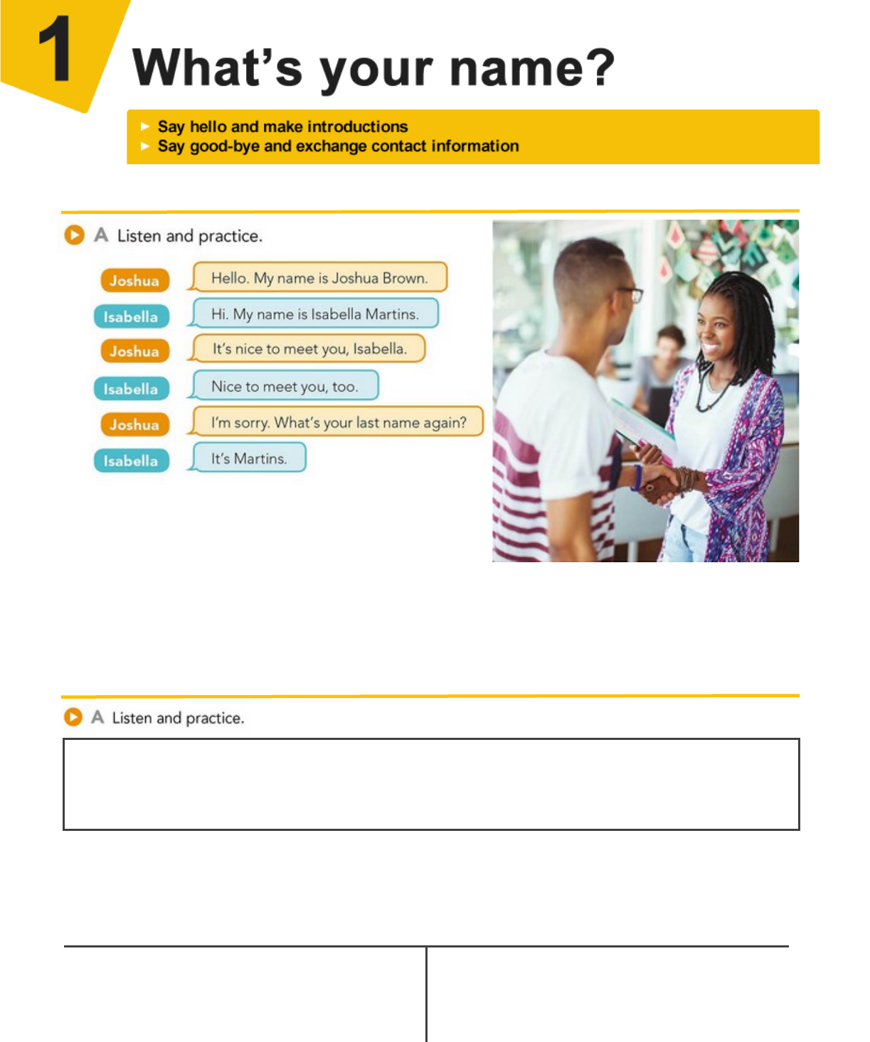 1 CONVERSATION My name is Joshua Brown B Introduce yourself to your partner. A: Hello, my name is… B: Hi, my name is… A: It’s nice to meet you,…. B: It’s nice to meet you, too. 2 SPEAKING Spelling Names A (êi) B (bi) C (ci) D (di) E (i) F (éf) G (dji) H (êitch) I (ai) J (djêi) K (kêi) L (él) M (êm) N (ên) O (ou) P (pi) Q (quiu) R (ar) S (éss) T (ti) U (iu) V (vi) W (dâbliu) X (éks) Y (uai) Z (zi) B Answer the questions. What’s your full name? How do you spell your last name? My full name is… It’s… ISABELLA MARTINS JOSHUA BROWN What’s her name? Her name is…. What’s his name? His name is… How do you spell her last name? It’s… How do you spell his last name? It’s… 3 LISTENING Your name, please? 4 SPEAKING Personal Information B Answer the questions. What’s your phone number? My phone number is… What’s your email address? My email address is….. @ (at)…. . (dot)… C Practice these phone numbers and email addresses. Then listen and check your answers. Her name is Jessica Adams. Her work phone number is… His name is Ryan Walker. His work phone number is… 5 LISTENING Contact Information A Listen and complete the list. NAME PHONE NUMBER EMAIL ADDRESS Ben Durant 718-555-8241 Cara Ruiz Andrea Clark Akina Hayashi EMAIL ADDRESSES @ at . dot _ underscore - dash ../../../../../../../C:%5CUsers%5CVanessa%5CDownloads%5CInterchange%205th%20Ed%20-%20Intro%5CIntro%5CInterchange%20Intro%20Level%20Classroom%20Audio%5CIC5_L0_Unit%2003-04%20PC%20Pg%20028%20Ex%2002%20Listening.mp3 VOCABULARY | CARDINAL NUMBERS 1 CARDINAL NUMBERS 0 Zero (oh) 10 Ten 20 Twenty 1 One 11 Eleven 30 Thirty 2 Two 12 Twelve 40 Forty 3 Three 13 Thirteen 50 Fifty 4 Four 14 Fourteen 60 Sixty 5 Five 15 Fifteen 70 Seventy 6 Six 16 Sixteen 80 Eighty 7 Seven 17 Seventeen 90 Ninety 8 Eight 18 Eighteen 100 A / One Hundred 9 Nine 19 Nineteen 1,000 A / One Thousand A How do you say these numbers? 12 273 10,700 79,312 679,447 20 490 11,220 90,431 1,700,250 36 954 19,682 200,800 2,620,900 68 1,300 24,351 720,400 6,472,812 140 2,618 53,150 315,924 20,793,129 B PHONE NUMBERS How do you say these phone numbers? 8821-2467 9844-2345 7988-1266 9977-4805 55 19 8302-5599 55 11 9133-6507 2 WRITING Write the numbers. 85 12 256 432 718 199 807 2,965 6,214 11,905 47,153 77,945 98,303 100,718 456,990 724,562 1,500,034 8,234,781