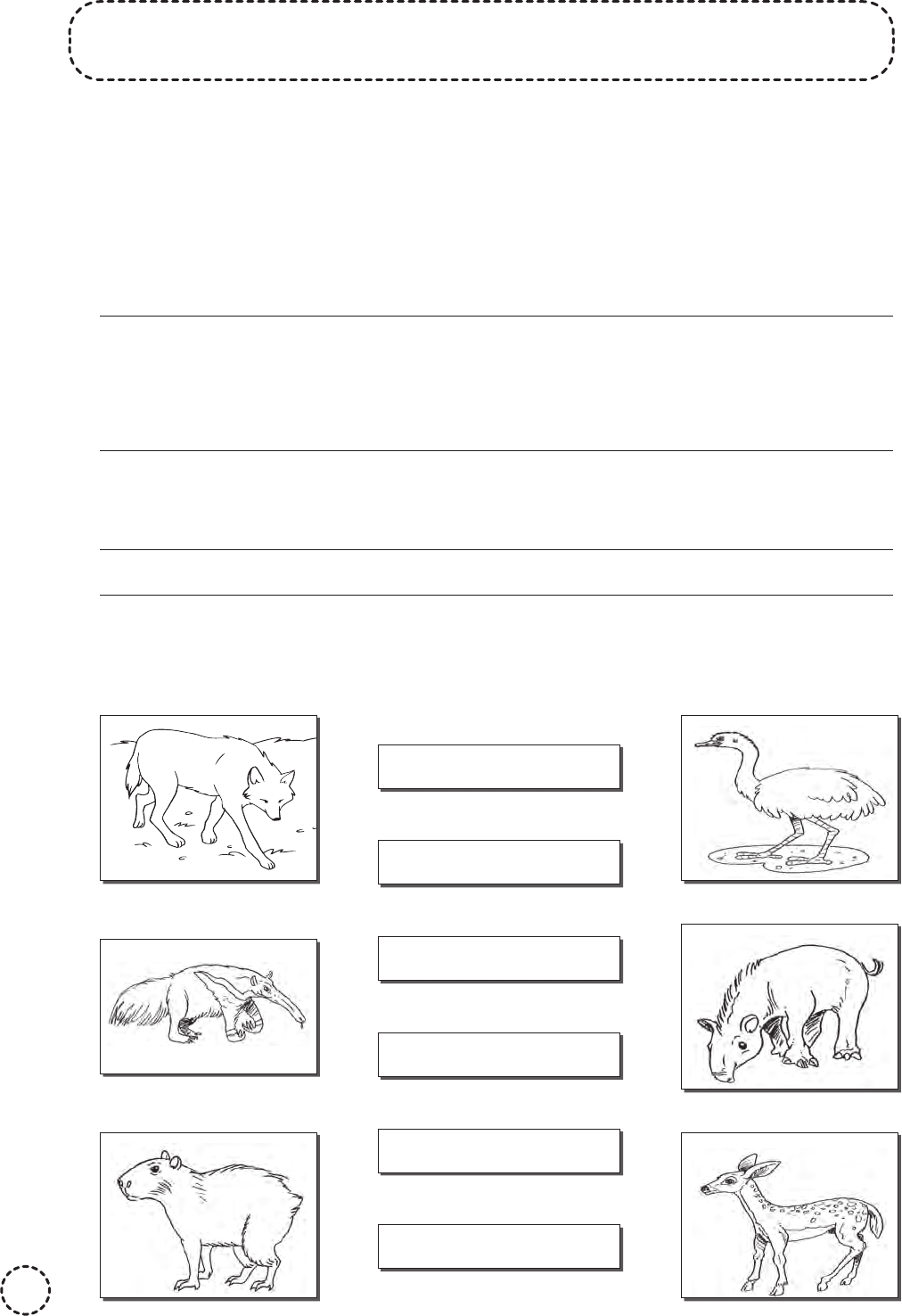 Nome: ________________________________________ Data: ____ /____ /____ 76 CARACTERÍSTICAS DA REGIÃO CENTRO-OESTE 1. Quais são os Estados que compõem a Região Centro-Oeste? 2. Além desses Estados, a Região Centro-Oeste abriga a capital do Brasil. Que nome recebe o território onde se localiza a capital federal? 3. Explique como é a vegetação típica do cerrado do Centro-Oeste. 4. Estes são alguns dos animais encontrados no cerrado da Região Centro-Oeste. Ligue a imagem ao nome que o identifica. tamanduá-bandeira ema lobo-guará capivara veado-campeiro anta ATIV_GEOGRAFIA_5oANO.indd 76ATIV_GEOGRAFIA_5oANO.indd 76 19/03/20 11:0819/03/20 11:08 77 5. Leia o texto e localize no diagrama as palavras destacadas. O cerrado é a vegetação típica do Centro-Oeste, mas também há, ao norte, um trecho da Floresta Amazônica; ao sul, a mata tropical, e campos no Mato Grosso do Sul, além do complexo do Pantanal, que inclui campos, cerrados e florestas. L H P H R A F N L C L V P P G M E C A N J P H G D E J H R A F A H E K V Z H E Z M T B Ç H O Y T Ç R C Z F L O I E W M U A U C A S R A V A U A T L U C J T E I T V A K R L D O L N R F K H G F R I D L O C F B O D P I A T H K O X O I G A H S U H I O J G D F P E S Y C M K U R L R H L H C A I T N O L P A R B T L F J N K T C C I A C O F P A N T A N A L C A S F H V S V A T L U C A S G T L M B A G F L A P U T E R A C A Q T N F L O R E S T A S O L G J D S E W J H B O D P U A T H U C R 6. O clima predominante em quase todo o Centro-Oeste é tropical, mas ao norte o clima muda. Organize as letras e descubra qual é o clima ao norte da Região Centro-Oeste. 4 A 8 I 1 E 7 R 9 A 5 T 2 Q 10 L 3 U 6 O ATIV_GEOGRAFIA_5oANO.indd 77ATIV_GEOGRAFIA_5oANO.indd 77 19/03/20 11:0819/03/20 11:08