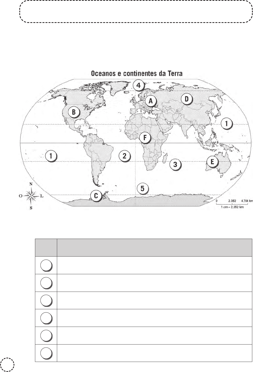 Nome: ________________________________________ Data: ____ /____ /____ 34 QUAL É O CONTINENTE? 1. Observe o planisfério a seguir e responda ao que se pede. a) Nesse planisfério, os nomes dos continentes foram substituídos por letras. Indique a que continente cada letra se refere. Letra Continente A B C D E F ATIV_GEOGRAFIA_5oANO.indd 34ATIV_GEOGRAFIA_5oANO.indd 34 19/03/20 11:0719/03/20 11:07 35 b) No planisfério, os nomes dos oceanos foram substituídos por números. Anote a qual oceano cada número se refere. Número Oceano 1 2 3 4 5 2. Escreva a qual continente estas informações se referem. A O nome deste continente é uma homenagem ao navegador italiano Américo Vespúcio. O continente está subdividido em três porções: parte norte, parte sul e parte central. Cuba, Chile e Canadá fazem parte deste continente. B Continente gelado em que não há ocupação humana fixa. Existem apenas bases de pesquisa científica de diversas nações, entre elas, do Brasil. C Continente formado por centenas de ilhas e grupos de ilhas. É o menor continente em extensão e população, sem contar a Antártida. Polinésia e Austrália pertencem a este continente. ATIV_GEOGRAFIA_5oANO.indd 35ATIV_GEOGRAFIA_5oANO.indd 35 19/03/20 11:0719/03/20 11:07