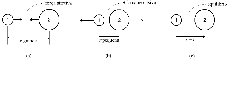 Molécula diatômica Antônio Roque Março 2023 Nesta aula, vamos estudar com algum detalhe um importante exemplo de aplicação do movimento harmônico simples em física e química: a molécula diatômica. 1 A molécula diatômica A molécula diatômica, tipificada por moléculas como HCl ou Cl2, é um sis- tema para o qual o modelo de oscilador harmônico simples desenvolvido nas aulas anteriores pode ser aplicado com grande eficiência. Quando dois átomos estão separados por uma distância relativamente grande1, eles exercem entre si uma força de atração (veja a Figura 1(a)). Figura 1: Ilustrações esquemáticas das situações em que a força entre os átomos em uma molécula diatômica é (a) atrativa, (b) repulsiva e (c) nula (equilíbrio). 1Por ora, não temos como especificar o que queremos dizer por “relativamente grande”; mais abaixo daremos ordens de grandeza para as distâncias mencionadas. 1 5910236 - Física II (Q) Aula 4 - Molécula diatômica Quando os átomos estão muito próximos, eles exercem entre si uma força repulsiva (veja a Figura 1(b)). Existe uma distância intermediária entre r grande e r pequena para a qual a força de interação entre os átomos se anula. Quando eles estão separados por essa distância, r0, os átomos estão em equilíbrio (veja a Figura 1(c)). O significado de equilíbrio é o seguinte: se fosse possível colocar os dois átomos separados exatamente por r0 e deixá-los assim sem qualquer perturbação, eles permaneceriam nesse estado para sempre. A distância r0 é chamada de comprimento de ligação e é sempre da ordem de 1 angstrom (10−10 m). Consideremos o que acontece quando perturbamos um pouquinho o sis- tema em relação à posição de equilíbrio: (a) Se afastarmos os átomos um pouquinho, aparece uma força atrativa entre eles (veja a Figura 2(a)). Os átomos tendem a voltar à posição de equilíbrio. (b) Se aproximarmos os átomos um pouquinho, aparece uma força de repulsão entre eles (veja a Figura 2(b)). Os átomos tendem a voltar à posição de equilíbrio. Figura 2: (a) Quando a separação r entre os átomos é maior que r0, aparece uma força atrativa entre eles. (b) Quando a separação r é menor que r0, aparece uma força repulsiva entre eles. O resultado de uma ou outra pequena perturbaçào é que os átomos co- meçam a oscilar em torno de sua posição de equilíbrio. O tipo de interação entre átomos que origina essas forças atrativas e re- pulsivas é chamado de interação (ou força) de van der Waals, em homenagem ao físico holandês Johannes Diderik van der Waals (1837-1923). Ela só existe 2 5910236 - Física II (Q) Aula 4 - Molécula diatômica para distâncias relativamente pequenas entre os átomos, de poucos ângstrons. Se eles estiverem separados por distâncias maiores que isso, a força entre os átomos é zero (veja a Figura 3) Figura 3: Ilustração das separações entre os átomos para as quais a força entre eles é repulsiva, atrativa ou nula. A origem da interação de van der Waals tem a ver com alterações na densidade de carga nas núvens eletrônicas dos dois átomos e isso só pode ser bem entendido com o auxílio da teoria quântica. Para nossos propósitos aqui, o que importa é que podemos descrever as pequenas oscilações (vibrações) da molécula diatômica usando o modelo de um movimento harmônico simples. Como descrever a força entre os átomos? Considerando que o centro de massa de um dos átomos (por exemplo, o da esquerda) é a origem do sistema de referência, a distância até o centro de massa do outro átomo será r e o comprimento de equilíbrio r0. A força só depende da separação r entre os átomos e não do ângulo entre eles: F = F (r). Observando a Figura 4, vemos que quando a separação entre os átomos r é menor que a distância de equilíbrio r0, a força entre eles é repulsiva (F > 0); e quanto menor r, maior a intensidade da força repulsiva. Por outro lado, quando r é maior que r0 a força entre os átomos é atrativa (F < 0); e quanto maior r, menor a intensidade da força atrativa. Para separações muito grandes, a interação entre os átomos é praticamente nula (F ≈ 0) e podemos dizer que os átomos são indiferentes um ao outro. Portanto, a maneira como a força F (r) varia com a separação r pode ilustrada como no esboço da Figura 5. 3 5910236 - Física II (Q) Aula 4 - Molécula diatômica Figura 4: Distância r entre os átomos, tomando o centro de massa do átomo da esquerda como origem. Figura 5: Esboço da força F (r) entre os átomos em uma molécula diatômica. 4 5910236 - Física II (Q) Aula 4 - Molécula diatômica Vimos em Física I que forças que só dependem da distância entre as partículas do sistema são conservativas. Forças conservativas podem ser as- sociadas a uma energia potencial U(r), de forma que a força F (r) pode ser escrita como F (r) = −dU(r) dr . A função que descreve a força F (r), esboçada na Figura 5, pode então ser integrada para dar o esboço do gráfico da energia potencial U(r) associada à interação entre os átomos em uma molécula diatômica. Fazendo isso, temos um gráfico para U(r) mais ou menos como o esboçado na Figura 6. Como a força é dada pelo negativo da derivada de U , nas regiões em que a inclinação da curva de U é grande a força é grande, e nas regiões em que a inclinação de U é pequena a força é pequena. Note que o mínimo de U(r) deve ocorrer para r = r0. Figura 6: Esboço da função energia potencial U(r) associada à força F (r) da Figura 5. Agora, sabemos (lembre-se das aulas de Física I) que a energia potencial é definida a menos de uma constante arbitrária U(r̄), que é o seu valor num ponto de referência arbitrário r̄. Para o cálculo da força F (r), o importante é a forma da função U(r) e não os seus valores específicos. Portanto, existe uma família infinita de funções possíveis para representar a energia potencia