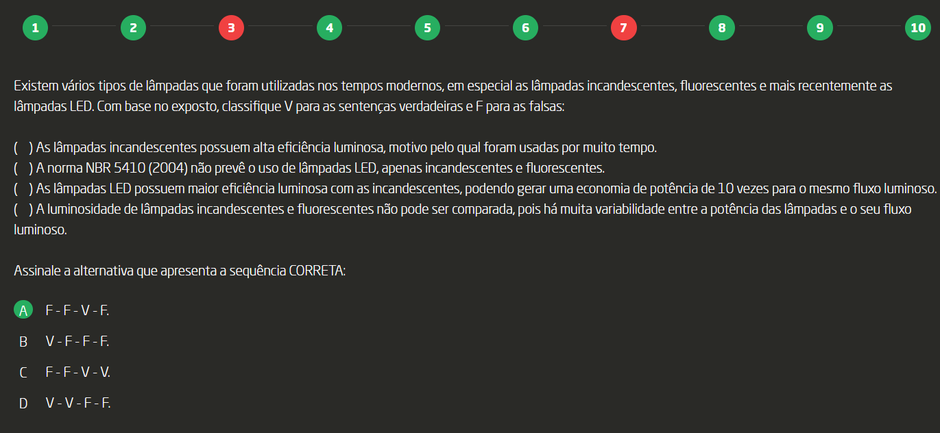 ( ) As lâmpadas incandescentes possuem alta eficiência luminosa, motivo pelo qual foram usadas por muito tempo. ( ) A norma NBR 5410 (2004) não prevê uso de lâmpadas LED, apenas incandescentes e fluorescentes. ( ) As lâmpadas LED possuem maior eficiência luminosa com as incandescentes, podendo gerar uma economia de potência de 10 vezes para mesmo fluxo luminoso. ( ) A luminosidade de lâmpadas incandescentes e fluorescentes não pode ser comparada, pois há muita variabilidade entre a potência das lâmpadas e seu fluxo luminoso. A F-F-V-F B - F-F-V-V D