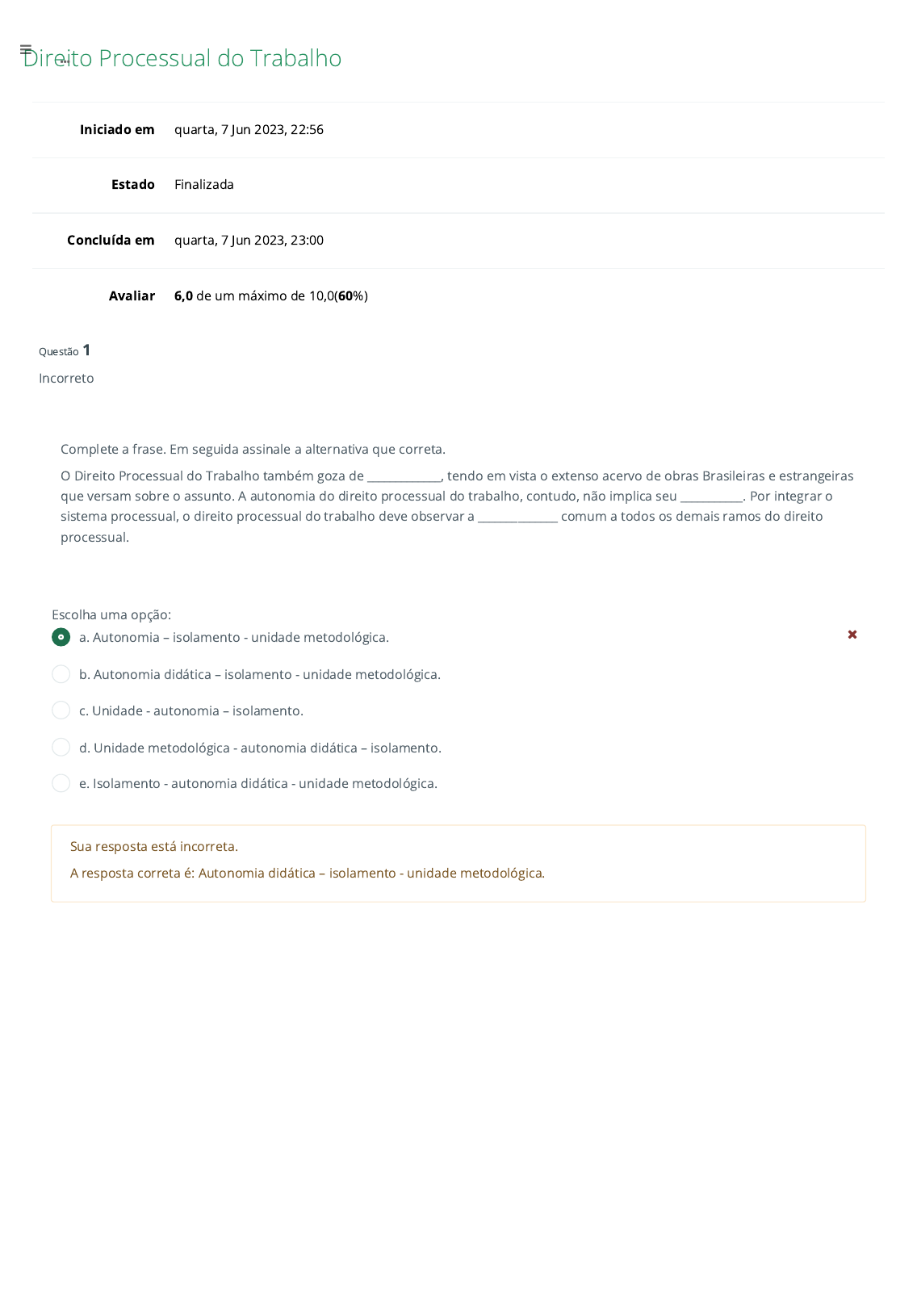Direito Processual do Trabalho Iniciado em quarta, 7 Jun 2023, 22:56 Estado Finalizada Concluída em quarta, 7 Jun 2023, 23:00 Avaliar 6,0 de um máximo de 10,0(60%) Questão 1 Incorreto Complete a frase. Em seguida assinale a alternativa que correta. O Direito Processual do Trabalho também goza de _____________, tendo em vista o extenso acervo de obras Brasileiras e estrangeiras que versam sobre o assunto. A autonomia do direito processual do trabalho, contudo, não implica seu ___________. Por integrar o sistema processual, o direito processual do trabalho deve observar a ______________ comum a todos os demais ramos do direito processual. Escolha uma opção: a. Autonomia – isolamento - unidade metodológica. b. Autonomia didática – isolamento - unidade metodológica. c. Unidade - autonomia – isolamento. d. Unidade metodológica - autonomia didática – isolamento. e. Isolamento - autonomia didática - unidade metodológica. Sua resposta está incorreta. A resposta correta é: Autonomia didática – isolamento - unidade metodológica. https://aula.fael.edu.br/ Questão 2 Correto Questão 3 Correto Percebemos que o processo judicial cria relação jurídica entre as partes e entre as partes e o Estado-juiz, diversa da relação jurídica de Direito material que originou o con�ito de interesse. Quais os sujeitos da relação jurídica do Direito Processual do Trabalho? Marque a alternativa correta. Escolha uma opção: a. O reclamante e o reclamado. b. O reclamante. c. O juiz, o reclamante e o reclamado. A resposta está correta, pois os sujeitos da relação jurídica do Direito Processual do Trabalho da são o juiz, o reclamante e o reclamado. d. O reclamado. e. O juiz. Sua resposta está correta. A resposta correta é: O juiz, o reclamante e o reclamado. No que tange à composição da Justiça do Trabalho no Brasil, é possível assinalar como correta a alternativa correspondente, exceto: Escolha uma opção: a. Servidores dos tribunais do trabalho e varas do trabalho. b. Tribunais Regionais do Trabalho. c. Um Tribunal Superior do Trabalho. d. Juízes do trabalho. e. Servidores dos tribunais do trabalho. A resposta está correta, pois a organização Judiciária Trabalhista está prevista nos art. 111 da Constituição Federal, sendo composta pelos referidos órgãos. Sua resposta está correta. A resposta correta é: Servidores dos tribunais do trabalho. https://aula.fael.edu.br/ Questão 4 Correto Questão 5 Correto De quem será a responsabilidade de integração sistêmica para solucionar con�itos no caso concreto? Assinale a alternativa correta. Escolha uma opção: a. Do julgador. A resposta está correta, pois apenas o julgador poderá realizar a integração sistêmica para solucionar con�itos no caso concreto. b. Do empregado. c. Do servidor do Tribunal de Trabalho. d. Do empregador. e. Das empresas. Sua resposta está correta. A resposta correta é: Do julgador. O Tribunal Pleno é composto por todos os ministros da Corte, é o órgão máximo do TST. Sua competência está prevista no artigo 68 do RITST (Regimento Interno do TST). Marque a alternativa que melhor ilustra sua competência. Escolha uma opção: a. Apenas a revisão de orientação jurisprudencial. b. Eleger, por escrutínio secreto, apenas o Corregedor-Geral da Justiça do Trabalho. c. Dar posse aos membros eleitos para os cargos de direção do Tribunal Superior do Trabalho, aos Ministros nomeados para o Tribunal, aos membros da direção e do Conselho Consultivo da Escola Nacional de Formação e Aperfeiçoamento de Magistrados do Trabalho. A resposta está correta, pois é a única correta sobre a competência do Tribunal Pleno. d. Eleger, por escrutínio secreto, apenas o Presidente e o Vice-Presidente do Tribunal Superior do Trabalho. e. Produzir listas para preenchimento das vagas de Ministro do Tribunal. Sua resposta está correta. A resposta correta é: Dar posse aos membros eleitos para os cargos de direção do Tribunal Superior do Trabalho, aos Ministros nomeados para o Tribunal, aos membros da direção e do Conselho Consultivo da Escola Nacional de Formação e Aperfeiçoamento de Magistrados do Trabalho. https://aula.fael.edu.br/ Questão 6 Incorreto Questão 7 Correto Complete a frase a seguir. Em seguida marque a alternativa correta. É inegável a relação entre ________________ e __________________, o primeiro constitui normas jurídicas autônomas e heterônomas, as quais compõem as diversas fontes normativas trabalhistas, que quando violadas, justi�cam a ativação da ____________________ e ativam o Direito Processual do Trabalho, por ser um conjunto de normas e princípios aplicáveis a solução de _______________ individuais e coletivos de trabalho. Escolha uma opção: a. Con�itos - Direito do Trabalho - Direito Processual do Trabalho – Con�itos. b. Direito Processual do Trabalho - função jurisdicional trabalhista – con�itos - Direito do Trabalho. c. Direito do Trabalho - Direito Processual do Trabalho – con�itos - Direito Processual do Trabalho. d. Direito do Trabalho - Direito Processual do Trabalho - função jurisdicional trabalhista – con�itos. e. Con�itos - Direito do Trabalho - Direito Processual do Trabalho - função jurisdicional trabalhista. Sua resposta está incorreta. A resposta correta é: Direito do Trabalho - Direito Processual do Trabalho - função jurisdicional trabalhista – con�itos. Leia o texto a seguir e em sequência assinale a alternativa que retrata o princípio exposto. “No Direito Processual do Trabalho, a decisão só in�uencia as pessoas que são partes do processo; apenas após a citação do demandado é que a relação jurídica processual estará completa; o juiz só promulga a sentença após ouvir as partes.” Escolha uma opção: a. Princípio da igualdade. b. Princípio da Publicidade e da Motivação das Decisões. c. Princípio do Contraditório e da Ampla Defesa. A resposta está correta, pois 