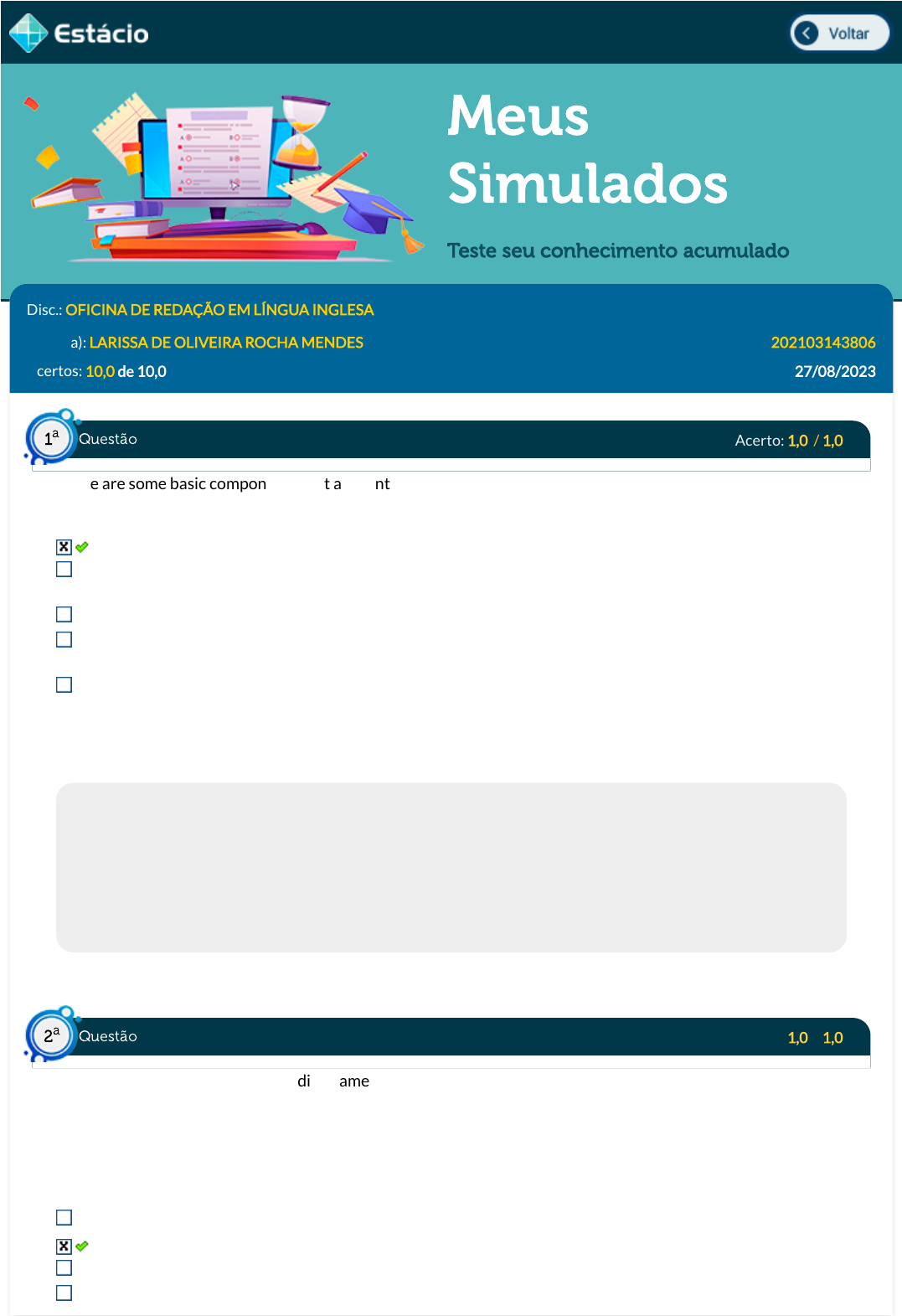 Meus Simulados Teste seu conhecimento acumulado Disc.: OFICINA DE REDAÇÃO EM LÍNGUA INGLESA Aluno(a): LARISSA DE OLIVEIRA ROCHA MENDES 202103143806 Acertos: 10,0 de 10,0 27/08/2023 Acerto: 1,0 / 1,0 There are some basic components that account for the narrative's internal structure. Mark the alternative that presents a correct statement about a narrative's features: The Past Perfect is typically used in narratives to signal which action came about �rst. A narrative¿s temporal juncture is always strictly organized by the chronological sequencing of events that make up the plot. Present tenses �gure among the most recurrent verb forms within narratives. When a logical cause-and-effect relationship unites the chain of events, the narrative tends to sound more far-fetched. Actions narrated in the past tend to make experiences sound fresh and vivid, charging them with more emotional tension. Respondido em 27/08/2023 17:20:01 Explicação: The past tenses are commonly used in narratives. To convey that a past action happened before another one, the past perfect is chosen. Therefore, the past perfect plays an important function in the sequencing of past actions, since it points out those events that happened at an earlier point in time. Cause-and-effect relationships make the narrative sound more plausible and not the other way around. What¿s more, to make experiences sound fresh and vivid, the historical present is usually preferred. The correct option is then: "The Past Perfect is typically used in narratives to signal which action came about �rst." Acerto: 1,0 / 1,0 This wiki entry describes a typical dish named "ceviche". Read it and choose the correct alternative: "Because the dish is eaten raw, and not cooked with heat, it must be prepared fresh and consumed immediately to minimize the risk of food poisoning. Ceviche is often eaten as an appetizer; if eaten as a main dish, it is usually accompanied by side dishes that complement its �avors, such as sweet potato, lettuce, maize, avocado, or cooking banana." Retrieved from: https://en.wikipedia.org/wiki/Ceviche According to such description, about a quarter of the ingredients are raw. The expression "accompanied by" introduces a componential description in the de�nition. Such an entry provides a chronological description of a ceviche recipe. This description provides an account of consuming rates of the dish. Questão1 a Questão2 a https://simulado.estacio.br/alunos/inicio.asp javascript:voltar(); It consists of a process description on how to decrease food poisoning rates caused by the consumption of the dish. Respondido em 27/08/2023 17:19:54 Explicação: Indeed, when listing the complements of ceviche introduced by the expression "accompanied by", the author introduces the elements and traits that usually compose the dish. Therefore, the expression introduces a componential element to the entry. There¿s no chronological description entailed in the entry, nor is any process being described. Furthermore, the dish is completely raw and there is no consuming rate presented. Acerto: 1,0 / 1,0 Evaluation is a part of the narrative especially crafted so that the emotional impact of the narrated experience can be transmitted to its readers or listeners. Mark the option in which hooks shares her evaluation of the narrated events with her readers. All the options below were retrieved from: hooks, bell. Talking Back: Thinking Feminist, Thinking Black. Chapter 22: Writing Autobiography. Routledge: New York, 2015 "I remembered my mother's hope chest, with its wonderful odor of cedar, and thought about her taking the most precious items and placing them there for safekeeping". "I had met a young black man. We were having an affair". "Within the world of my childhood, we held on to the legacy of a distinct black culture by listening to the elders tell their stories". "He drank often, smoked cigarettes, and always on the few occasions that we met him, he held us children in tight embraces. It was the memory of those embraces--of the way I hated and longed to resist them-that I recalled". "it was also interesting to read the narrative in its entirety after I had completed the work. It had not occurred to me that bringing one's past, one's memories together in a complete narrative would allow one to view them from a different perspective, not as singular isolated events but as part of a continuum". Respondido em 27/08/2023 17:23:48 Explicação: Evaluations are parts of the narrative in which the narrator shares his feelings and viewpoints on the narrated events with readers, sharing with them their emotional effects. In this excerpt: "it was also interesting to read the narrative in its entirety after I had completed the work (¿)", hooks tells her readers that writing her memories allowed her to view her own story from a different perspective. Acerto: 1,0 / 1,0 The graph below provides an overview of average fertility rates in Algeria throughout the years. Read it and complete the description with the appropriate expressions: Questão3 a Questão4 a Retrieved from: https://www.sbs.com.au/nitv/nitv-news/article/2017/06/27/census-2016-aboriginal-and- torres-strait-islander-population-growing In Algeria, women give birth to (1)_____________ of 2.535 children every year and this fertility (2)_____________ is expected to (3)_____________ . (1) an average/ (2) rate/ (3) decrease. (1) the exact number of/ (2) rate/ (3) fall. (1) an average/ (2) rate/ (3) soar. (1) an average/ (2) percentage/ (3) increase. (1) approximately/ (2) estimate/ (3) plunge. Respondido em 27/08/2023 17:20:34 Explicação: This bar graph shows average or estimative proportions of birth rates in the country. In addition, both the numbers and the reduction of the bars from left to right indicate a decreasing pattern as years pass. Acerto: 1,0 / 1,0 Read the extract of a supporting paragraph and choose the option which justi�es the use of each structure highlighted. "In