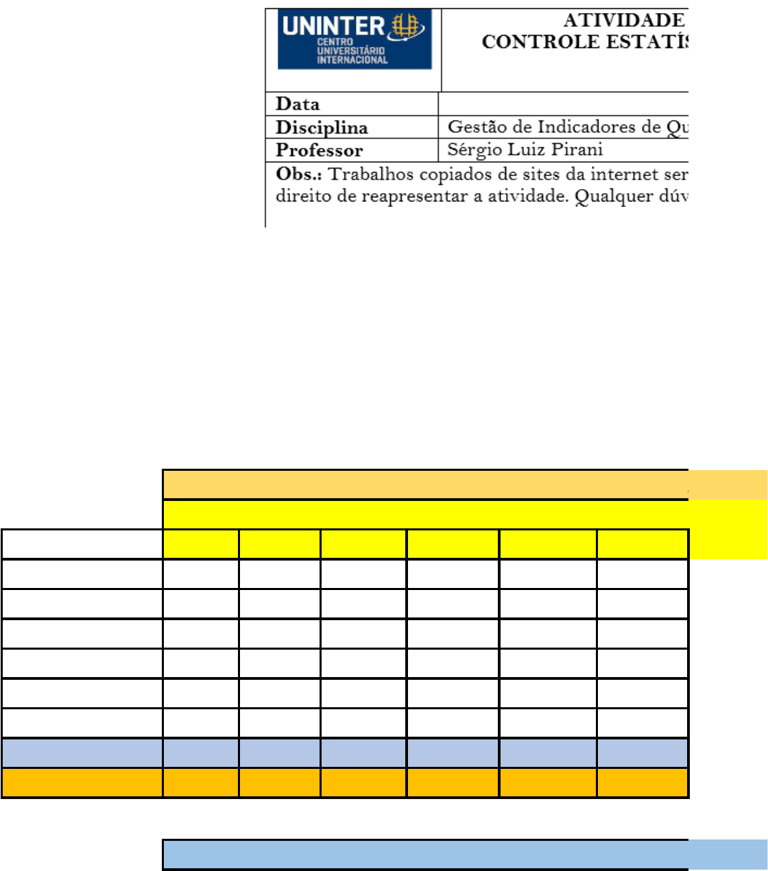 Planilha1 ATIVIDADE PRÁTICA - CONTROLE ESTATÍSTICO DO PROCESSO (CEP) Material da Aula 4 Controle Estatítico do Processo - CEP Uma indústria emprega o Controle Estatístico do Processo - CEP como uma das ferramentas para o controle de qualidade em sua linha de produção de produtos em PVC. Os dados a seguir são as leitura dos diâmetros dos tubos em PVC de 150mm, sendo essa a medida padrão a ser obedecida. O desvio padrão a ser obedecido pelas normas é de 0,2mm para mais ou para menos. Pede-se: 1. determine as médias e as médias das médias das leituras; 2. determine a amplitude das amostras e a amplitude média das amostras; 3. determine os limites superior, médio e inferior com as leituras das amostras e construa o gráfico das médias; 4. construa o gráfico das amplitudes das amostras; 5. com a representação gráfica faça a análise se o processo está sob controle estatístico ou não; 6. comente sobre as possíveis causas se estiver fora do CEP. INFORMAÇÕES DOS PESOS REALIZADOS POR UNIDADE DOS ELEMENTOS NÚMERO DE AMOSTRAS (medidas em cm) ELEMENTOS 1 2 3 4 5 6 7 8 9 10 11 12 1 14.89 15.25 14.99 15.25 15.15 15.05 15.17 15.05 15.05 15.05 14.97 15.02 2 15.17 15.05 15.05 15.30 15.25 15.17 15.05 15.15 15.30 15.17 15.05 15.17 3 15.25 15.17 15.15 15.05 15.17 15.00 15.15 15.05 14.98 15.17 15.25 15.25 4 15.00 15.05 15.05 15.17 15.35 15.33 15.05 15.05 15.17 15.05 15.25 15.30 5 15.30 15.17 15.17 15.15 15.05 15.25 15.25 15.28 15.05 15.15 15.26 15.17 6 15.15 15.30 15.30 15.25 15.05 15.05 15.29 15.17 15.25 15.05 15.05 15.05 MÉDIA AMPLITUDE (R) TABELAS PARA OS CÁLCULOS DOS GRÁFICOS DE CONTROLE E AMPLITUDE DISTRIBUÇÃO NORMAL (Z) PROBABILIDADE (%) 90 91 92 93 94 95 Z 1.65 1.7 1.75 1.81 1.88 1.96 COEFICIENTES PARA OS GRÁFICOS DAS MÉDIAS, DESVIO PADRÃO E GRÁFICOS DAS AMPLITUDES n 2 3 4 5 6 7 8 9 10 11 12 A 1.880 1.023 0.729 0.577 0.483 0.419 0.373 0.337 0.308 0.285 0.266 D4 3.268 2.574 2.282 2.115 2.004 1.924 1.864 1.816 1.777 1.744 1.716 D3 - 0 - 0 - 0 - 0 - 0 0.076 0.136 0.184 0.223 2.256 0.284 d2 1.280 1.69 2.059 2.326 2.534 2.704 2.847 2.970 3.078 3.173 3.258 GRÁFICO DAS MÉDIAS FAÇA O GRÁFICO AQUI AM LIC LEITURAS (MÉDIAS) LM LSC LSC = LM = LIC = GRÁFICO DAS AMPLITUDES FAÇA O GRÁFICO AQUI AM LIC LEITURAS (MÉDIAS) LM LSC LSC = LM = LIC =