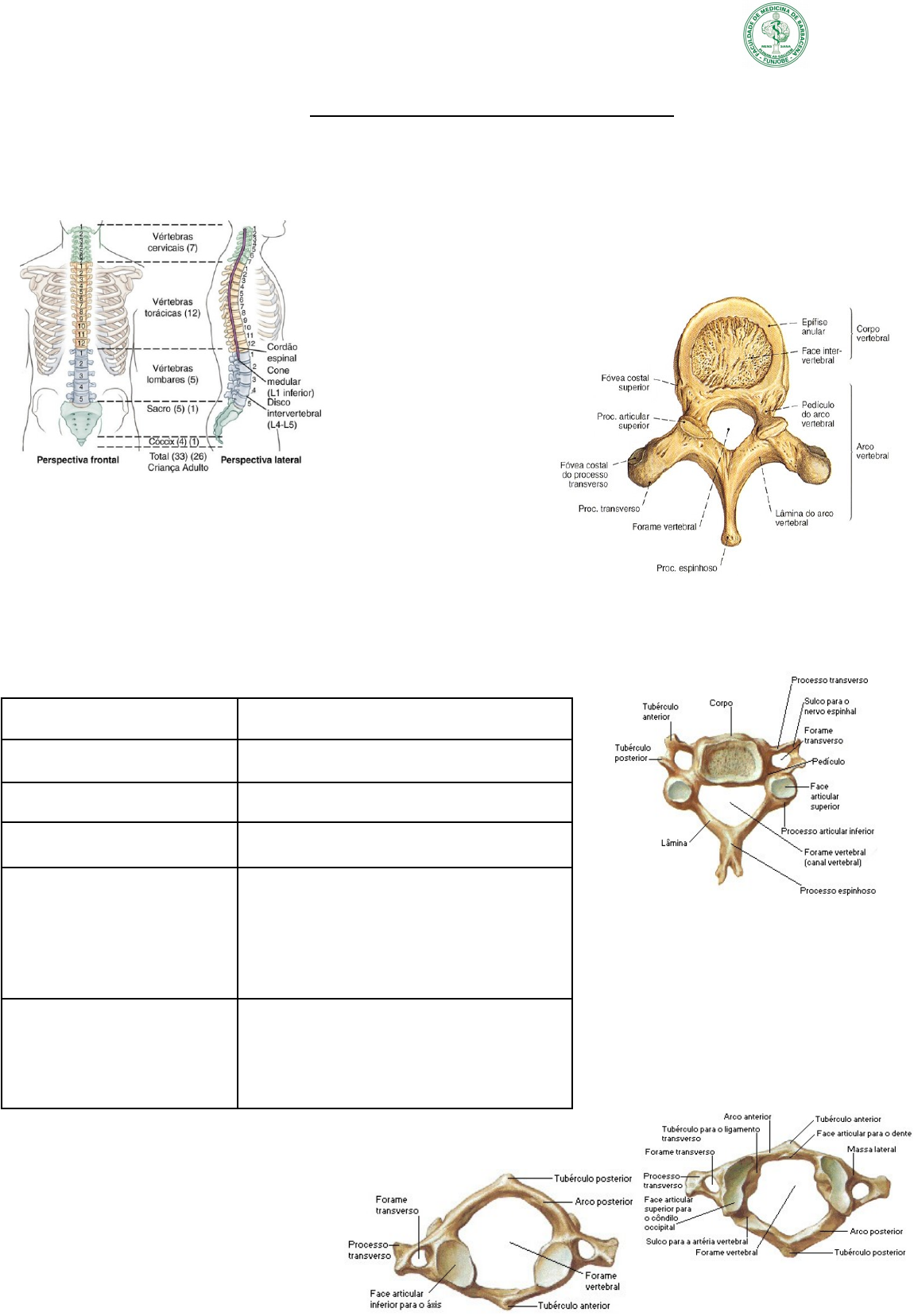 ANATOMIA DO APARELHO LOCOMOTOR - PROGRAMA DE INICIAÇÃO À DOCÊNCIA - PID / 2019 MONITORA: JÚLIA KÁSSIA PEREIRA VÉRTEBRAS E COLUNA VERTEBRAL · VÉRTEBRAS · Formam a coluna vertebral, somadas aos discos intervertebrais · Tornam-se maiores a medida que a coluna vertebral desce até o sacro, depois tornam-se menores até o ápice do cóccix · COMPONENTES DAS VÉRTEBRAS · Corpo vertebral → osso trabecular (medula óssea vermelha) · Processo espinhoso (1) · Processo transverso (2) · Processos articulares (4) · Arco vertebral: lâminas e pedículo · Forame vertebral → canal vertebral · Forame intervertebral · VÉRTEBRAS CERVICAIS · C1-C7 · Forame transversário no processo transverso → artérias vertebrais e veias acompanhantes (exceto C VII → pequenas veias vertebrais acessórias) · Processos transversos terminam em tubérculos anteriores e posterior → C6: tubérculos caróticos (compressão da artéria comum) · C3 a C7: vértebras cervicais típicas ( VÉRTEBRA CERVICAL TÍPICA )VÉRTEBRA CERVICAL TÍPICA PARTE CARACTERÍSTICAS Corpo vertebral Pequeno; unco do corpo Forame vertebral Grande e triangular Processos transversos Forames transversários e tubérculos anterior e posterior Processos articulares Faces articulares superiores direcionadas superoposteriormente; faces articulares inferiores direcionadas inferoanteriormente; as faces articulares oblíquas são quase horizontais nessa região Processos espinhosos Curtos (C III–C V) e bífidos (C III–C VI); processo de C VI longo, o processo de C VII é mais ( VISTA SUPERIOR DE C1 )longo (por isso, C VII é denominada “vértebra proeminente”) · ATLAS (C1) · Sem corpo nem processo espinhoso · Par de massas laterais, sustentando o peso do crânio globoso. · As faces articulares superiores côncavas articulam-se os côndilos occipitais, nas laterais do forame magno. · ( VISTA INFERIOR DE C1 )Os arcos anteriores e posteriores (tubérculo no centro da sua face externa) formam um anel completo. · ( VISTA POSTERIOR DE C2 ) ( VISTA ANTERIOR DE C2 )AXIS (C2) · CI gira sobre CII para realizar o movimento de “não” com a cabeça · Dente: eixo em torno do qual ocorre a rotação da cabeça. Mantido em posição pelo ligamento transverso do atlas, impedindo o deslocamento posterior do dente e o anterior do atlas. · CII tem um grande processo espinhoso bífido, podendo ser palpado no sulco nucal. · C7 · Processo espinhoso longo: vértebra proeminente · VÉRTEBRAS TORÁCICAS · T1-T12 · Fixação das costelas → fóveas costais · T5-T8 típicas · T10: estresse de transição → rotação, flexão e extensão · Fratura de vértebras torácicas provavelmente causará lesão de medula espinal. VÉRTEBRA TORÁCICA TÍPICA PARTE CARACTERÍSTICAS Corpo vertebral Formato de coração; uma ou duas fóveas costais para articulação com a cabeça da costela Forame vertebral Circular e menor do que os forames das vértebras cervicais e lombares Processos transversos Longos e fortes e estendem-se posterolateralmente; o comprimento diminui de T I para T XII (TI a T X têm faces para articulação com o tubérculo da costela) Processos articulares Faces articulares quase verticais Processos espinhosos Longos; inclinados posteroinferiormente; as extremidades estendem-se até o nível do corpo vertebral abaixo · VÉRTEBRAS LOMBARES · L1-L5 · Flexão, extensão, flexão lateral; rotação impedida. · Processos mamilares e acessórios: fixação muscular · Peso do corpo é transmitido da vértebra L V para a base do sacro, formada pela face superior da vértebra S I. VÉRTEBRA LOMBAR TÍPICA PARTE CARACTERÍSTICAS Corpo vertebral Grande; reniforme quando visto superiormente Forame vertebral Triangular; maior que nas vértebras torácicas e menor que nas vértebras cervicais Processos transversos Longos e delgados; processo acessório na face posterior da base de cada processo Processos articulares Faces articulares quase verticais; faces articulares superiores voltadas posteromedialmente (ou medialmente); faces articulares inferiores direcionadas anterolateralmente (ou lateralmente); processo mamilar na face posterior de cada processo articular superior Processos espinhosos Curtos e fortes; espessos, largos e em forma de machadinha · SACRO · S1-S5 · Em adultos, cinco vértebras fundidas. Entre os ossos do quadril e forma o teto e a parede posterossuperior da cavidade pélvica. · Transmite o peso do corpo ao cíngulo do membro inferior. · Canal sacral: cauda equina · Forames sacrais · Promontório: margem projetada anteriormente do corpo da vértebra S I · Ângulo lombossacral · CÓCCIX · Co1-Co4 · Fusão das 4 vértebras coccígeas após os 30 anos → cóccix · CURVATURAS DA COLUNA VERTEBRAL · 4 curvaturas · Lordoses (cervical e lombar) – curvaturas secundárias · Cifose (torácica e sacrococcígea) – curvaturas primárias · ARTICULAÇÕES DOS CORPOS VERTEBRAIS · Sínfises (articulações cartilagíneas secundárias) · Sustentação de peso · Ligamento longitudinal anterior · Ligamento longitudinal posterior · Disco intervertebral · Anel fibroso → lâminas concêntricas de fibrocartilagem; mais fino posteriormente · Núcleo pulposo → avascular (difusão); posicionado entre o centro e a face posterior do disco · Inexistente entre CI e CII · ARTICULAÇÕES DOS ARCOS VERTEBRAIS · Articulações dos processos articulares ou zigapofisárias → sinoviais planas · Ligamentos amarelos → união das lâminas dos arcos vertebrais · Ligamentos interespinais → união dos processos espinhosos adjacentes · Ligamentos supraespinais → união das extremidades dos processos espinhosos desde CVII até o sacro · Ligamento nucal → desde a protuberância occipital externa e margem posterior do forame magno até os processos espinhosos das vértebras cervicais · Ligamentos intertransversários → união de processos transversos adjacentes · ARTICULAÇÃO ATLANTOCCIPITAL · Acenar 