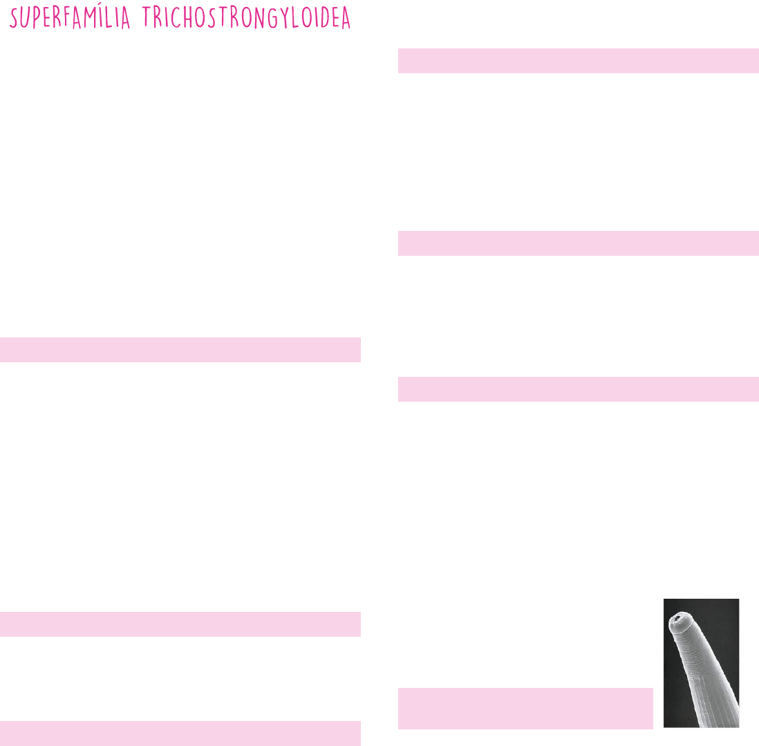Nematóides delgados (finos) e pequenos Macho com bolsa copuladora bem desenvolvida Espículos curtos e grossos-> levam o sêmen até a fêmea Possuem abertura oral sem dentes ou placa cuticular Os lábios quando presentes são geralmente pouco desenvolvidos Cápsula bucal ausente ou podendo ser pequena Ciclo monóxeno (diretos): eliminação de ovos nas fezes Ovos morulados, casca dupla e fina, possui forma elíptica, alongada Infecção passiva por L3-forma infectante PRINCIPAIS GÊNEROS 1) Haemonchus: abomaso 2) Ostertagia: abomaso 3) Truchostrongylus: intestino delgado e estomago de várias espécies 4) Cooperia: IG de ruminantes, estômago de suínos 5) T. axei- HD: abomaso de ruminantes e estômago de equinos e suínos 6) T. vitrinus: ovinos e caprinos 7) T. capricola: ovinos e caprinos 8) T retortaeformis: coelhos 9) T tenuis: intestino delgado e ceco de aves de caça SINAIS CLÍNICOS Perda de peso, pelo opaco, apatia, anorexia, animal quieto, debilidade, edema de barbela, diarreia, dilatação do abdômen (ascite), mucosas pálidas, febre no início dos sinais GÊNERO HAEMONCHUS Hematófagos -> agressivos Maior que os outros da família Fêmeas maiores (1,8 a 3 cm) que os machos (0,1 a 1,2 cm) Cápsula bucal pequena com um pino dente ou lanceta (estrutura saliente para fora do corpo) Papilas cervicais Hd: ruminantes Localização: abomaso Espécies: H. contortus, H. placei e H. similis Raio dorsal que fica no meio do verme em formado de Y Edema submandiblar em Haemoncos sp. Pode levar os animais a morte -> edema de barbela GÊNERO COOPERIA São em forma de vírgula Cooperia pectinata -> ruminantes (ID) Cooperia punctata-> ruminantes (ID) Grande carga parasitária Cooperia oncophora -> Bovinos Cooperia surnabada (C. mcmasteri)-> bovinos e ovinos Cooperia cuticei -> ovinos, caprinos GÊNERO OSTERTAGIA E TELADORSAGIA Teladorsagia -> abomaso ovinos e caprinos Ostertagia -> abomaso de bovinos O. teladorsagia circumcinta- ovinos, caprinos “verme do estômago marrom” O. trifurcata- ovinos, caprinos Infecções secundárias GÊNERO HYOSTRONGYLUS H. rubidus -> Estômago de suínos Dos ovos expulsos nas fezes emerge no ambiente uma L1, a qual num período de aproximadamente de 7 dias, sofre 2 mudas e chega a L3 (forma infectante) que penetram no estômago pelas glândulas fúndicas onde passam para L4 (4 a 5 dias) e em 15 dias de se transformam em L5 e depois voltam para o lúmen gástrico onde irão copular, fazer a ovo postura que vão ser eliminados nas fezes. Morfologia: vermes finos e avermelhado ou marrom, de 5 a 8 mm de comprimento. Extremidade anterior: pequena vesícula cefálica IMPORTÂNCIA EM MEDICINA VETERINÁRIA Quanto maior o nº de animais por hectare de pastagem, maior a probabilidade de ocorrerem as infecções (inapetência, anemia, debilidade, redução no ganho de peso, infecções maciças podem causar gastroenterites) Os animais jovens são mais susceptíveis pois os adultos adquirem uma certam imunidade Bov e ov podem ter vários gêneros de parasitos ao mesmo tempo Pode ocorrer hipobiose sazonal (estresse térmico, hospedeiro debilitado) em larvas L4 (climas temperados) Ou associada à resposta imunológica IDENTIFICAÇÃO: OPG: ovos por grama de fezes Coprocultura -> larvas Necropsia -> adultos Dictyocaulus viviparus -> bovinos e cervos Dictyocaulus filaria -> ovinos e caprinos Dictyocaulus arnfieldi -> equinos e asininos Metastrongylus apri Metastrongylus salmi -> suínos CARACTERÍSTICAS Vermes respiratórios, filiformes, ciclo direto Local: traquéia, brônquios -> “verme dos pulmões” ♂ - 4 cm - ♀ - 6 a 8 cm Boca trilabiada e esôfago filariforme Raio bursal da bolsa copuladora em forma de v Dictyocaulus viviparus -> brônquios e bronquíolos de bovinos e cervos Dictyocaulus arnfield -> brônquios e bronquíolos de equinos e asininos Dictyocaulus filaria -> brônquios e bronquíolos de ovinos e caprinos CICLO BIOLÓGICO GERAL Postura de ovos larvados feita nos brônquios e bronquíolos - podem ser expelidos para o ambiente pela cavidade oral ou nasal ou deglutidos. Algumas L1 podem ser expelidas por secreção nasal. No tubo digestivo ocorre a eclosão da L1, que sai nas fezes e se alimenta de bactérias. No ambiente passa a L2 e depois L3, que não perde a cutícula de L2. O Hospedeiro infecta-se ao ingerir a L3 nas pastagens, que é liberada no estômago e penetra na mucosa do intestino delgado, ganhando preferencialmente a circulação linfática. Nos gânglios linfáticos ocorre a muda para L4 e essa vai para o coração e pulmão, onde penetra no parênquima pulmonar, passando a L5. A L5 vai aos brônquios e bronquíolos sofrer a maturação sexual e postura. PPP = 2 meses. IMPORTÂNCIA Bronquite parasitária, tosse, pneumonia verminótica, dictiocaulose O animal fica em posição ortopnéica: membros anteriores afastados, pescoço esticado para frente e boca aberta Pode levar a morte Espirros, corrimento nasal, sensação de engasgo Vermes brancos e grandes (até 6cm) Um par de lábios trilobados Espículos longos e finos Bolsa bem desenvolvida, vulva próximo ao ânus Ovo larvado, com casca espessa, irregular, resistentes (até um ano no solo) Prevalente em suínos de 4 a 6 semanas de idade Observado em animais criados no solo onde há hospedeiro intermediário CICLO Fêmeas ovíparas põem ovos larvados (L1) que são ingeridos por uma minhoca (desenvolvimento em L3 em 10 dias – podendo ficar até 7 anos). Suínos ingerem minhocas e as L3 liberadas seguem para linfonodos mesentéricos (muda para L4) – pulmão (muda final). PPP: 4 semanas IMPORTÂNCIA Consolidação pulmonar, hipertrofia muscular brônquica e hiperplasia linfoide peribrônquica Hipersecreção de muco bronquiolar Bronquite crônica e enfisema pulmonar Mais prevalente em suínos de 4 a 6 meses de idade Identificação: técnica de Baerman