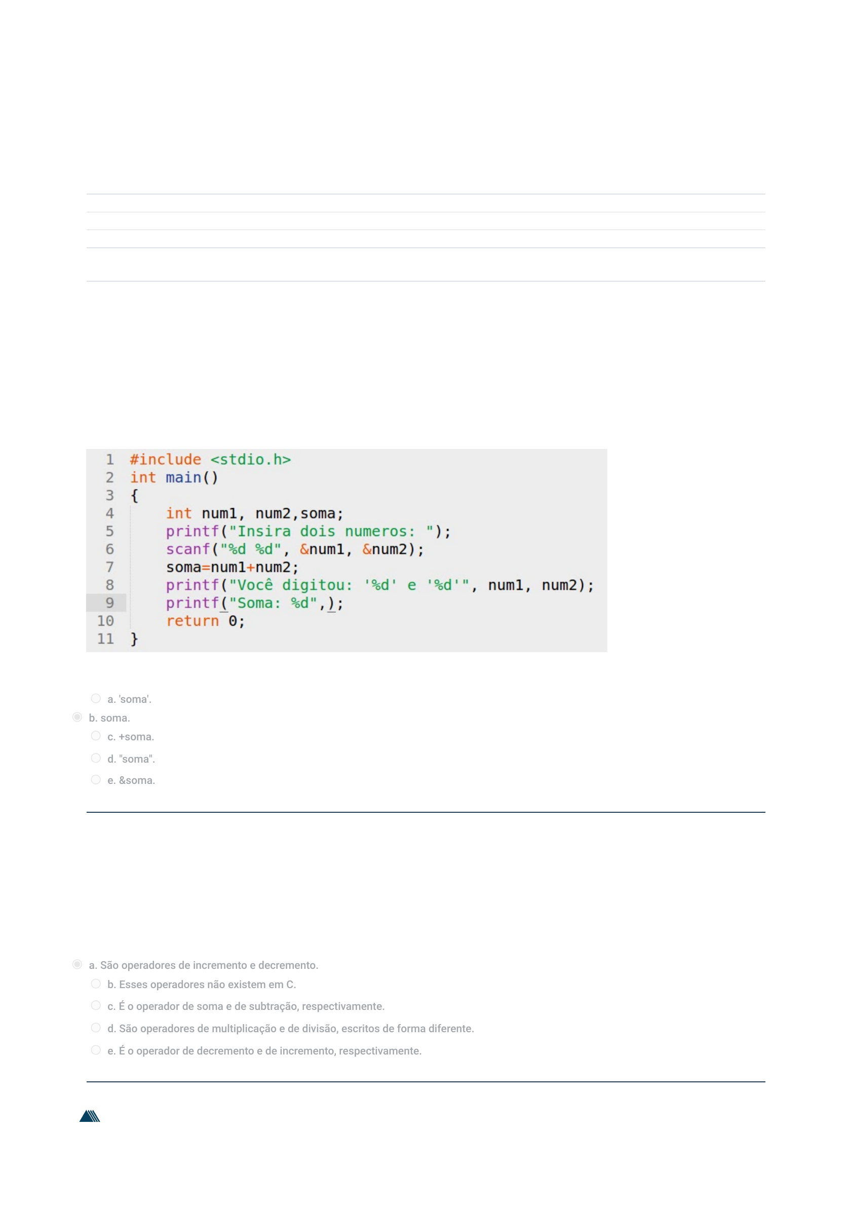 16/09/2020 Unidade 2 - Exercícios de fixação: avaliação da tentativa https://portalacademico.eniac.edu.br/mod/quiz/review.php?attempt=532026&cmid=189023 1/6 Página inicial / Cursos / Faculdade / 20202F / 20202F - DISCIPLINAS REGULARES / SETEMBRO / ENIAC_20202F_14447 / Materiais de Estudo / Unidade 2 - Exercícios de �xação Iniciado em quarta, 16 set 2020, 20:06 Estado Finalizada Concluída em quarta, 16 set 2020, 20:17 Tempo empregado 10 minutos 53 segundos Avaliar 10,00 de um máximo de 10,00(100%) Questão 1 Correto Atingiu 1,00 de 1,00 Questão 2 Correto Atingiu 1,00 de 1,00 O que está faltando na linha 9 para que seja mostrado o seguinte texto: Soma:, seguido do valor da soma dos dois números digitados pelo usuário. Escolha uma: a. 'soma'. b. soma. c. +soma. d. "soma". e. &soma. Qual é a função dos operadores ++ e -- na linguagem C, respectivamente? Escolha uma: a. São operadores de incremento e decremento. b. Esses operadores não existem em C. c. É o operador de soma e de subtração, respectivamente. d. São operadores de multiplicação e de divisão, escritos de forma diferente. e. É o operador de decremento e de incremento, respectivamente. https://portalacademico.eniac.edu.br/ https://portalacademico.eniac.edu.br/course/index.php https://portalacademico.eniac.edu.br/course/index.php?categoryid=28 https://portalacademico.eniac.edu.br/course/index.php?categoryid=74 https://portalacademico.eniac.edu.br/course/index.php?categoryid=82 https://portalacademico.eniac.edu.br/course/index.php?categoryid=107 https://portalacademico.eniac.edu.br/course/view.php?id=7595 https://portalacademico.eniac.edu.br/course/view.php?id=7595#section-1 https://portalacademico.eniac.edu.br/mod/quiz/view.php?id=189023 https://atendimento.eniac.edu.br/faculdade 16/09/2020 Unidade 2 - Exercícios de fixação: avaliação da tentativa https://portalacademico.eniac.edu.br/mod/quiz/review.php?attempt=532026&cmid=189023 2/6 Questão 3 Correto Atingiu 1,00 de 1,00 Questão 4 Correto Atingiu 1,00 de 1,00 Considerando o seguinte código, qual o valor das variáveis x e y no �nal da execução? Escolha uma: a. X é 17 e y é 17. b. Não é possível determinar os valores das variáveis. c. X é 25 e y é 25. d. X é 25 e y é 17. e. X é 17 e y é 25. Avalie o seguinte código, e diga qual é o resultado que será impresso. Escolha uma: a. 15.7. b. 8. c. 20.10. d. 11. e. 10.10. 16/09/2020 Unidade 2 - Exercícios de fixação: avaliação da tentativa https://portalacademico.eniac.edu.br/mod/quiz/review.php?attempt=532026&cmid=189023 3/6 Questão 5 Correto Atingiu 1,00 de 1,00 Questão 6 Correto Atingiu 1,00 de 1,00 Assinale a opção que indica a diferença entre os operadores = e ==, ambos utilizados na linguagem C. Escolha uma: a. Não existe diferença, os dois operandos são de atribuição. b. Não existe diferença, os dois operandos são relacionais, utilizados para avaliar se dois valores são iguais. c. == é um operando de atribuição, e = é um operando relacional que avalia se duas variáveis são iguais. d. Esses operandos não existem na linguagem C. e. = é um operando de atribuição, e == é um operando relacional que avalia se duas variáveis são iguais. Qual a de�nição de uma função em linguagem de programação? Escolha uma: a. Uma função é a forma com que os usuários entram com os dados em um programa. b. Uma função é uma entidade básica de um sistema computacional e existe somente em linguagens antigas. c. Uma função é um conjunto de instruções organizadas em forma de bloco e que têm um nome para que assim sejam utilizadas em um código-fonte. d. Uma função é uma regra matemática utilizada em programação para realizar cálculos. e. É uma regra para acesso de forma mais simples à memória do computador. 16/09/2020 Unidade 2 - Exercícios de fixação: avaliação da tentativa https://portalacademico.eniac.edu.br/mod/quiz/review.php?attempt=532026&cmid=189023 4/6 Questão 7 Correto Atingiu 1,00 de 1,00 Questão 8 Correto Atingiu 1,00 de 1,00 Considerando o trecho de código, qual é o valor que será impresso na tela ao �nal da execução? Escolha uma: a. 7.00. b. 7. c. 7.5. d. Não é possível determinar, pois a variável resultado não foi inicializada. e. Não se pode realizar operações com números inteiros e armazenar em uma variável do tipo �oat. Portanto, esse código não é executado, havendo um erro de sintaxe. Qual o valor da variável após a execução do seguinte código: Escolha uma: a. O valor da variável x é um endereço de memória. b. Nada. Ocorre um erro, pois não é possível realizar uma operação do tipo x-2. c. 18. d. -2. e. 16. 16/09/2020 Unidade 2 - Exercícios de fixação: avaliação da tentativa https://portalacademico.eniac.edu.br/mod/quiz/review.php?attempt=532026&cmid=189023 5/6 Questão 9 Correto Atingiu 1,00 de 1,00 Questão 10 Correto Atingiu 1,00 de 1,00 Considerando o trecho de código escrito na linguagem C, qual é o valor da variável resultado1? Escolha uma: a. 56.5. b. É impossível determinar, pois em C não se pode fazer operações aritméticas com tipos diferentes. c. 7. d. 7.5. e. 56. Para que servem as funções printf e scanf? Escolha uma: a. São funções utilizadas para realizar operações de impressão de um arquivo em um impressora e acesso ao scanner conectado à máquina. b. São funções para realização de operações matemáticas em um computador. c. A função printf mostra um valor na tela do computador e a função scanf serve para armazenar valores dentro de uma variável. d. São instruções de acesso à memória. e. A função printf armazena um valor em uma determinada variável, já a função scanf mostra um valor na tela. 16/09/2020 Unidade 2 - Exercícios de fixação: avaliação da tentativa https://portalacademico.eniac.edu.br/mod/quiz/review.php?attempt=532026&cmid=189023 6/6 ◄ Assunto 04 - Operadores Seguir para... Assunto 05 - Estruturas de Seleçã