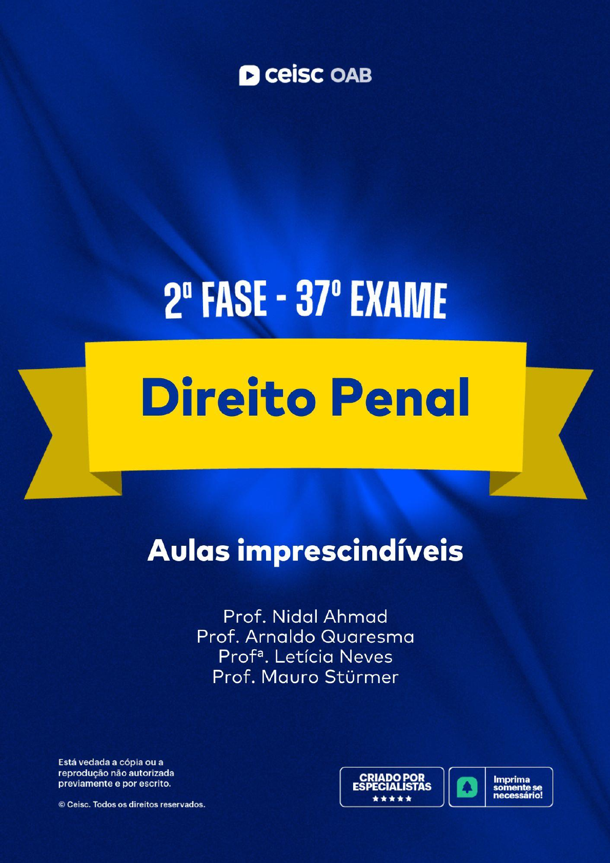1 Aulas imprescindíveis 2 Olá, Alunos! Sejam bem-vindos ao E-book das aulas imprescindíveis! O presente E-book contém os conteúdos referentes as aulas imprescindíveis do nosso curso. Com o intuito de facilitar a sua localização, o presente E-book segue a sequência em que as aulas imprescindíveis estão dispostas em nosso portal. Qualquer dúvida a respeito da distribuição dos conteúdos, estaremos à disposição para auxiliá-los através da ferramenta “Pergunte ao professor”! Bons estudos, Abraços, Equipe Ceisc. 3 2ª FASE OAB | PENAL | 37º EXAME Direito Penal e Processual Penal SUMÁRIO Ação penal 1.1 Conceito .......................................................................................................... 13 1.2. Ação penal pública incondicionada ................................................................ 13 1.3. Ação penal pública condicionada à representação ........................................ 14 1.3.1. Conceito e natureza jurídica ........................................................................ 14 1.3.2. Identificação ................................................................................................ 15 1.3.3. Titular do direito de representação .............................................................. 17 1.3.4. Prazo ........................................................................................................... 17 1.3.5. Retratabilidade ............................................................................................ 18 1.3.6. Consequências ............................................................................................ 18 1.4. Ação penal privada ......................................................................................... 19 1.5. Questões sobre Ação Penal ........................................................................... 20 Queixa-crime 2.1 Conceito .......................................................................................................... 23 2.2 Base legal ........................................................................................................ 23 2.3 Identificação .................................................................................................... 23 2.4 Legitimidade .................................................................................................... 24 2.5 Prazo da ação penal privada ........................................................................... 24 2.6 Requisitos da queixa ....................................................................................... 26 2.7 Alguns crimes de ação penal privada previstos no Código Penal ................... 27 2.8 Procuração com poderes especiais................................................................. 28 2.9 Valor indenizatório mínimo .............................................................................. 28 2.10 Estruturação da Queixa-crime: ...................................................................... 29 2.11 Questões sobre queixa-crime ........................................................................ 31 Citação e rejeição da denúncia 3.1 Da citação ....................................................................................................... 33 4 3.2 Da denúncia e rejeição da denúncia ............................................................... 35 3.2.1 Causas de rejeição da denúncia ou queixa .................................................. 35 3.3 Questões sobre citação e rejeição da denúncia .............................................. 40 Teoria do dolo e culpa 4.1 Do crime doloso .............................................................................................. 43 4.1.1 Dolo direto .................................................................................................... 43 4.1.2 Dolo eventual ............................................................................................... 43 4.2 Do crime culposo ............................................................................................. 44 4.2.1 Conceito ....................................................................................................... 44 4.2.2 Elementos do crime culposo ........................................................................ 44 4.2.3 Diferença entre culpa consciente e dolo eventual ........................................ 49 4.3 Questões sobre Teoria do dolo e culpa ........................................................... 51 Princípio da insignificância 5.1 Introdução ....................................................................................................... 53 5.2 Requisitos ........................................................................................................ 54 5.3 Princípio da insignificância em espécie ........................................................... 56 5.4 Questão sobre Princípio da insignificância ...................................................... 62 Resposta à acusação 6.1 Peça obrigatória .............................................................................................. 64 6.2 Identificação .................................................................................................... 64 6.3 Base legal ........................................................................................................ 66 6.4 Prazo ............................................................................................................... 66 6.5 Conteúdo ......................................................................................................... 67 6.6 Pedido de Absolvição Sumária ........................................................................ 71 6.7 Recursos ......................................................................................................... 72 6.8 Dicas ..............................