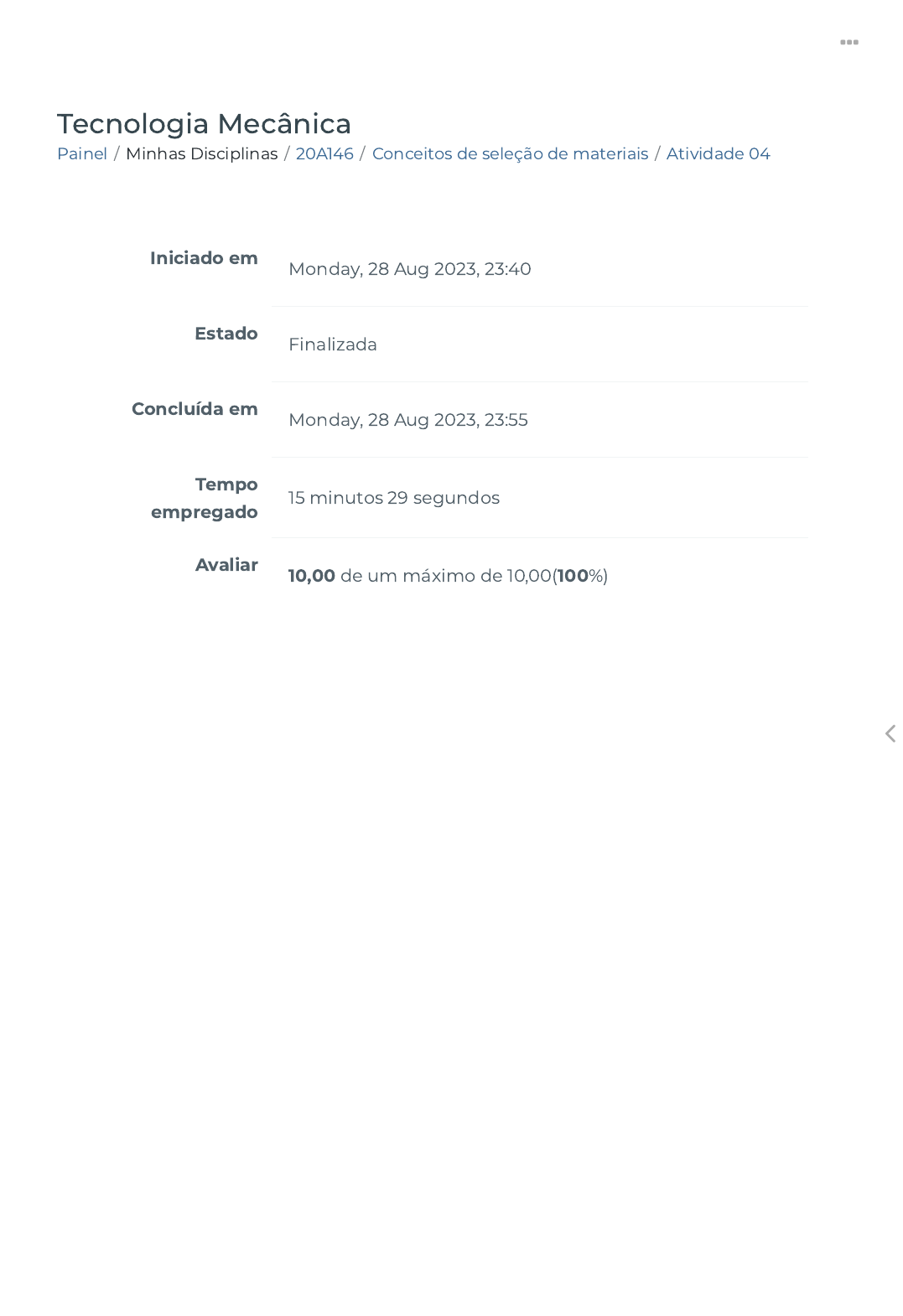 29/08/2023, 17:16 Atividade 04 https://ava.politecnicabr.com.br/mod/quiz/review.php?attempt=5500387 1/8 Painel / Minhas Disciplinas / 20A146 / Conceitos de seleção de materiais / Atividade 04 Tecnologia Mecânica Iniciado em Monday, 28 Aug 2023, 23:40 Estado Finalizada Concluída em Monday, 28 Aug 2023, 23:55 Tempo empregado 15 minutos 29 segundos Avaliar 10,00 de um máximo de 10,00(100%) https://ava.politecnicabr.com.br/my/ https://ava.politecnicabr.com.br/course/view.php?id=983 https://ava.politecnicabr.com.br/course/view.php?id=983#section-5 https://ava.politecnicabr.com.br/mod/quiz/view.php?id=34860 https://ava.politecnicabr.com.br/ 29/08/2023, 17:16 Atividade 04 https://ava.politecnicabr.com.br/mod/quiz/review.php?attempt=5500387 2/8 Questão 1 Correto Atingiu 2,00 de 2,00 Se tratando de um projeto, precisamos de informações referentes a esses mate-riais, sendo que estas estão relacionadas a suas propriedades que são geralmente obtidas a partir de análises estatísticas de dados referentes a ensaios, nos dando valores admissíveis para cada material. Marque a opção que não faz parte de uma das Propriedades mecânicas. Escolha uma opção: a. Densidade b. Tenacidade c. Limite de escoamento d. Plasticidade e. Resistência à tração https://ava.politecnicabr.com.br/ 29/08/2023, 17:16 Atividade 04 https://ava.politecnicabr.com.br/mod/quiz/review.php?attempt=5500387 3/8 Questão 2 Correto Atingiu 1,50 de 1,50 Em relação às etapas do processo de seleção de materiais, assinale a alternativa correta. Escolha uma opção: a. A classi�cação é uma etapa de dedução e aplicação de limites nos requisitos associados às restrições. b. A documentação não explora os aspectos relacionados a experiências anteriores dos materiais candidatos. c. O diagrama de propriedades não é mais utilizado na seleção de materiais. d. Na tradução, são feitas de�nições dos requisitos do projeto (função, restrição, objetivos e variáveis livres). e. A triagem é a etapa em que ocorrerá a procura dos materiais que maximizem o desempenho por meio dos índices de materiais. https://ava.politecnicabr.com.br/ 29/08/2023, 17:16 Atividade 04 https://ava.politecnicabr.com.br/mod/quiz/review.php?attempt=5500387 4/8 Questão 3 Correto Atingiu 1,50 de 1,50 Analise as a�rmativas a seguir e assinale a alternativa correta. I. Mesmo com o advento constante de diversos materiais e diversas aplicações, a escolha de um determinado material é apenas baseada em experiências anteriores bem-sucedidas. II. Materiais são os insumos de um determinado projeto, sendo que estes podem ser divididos nas seguintes famílias, se tratando de aplicações na engenharia: metais, polímeros, cerâmicas, elastômeros, vidros e híbridos. III. As propriedades dos materiais são essenciais na determinação do material adequado, sendo geralmente obtidas a partir de análises estatísticas de dados referentes à ensaios. Escolha uma opção: a. I e II são verdadeiras. b. II e III são verdadeiras. c. Apenas II é verdadeira. d. I e III são verdadeiras. e. I, II e III são verdadeiras. https://ava.politecnicabr.com.br/ 29/08/2023, 17:16 Atividade 04 https://ava.politecnicabr.com.br/mod/quiz/review.php?attempt=5500387 5/8 Questão 4 Correto Atingiu 2,00 de 2,00 Em relação aos custos de um processo de seleção de materiais, assinale a alternativa correta. Escolha uma opção: a. Quanto melhor for uma propriedade, possivelmente menor será o preço do material, porém, maiores serão os gastos com falhas. b. Quando se trata de aplicações em que o preço é determinante, as especi�cações técnicas dos materiais são os principais fatores a serem considerados e o preço aparece em segundo plano. c. O custo de um material está relacionado apenas ao valor de cada material e à quantidade. d. Quanto maior o conhecimento de um determinado material, maior serão os gastos com estudos referentes a ele. e. A disponibilidade de um material está relacionada à facilidade de obtenção de um material, à necessidade de importação, ao prazo de entrega, à quantidade mínima de compra, à existência de estoques, etc. https://ava.politecnicabr.com.br/ 29/08/2023, 17:16 Atividade 04 https://ava.politecnicabr.com.br/mod/quiz/review.php?attempt=5500387 6/8 Questão 5 Correto Atingiu 1,50 de 1,50 Dadas as seguintes propriedades mecânicas dos materiais, associe-as com seus respectivos conceitos, assinalando a alternativa que apresenta a sequência correta. I. Resistência à tração. II. Resistência à fadiga. III. Resistência ao desgaste. IV. Dureza. ( ) Capacidade de um material suportar os efeitos provocados pelo deslizamentos de duas superfícies (uma contra a outra). ( ) Capacidade de um material suportar carregamentos cíclicos. ( ) Máxima tensão que um material pode suportar ao ser esticado ou puxado antes de falhar ou quebrar. ( ) Propriedade que permite um material resistir à deformação plástica. Escolha uma opção: a. II, III, IV, I. b. III, II, I, IV. c. III, II, IV, I. d. II, IV, I, III. e. II, III, I, IV https://ava.politecnicabr.com.br/ 29/08/2023, 17:16 Atividade 04 https://ava.politecnicabr.com.br/mod/quiz/review.php?attempt=5500387 7/8 Questão 6 Correto Atingiu 1,50 de 1,50 O que é difusidade térmica? Escolha uma opção: a. Propriedade que descreve o quão rapidamente um material reage às mudanças de temperatura. b. Quantidade de calor transmitida por unidade de tempo por meio de uma área de um material sob um gradiente de temperatura. c. Deformação térmica por grau de mudança de temperatura. d. Máxima diferença de temperatura em que um dado material pode ser resfriado com água sem danos. e. Relação entre a quantidade de calor fornecida e a variação de temperatura. Entre em Contato https://www.politecnicabr.com.br 0800 084 2627 0800 084 2627 Links Úteis Dicas da nossa Diretora Acadêmica Planner de Estudos Declaração de Matrícula Orientações do AVA Abertura de 